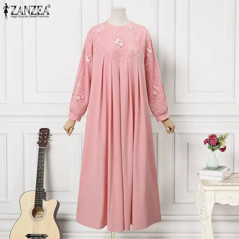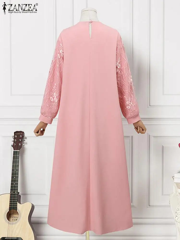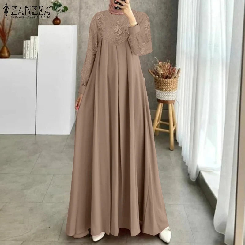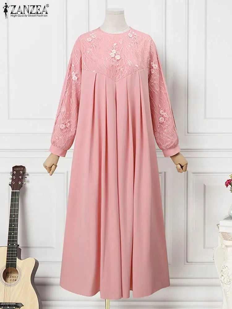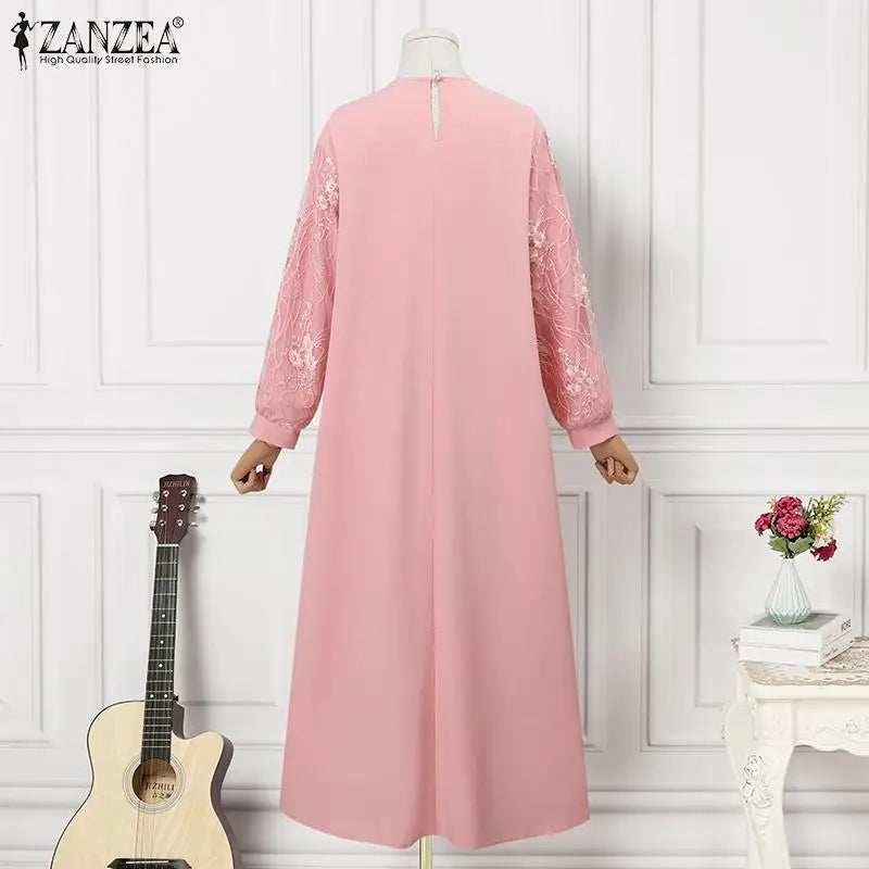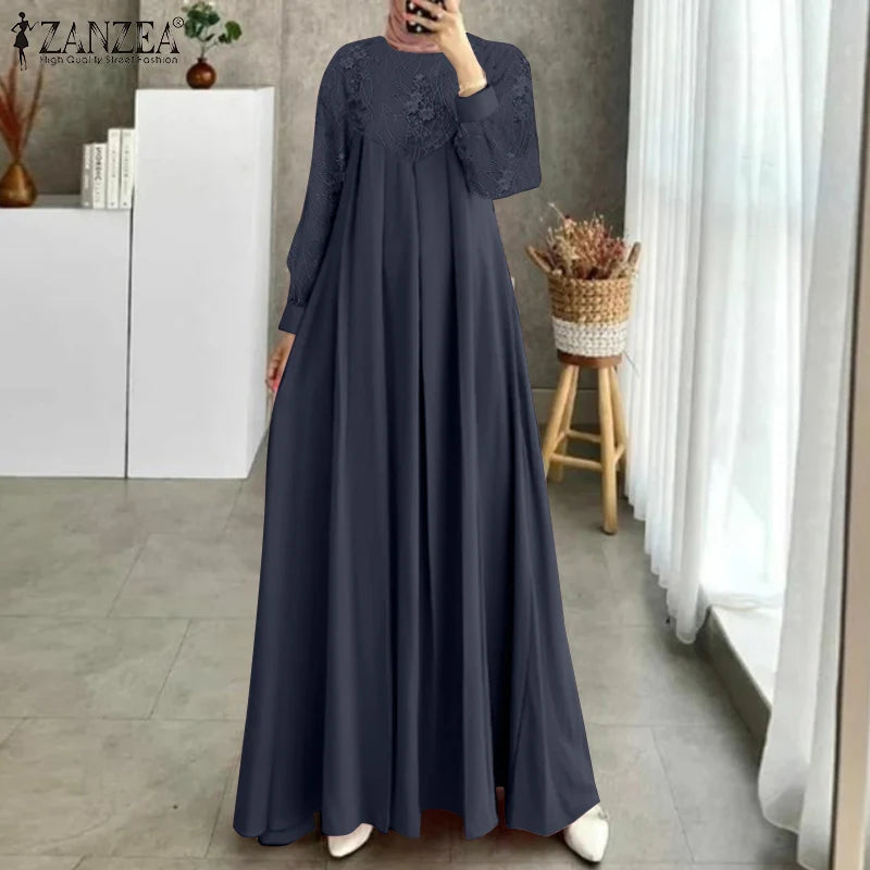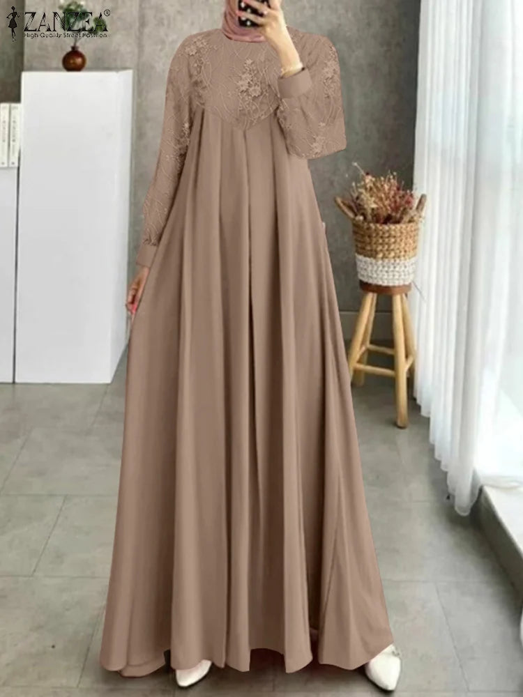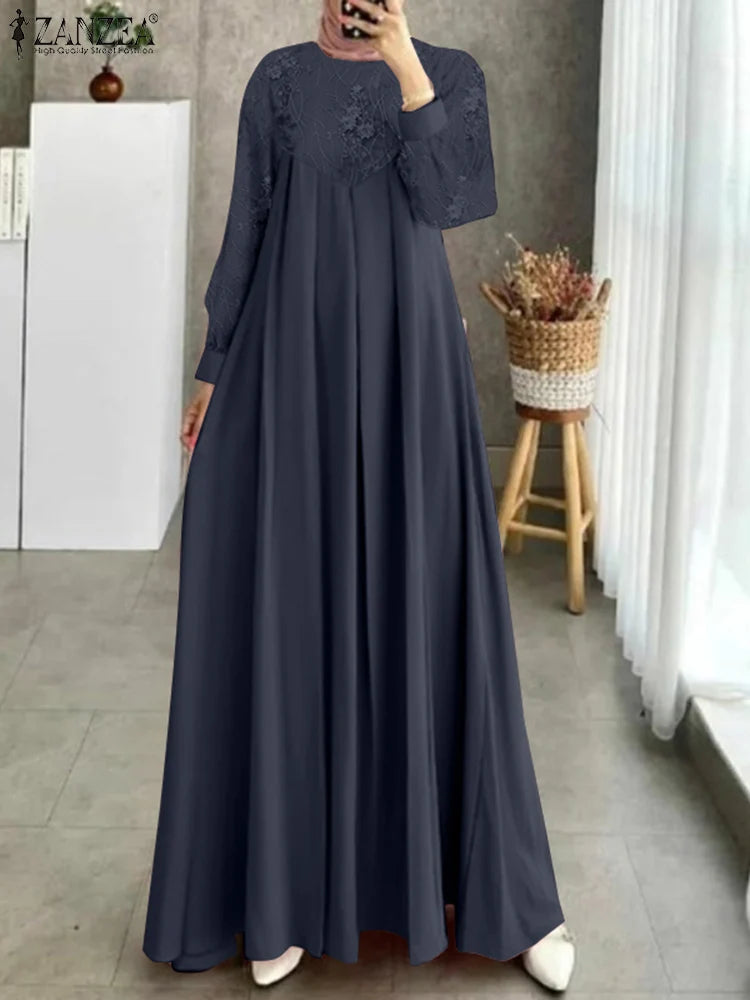 Autumn Muslim Fashion Long Dress ZANZEA Women Long Sleeve O Neck Vestidos Dubai Kaftan Maxi Sundress Robe Elegant Lace Abaya