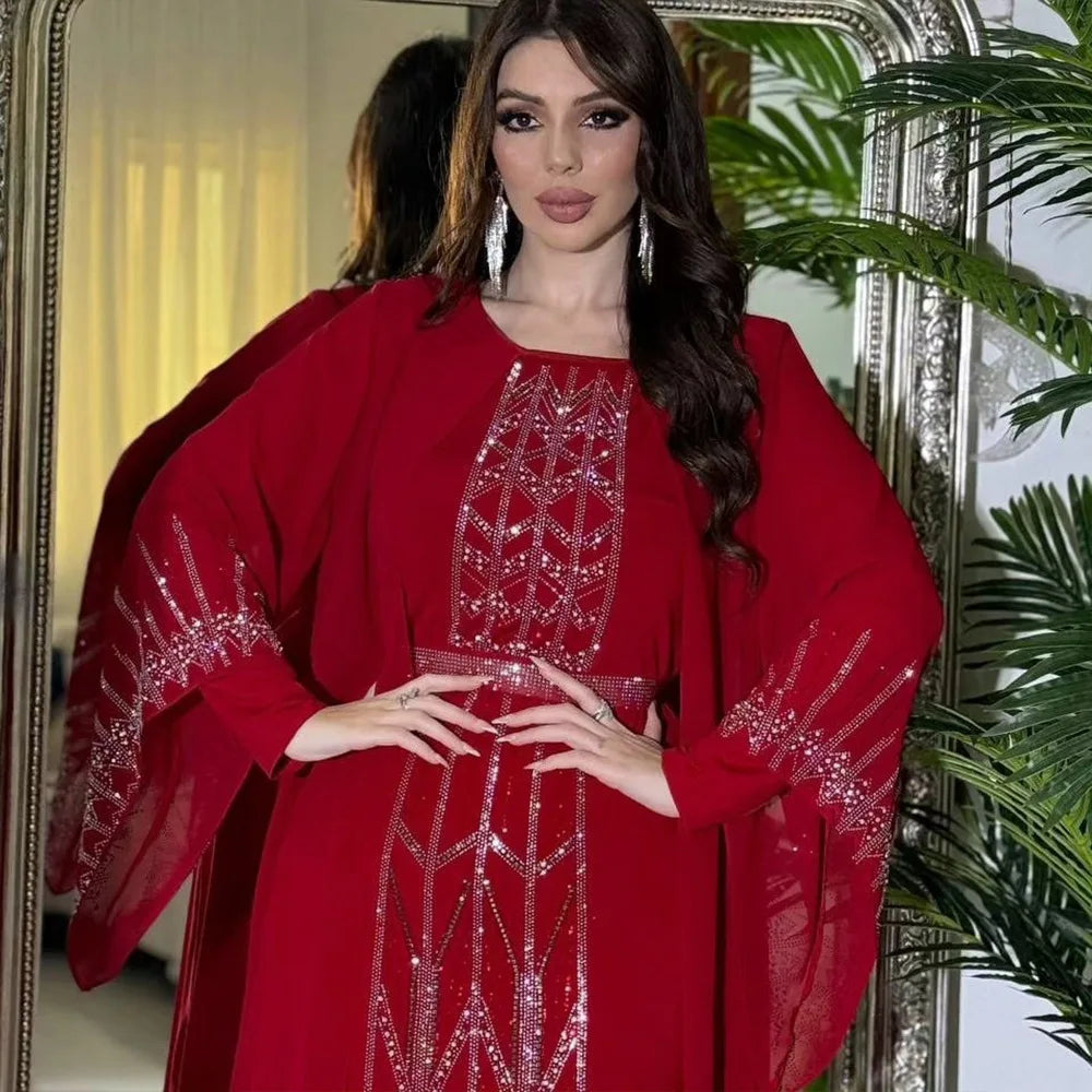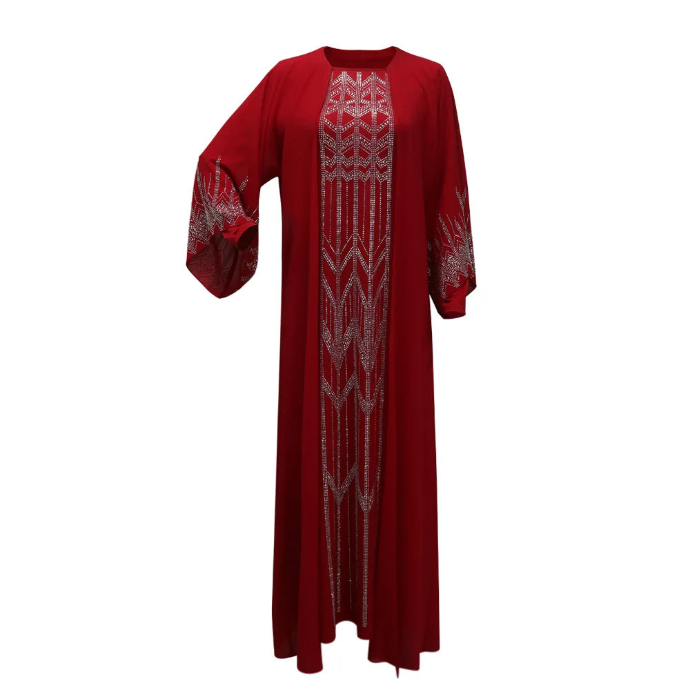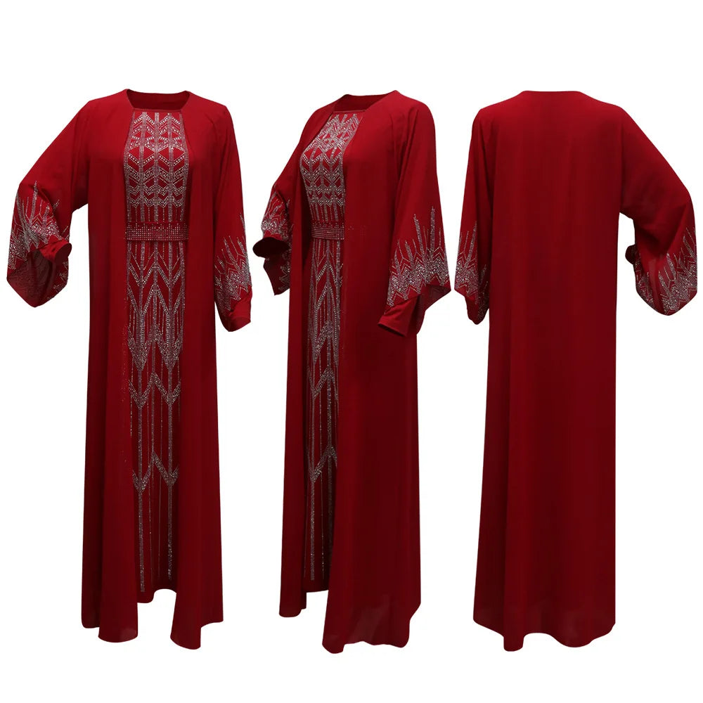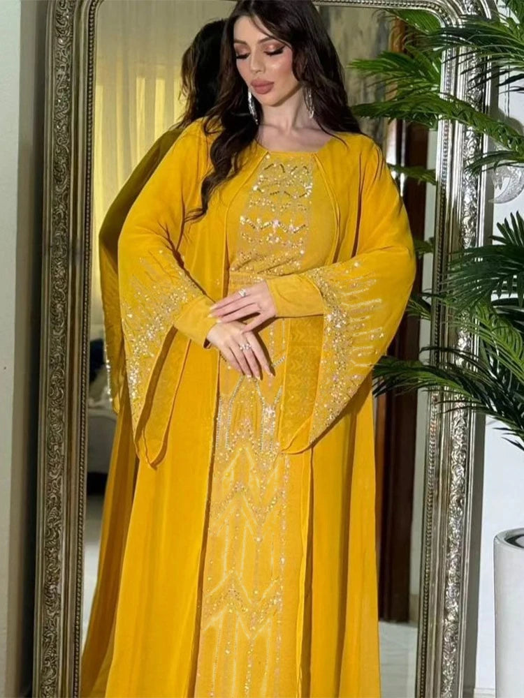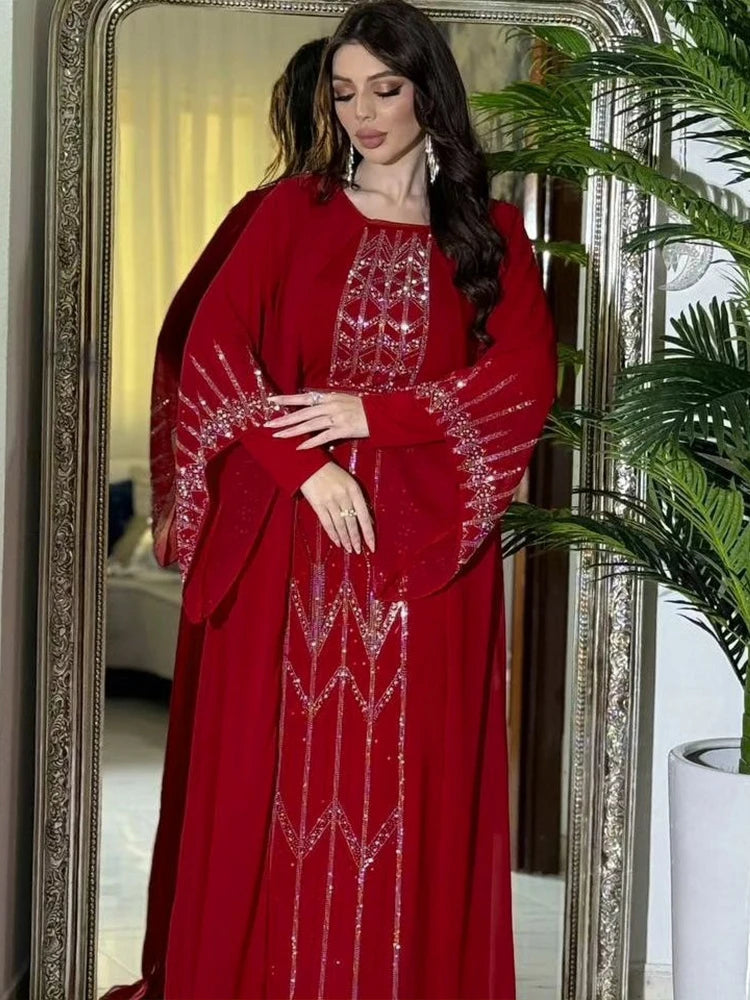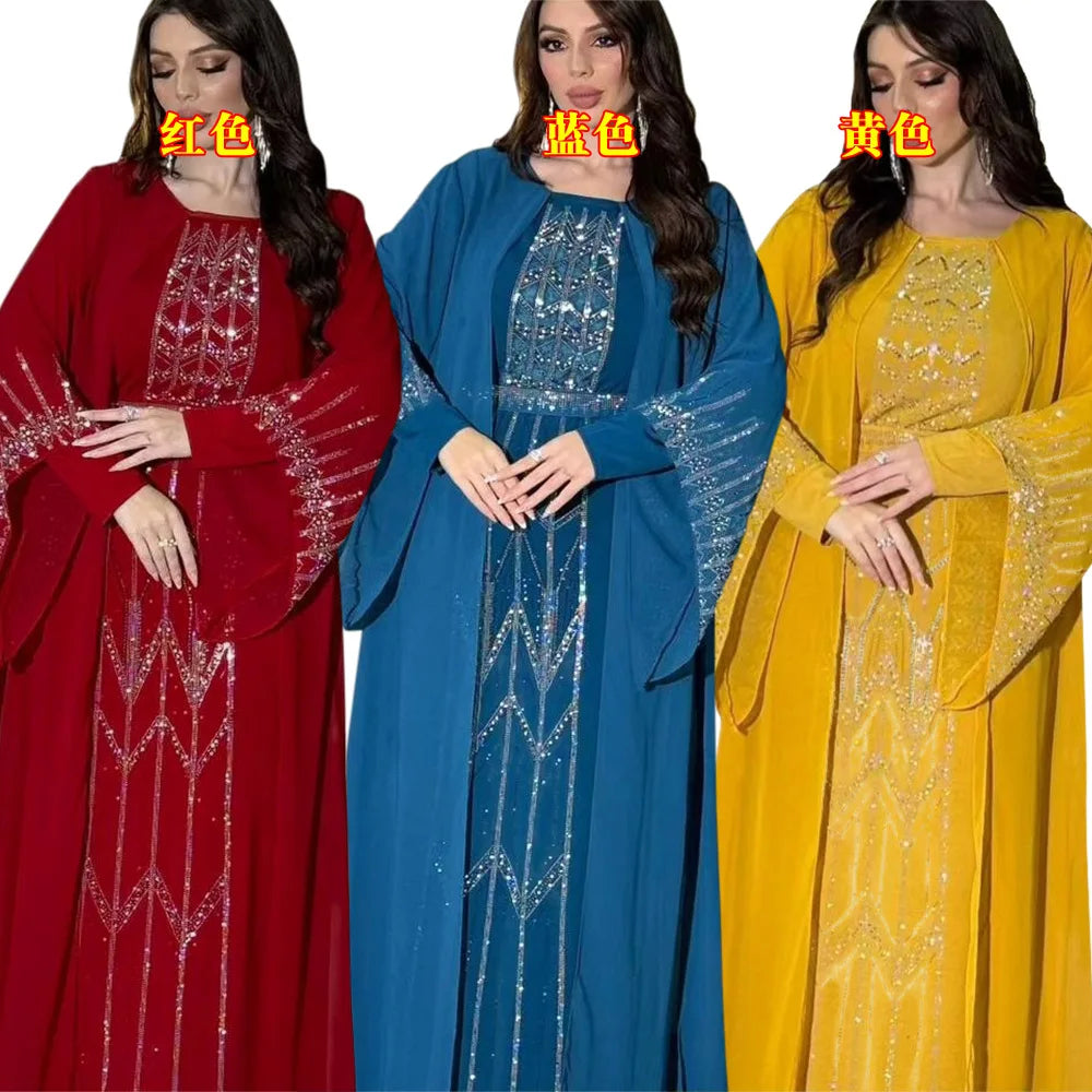 Eid Muslim Party Dress for Women Fake 2 Piece Diamond Ramadan Abaya Belt Flare Sleeve Kaftan Vestidos Largos Dubai Robe Jalabiya