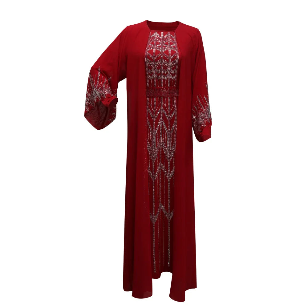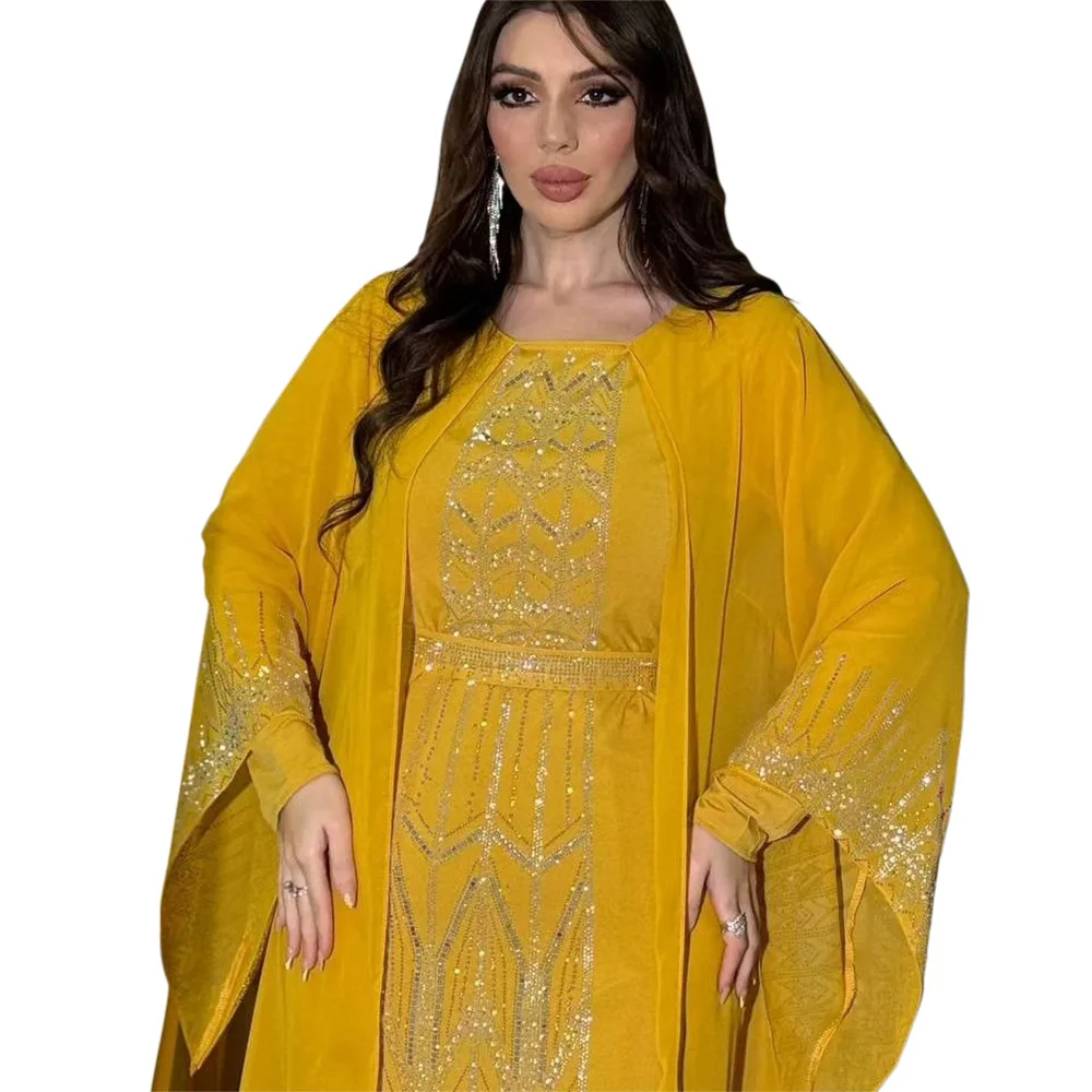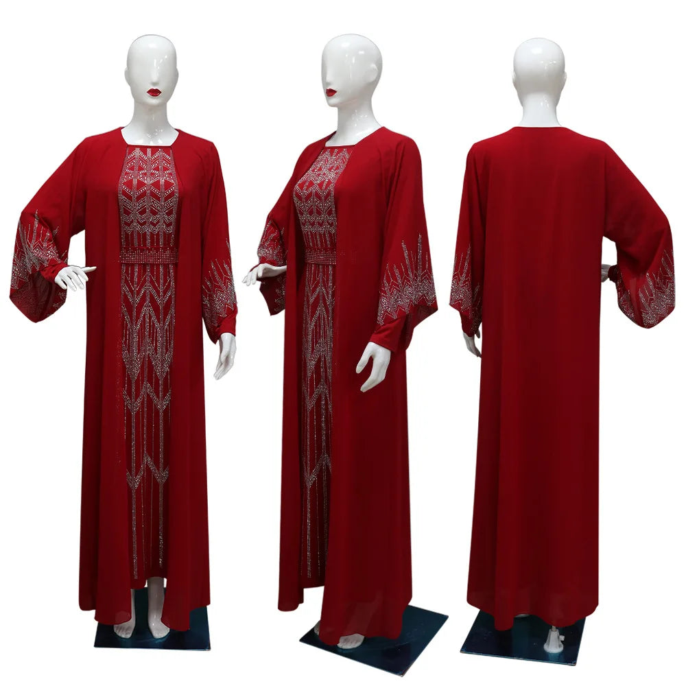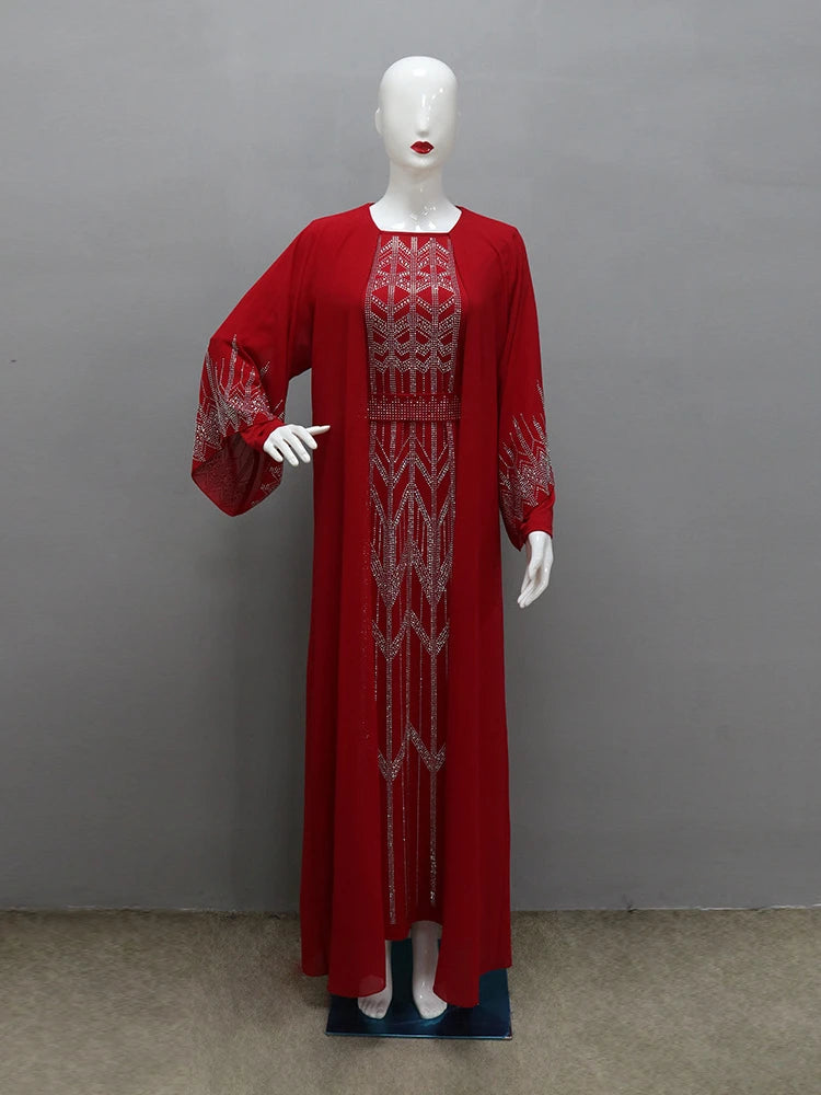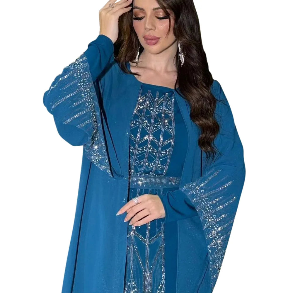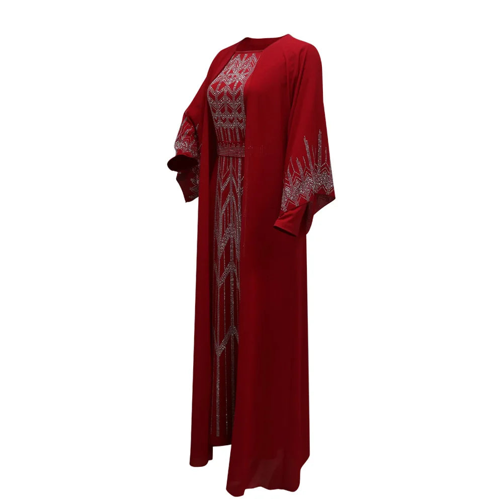 Eid Muslim Party Dress for Women Fake 2 Piece Diamond Ramadan Abaya Belt Flare Sleeve Kaftan Vestidos Largos Dubai Robe Jalabiya