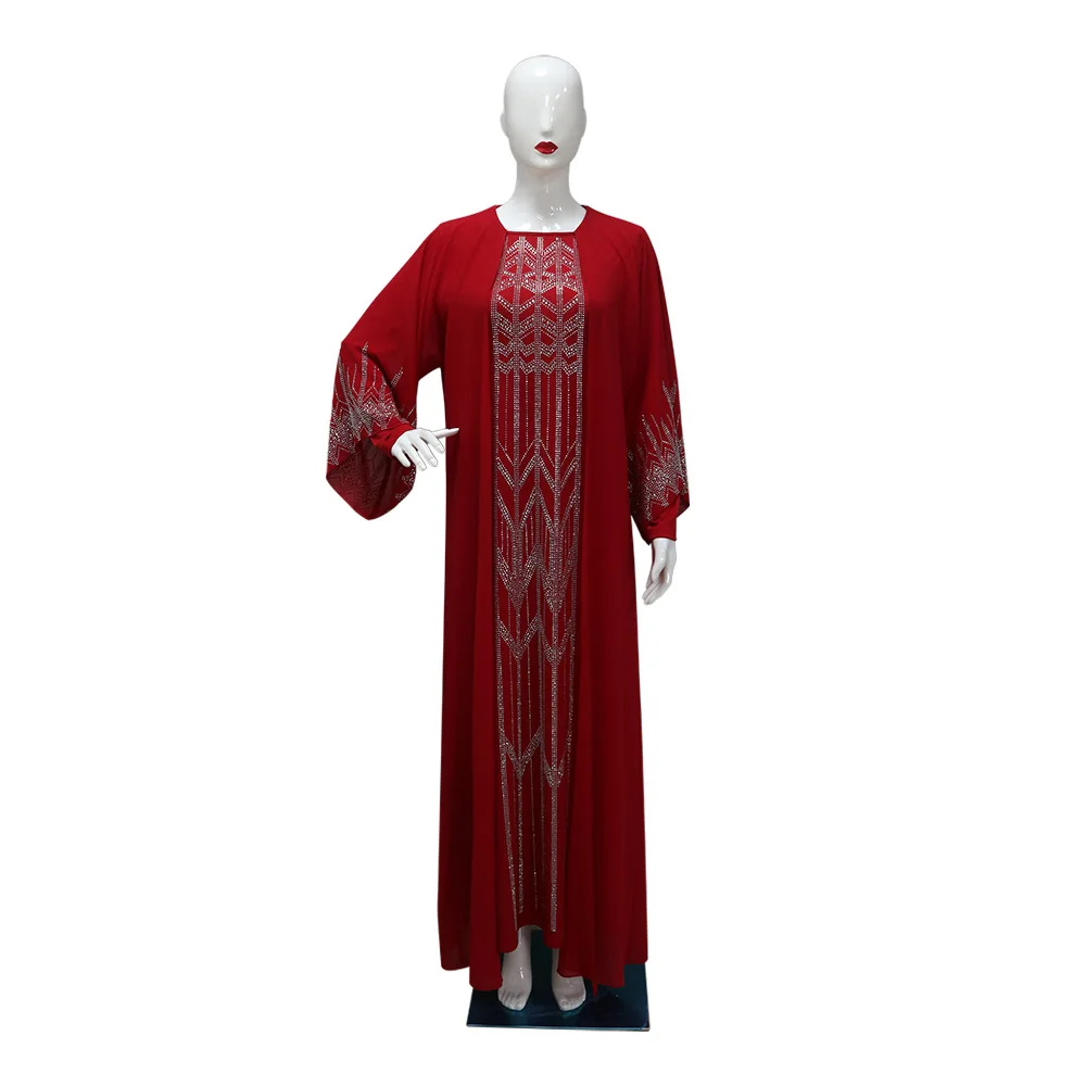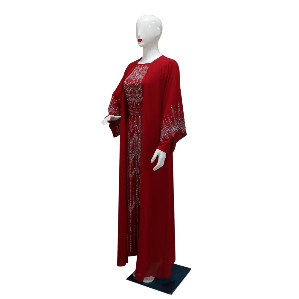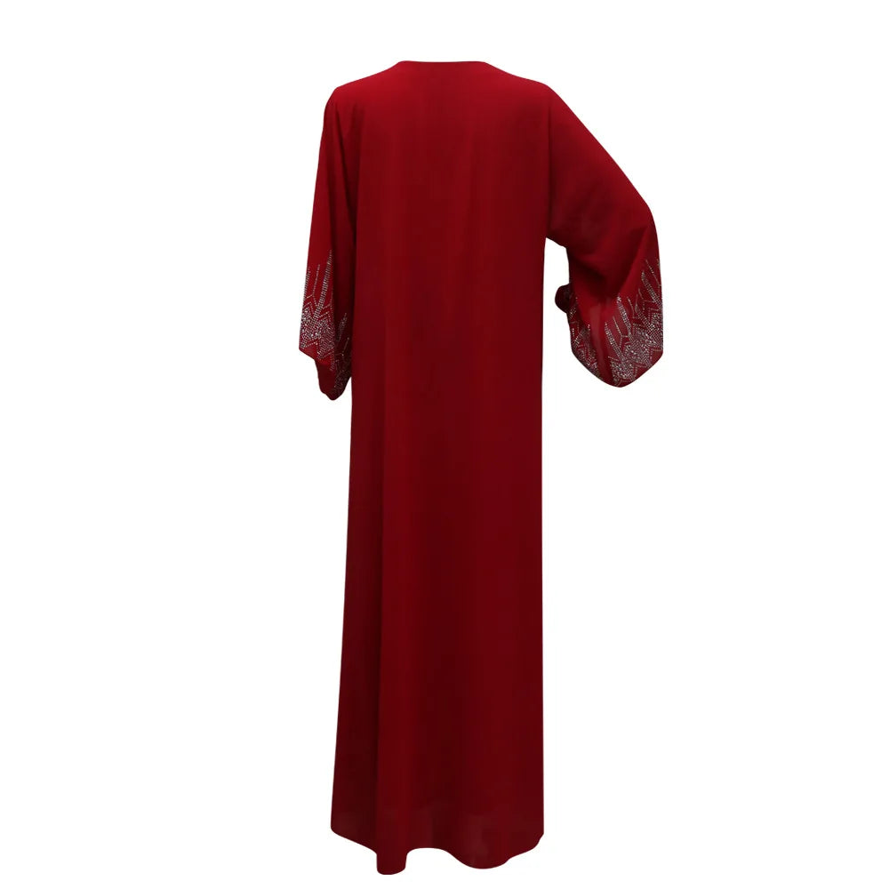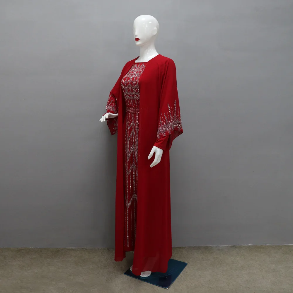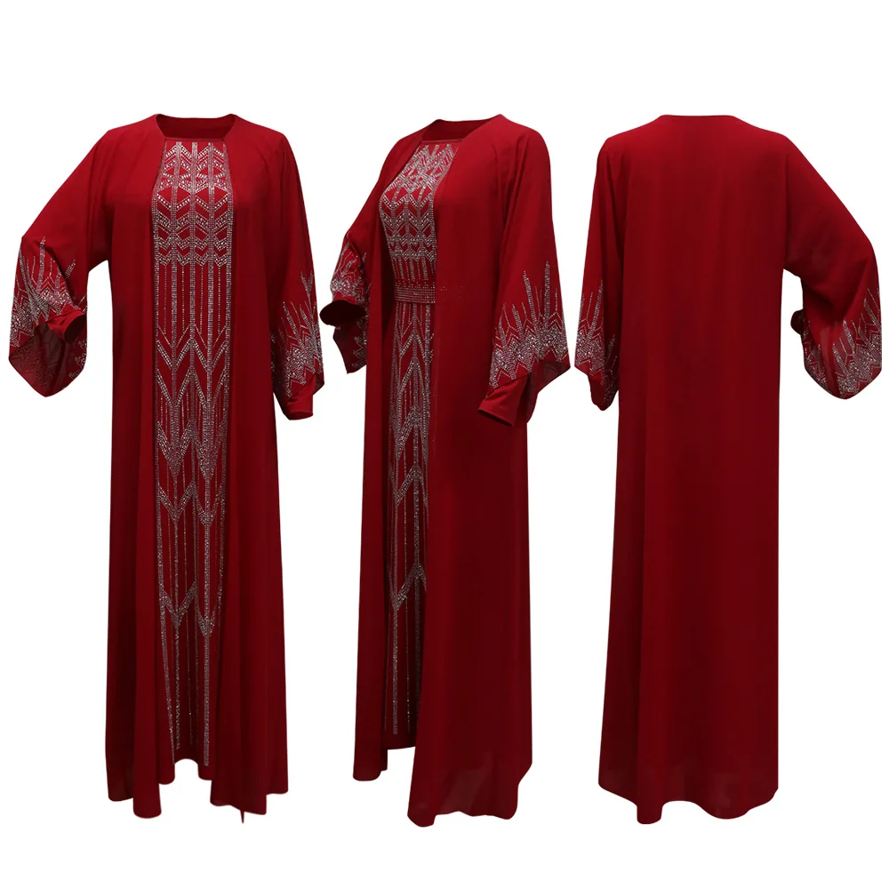Eid Muslim Party Dress for Women Fake 2 Piece Diamond Ramadan Abaya Belt Flare Sleeve Kaftan Vestidos Largos Dubai Robe Jalabiya
