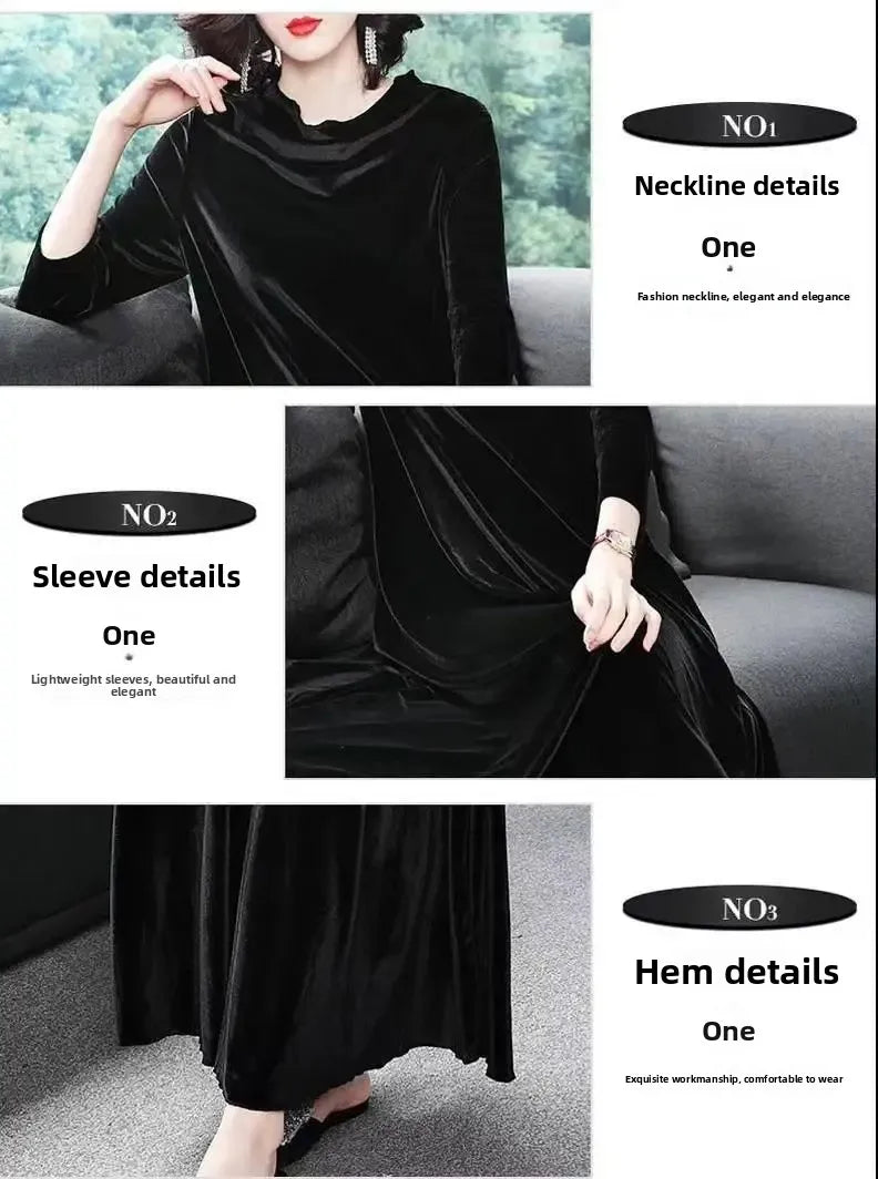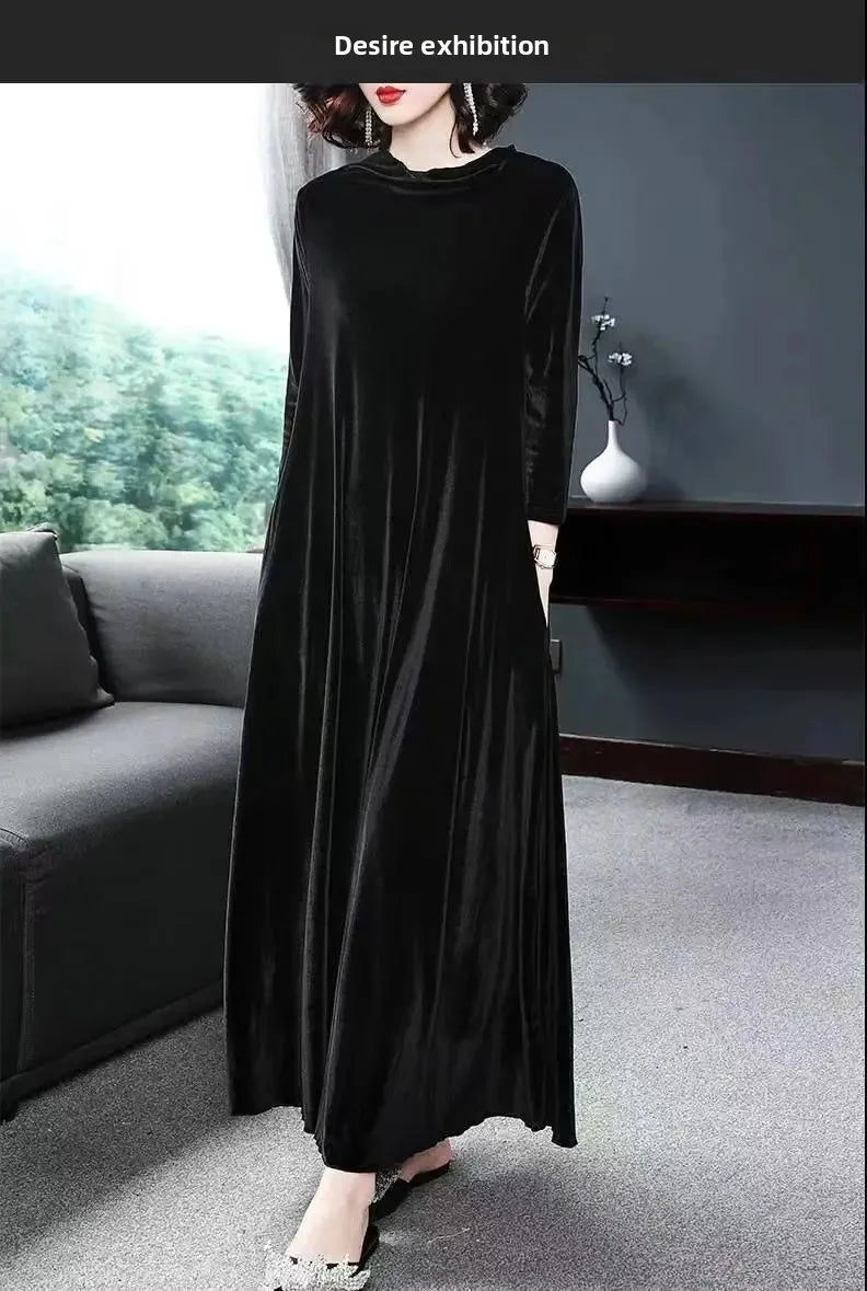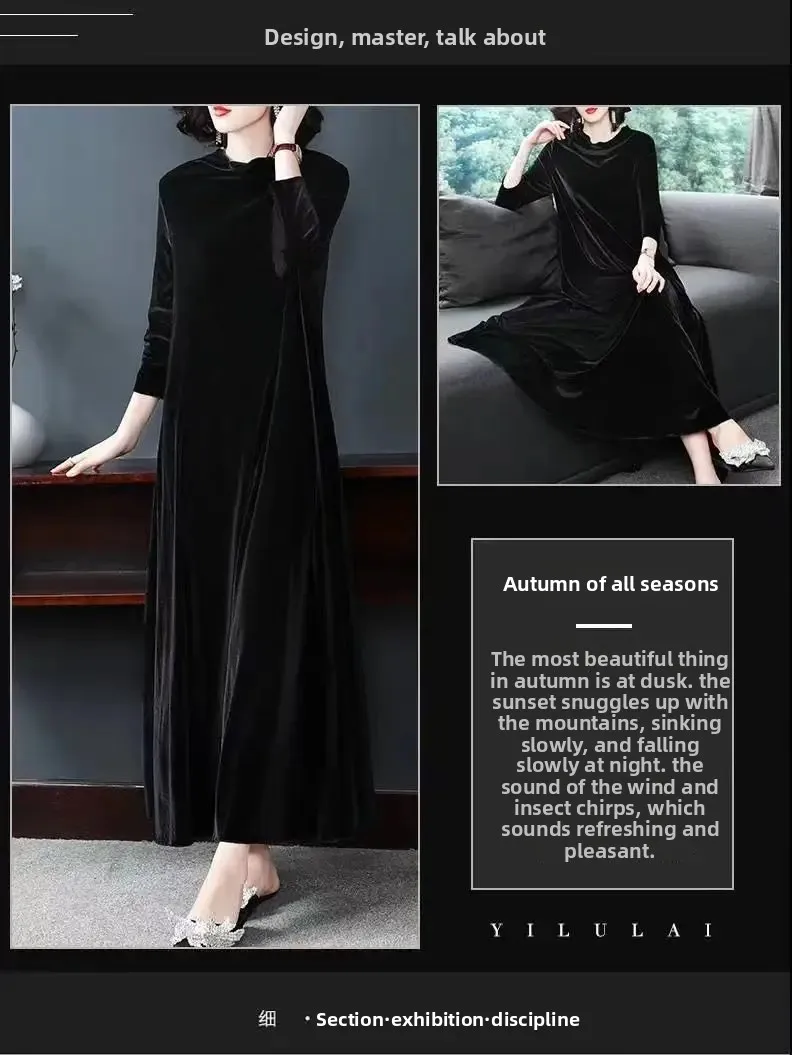 Elegant Long Sleeve Velvet Dress Autumn Spring New Style Puffy Collar Slimming Tummy Covering Mid-Length Gown Princess Sleeve