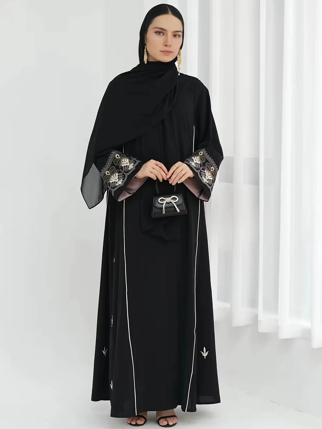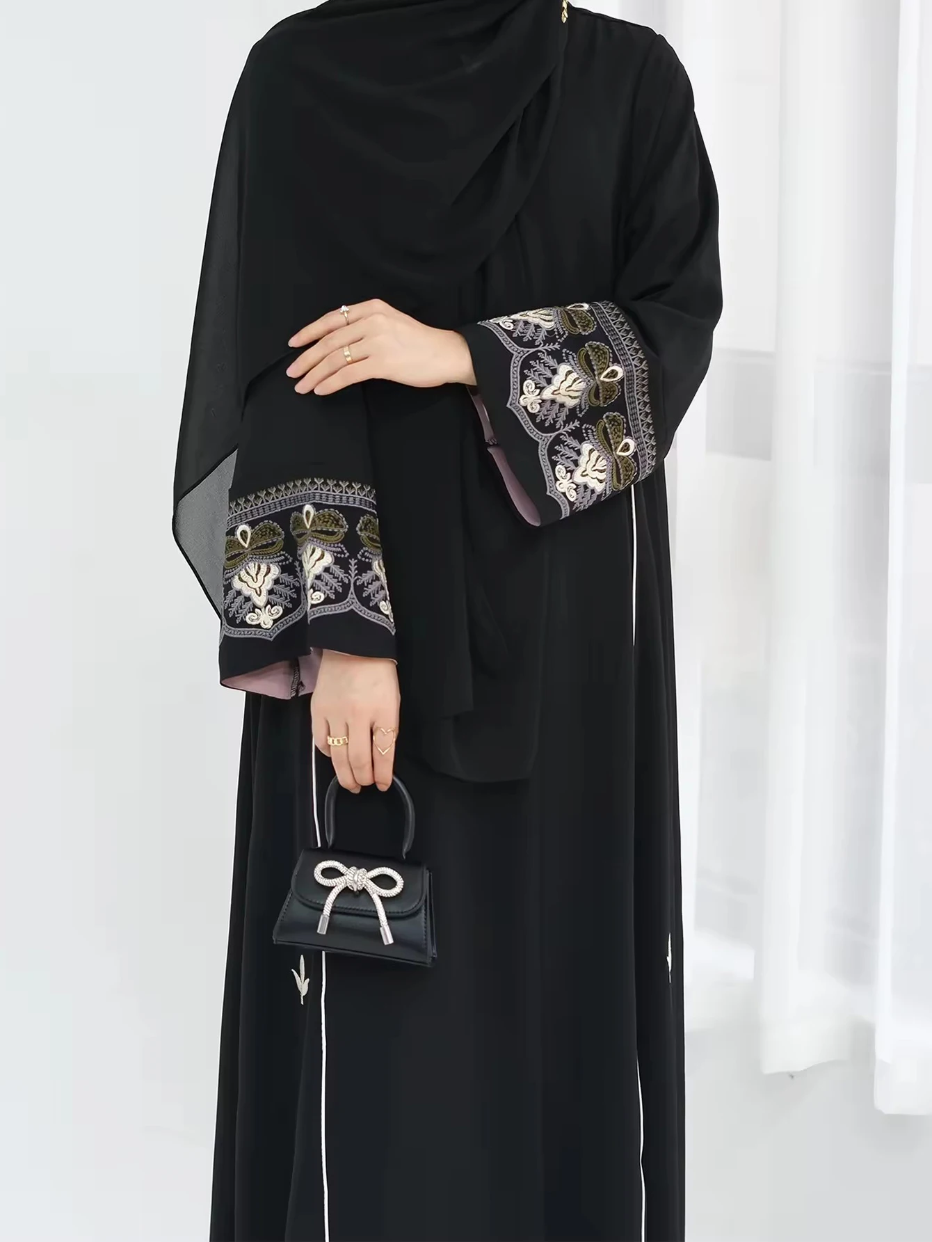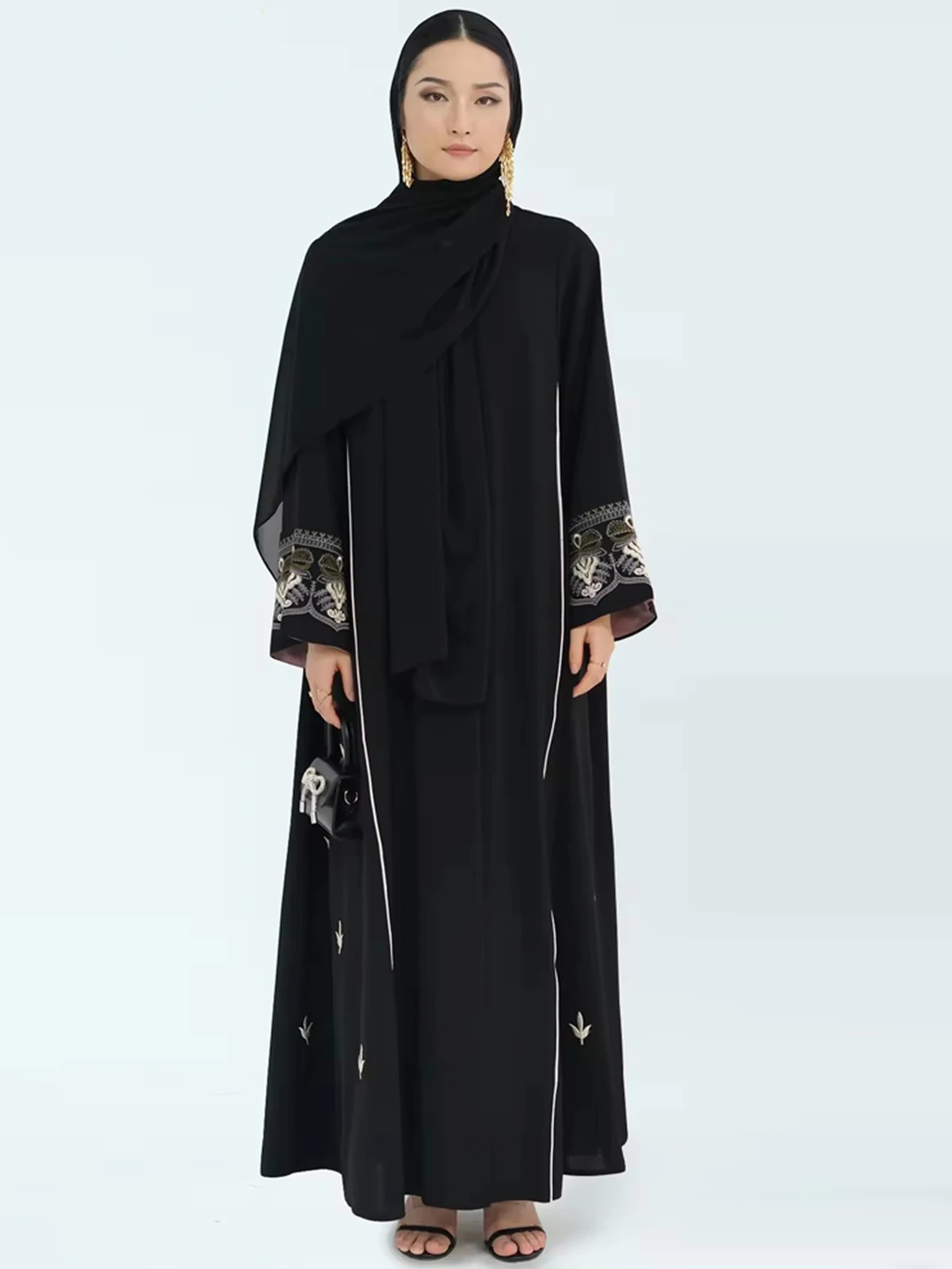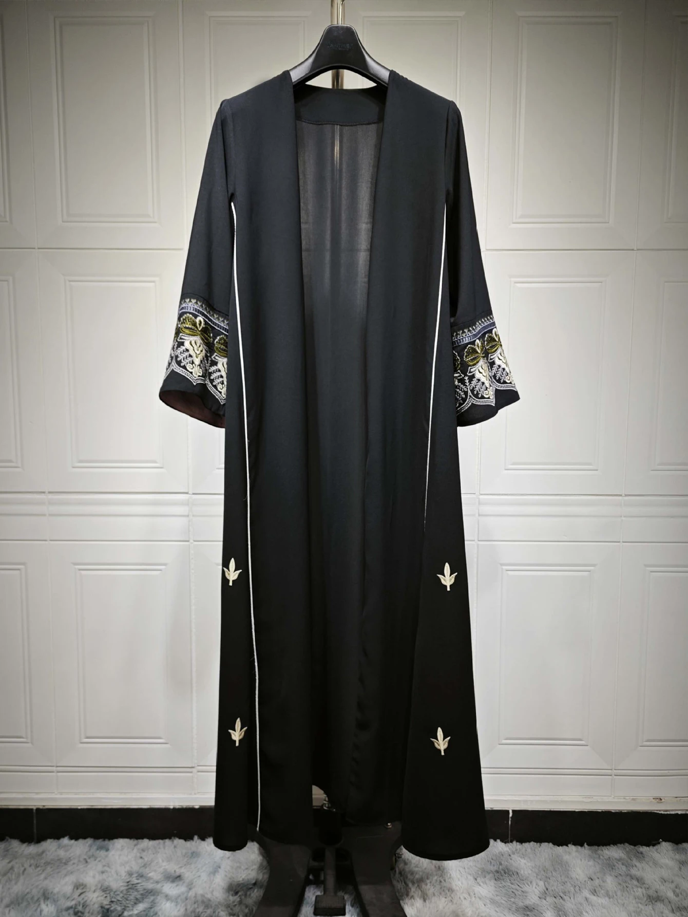 Middle East Style Muslim Kaftan Black Fabric Embroidered Sleeve Design White Line Accents for Gulf Region Modest Fashion Events