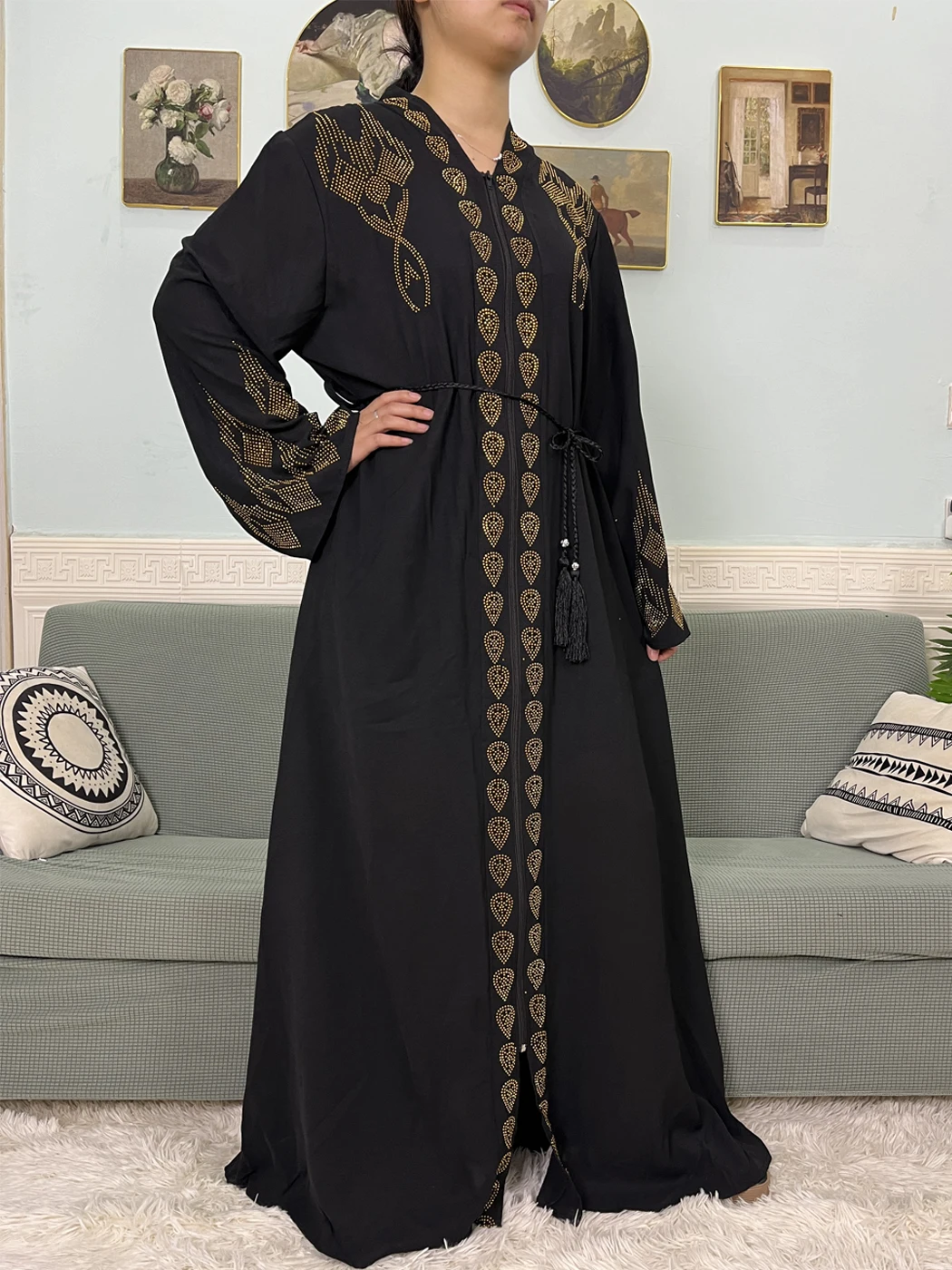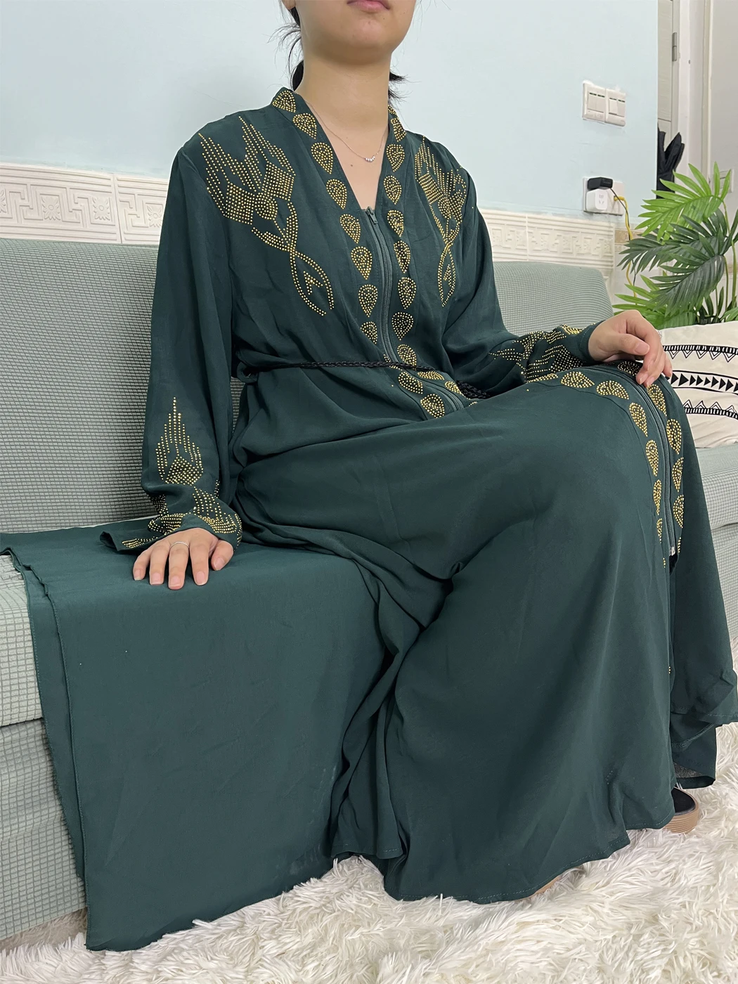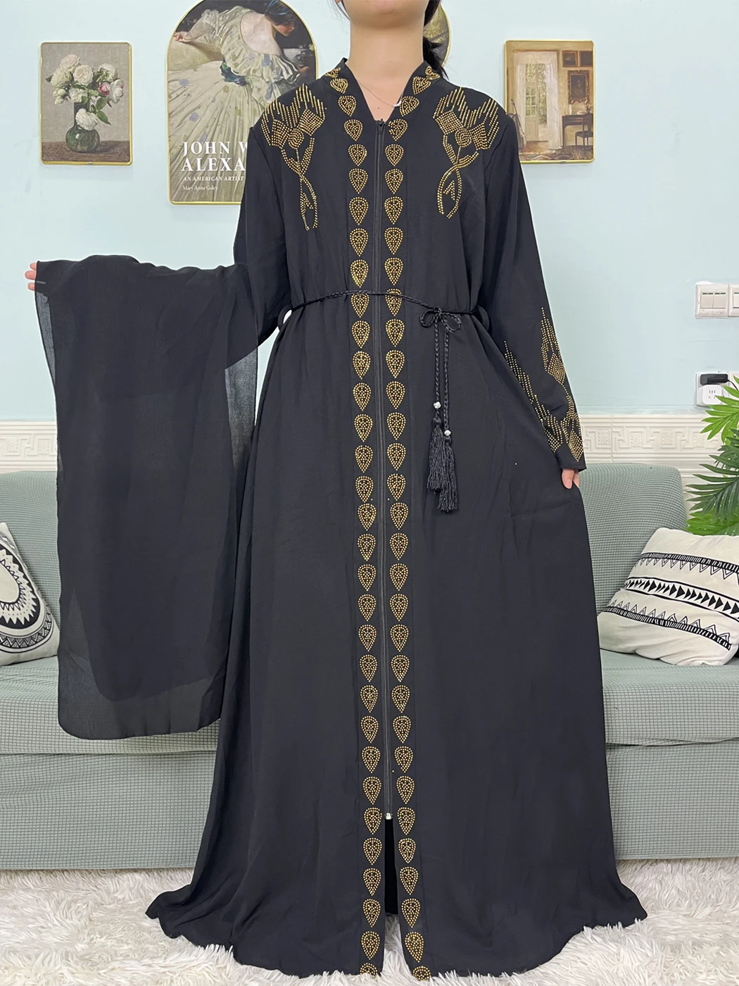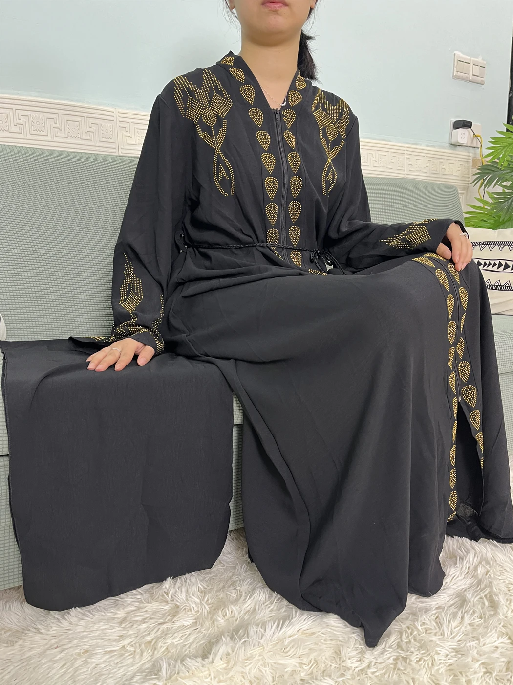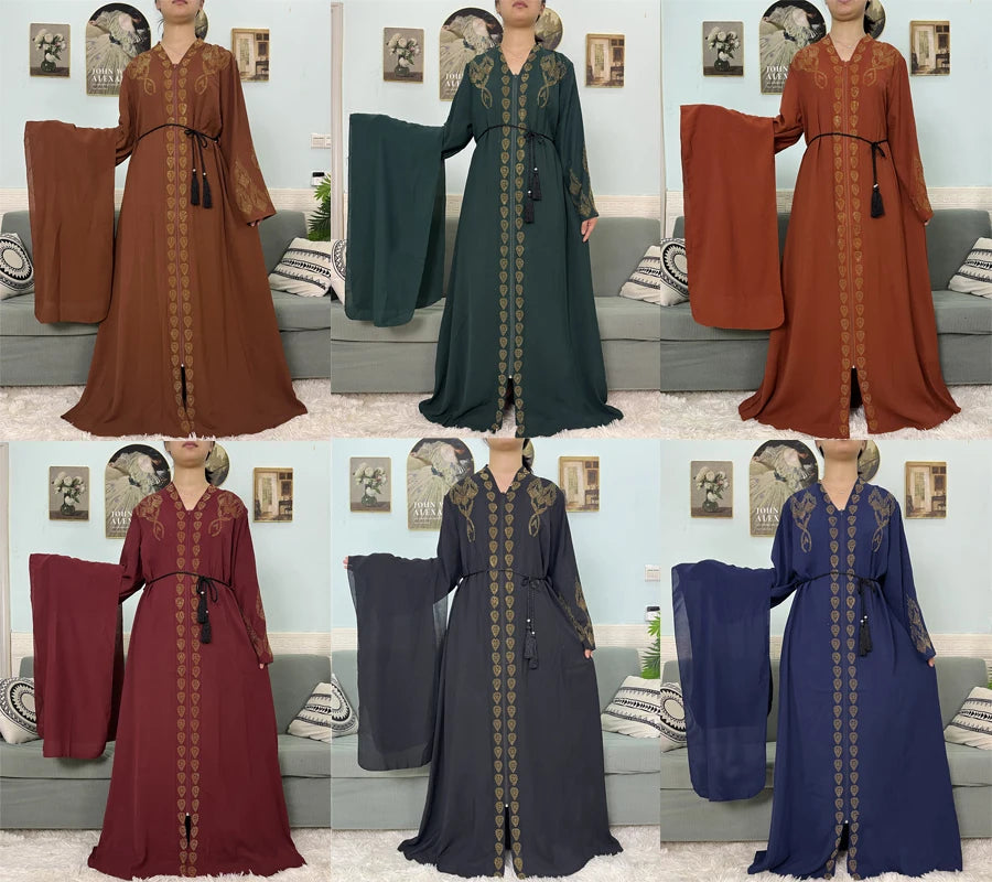 Muslim Open Abayas For Women 2024 Pure Chiffon Zipper Diamonds Loose Femme Robe Islam Dubai Boubou Moroccan Caftan With Turban