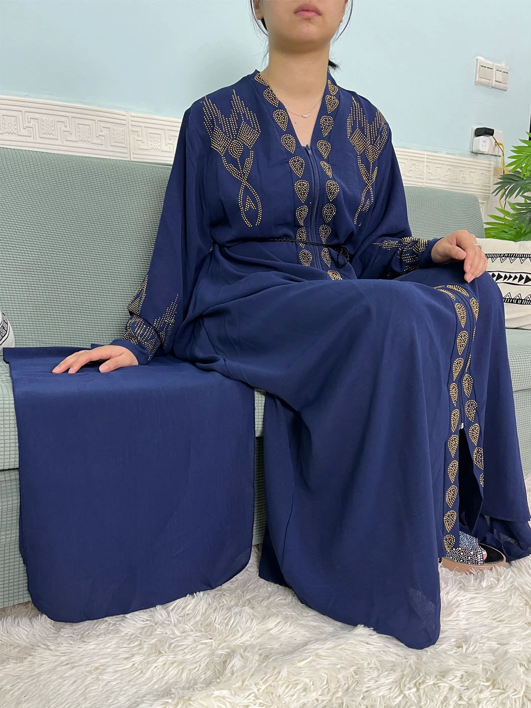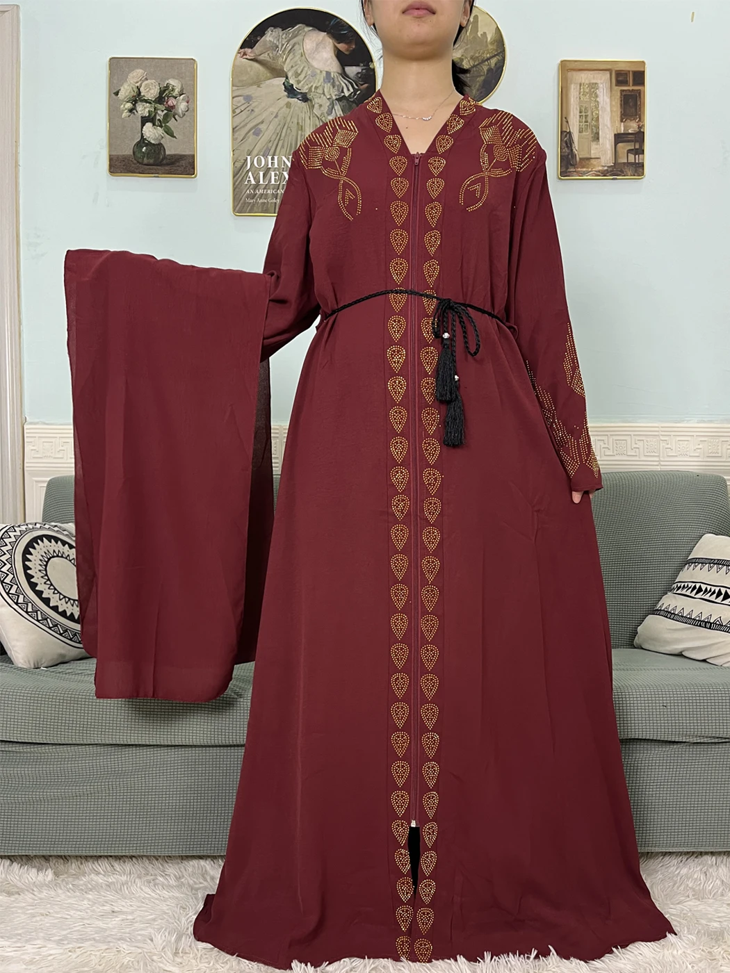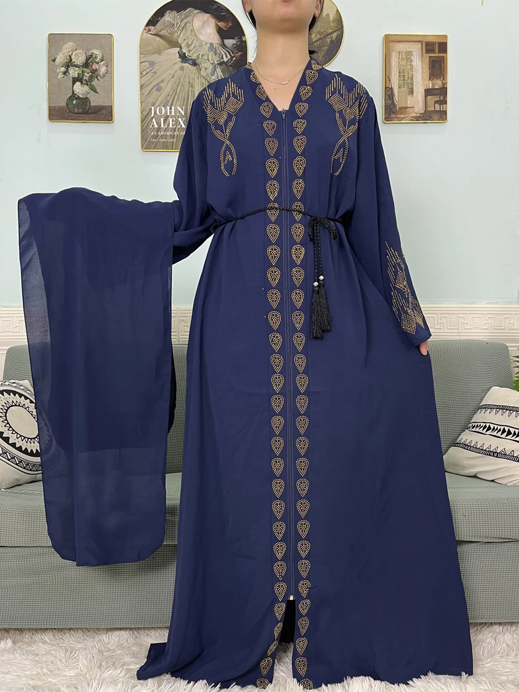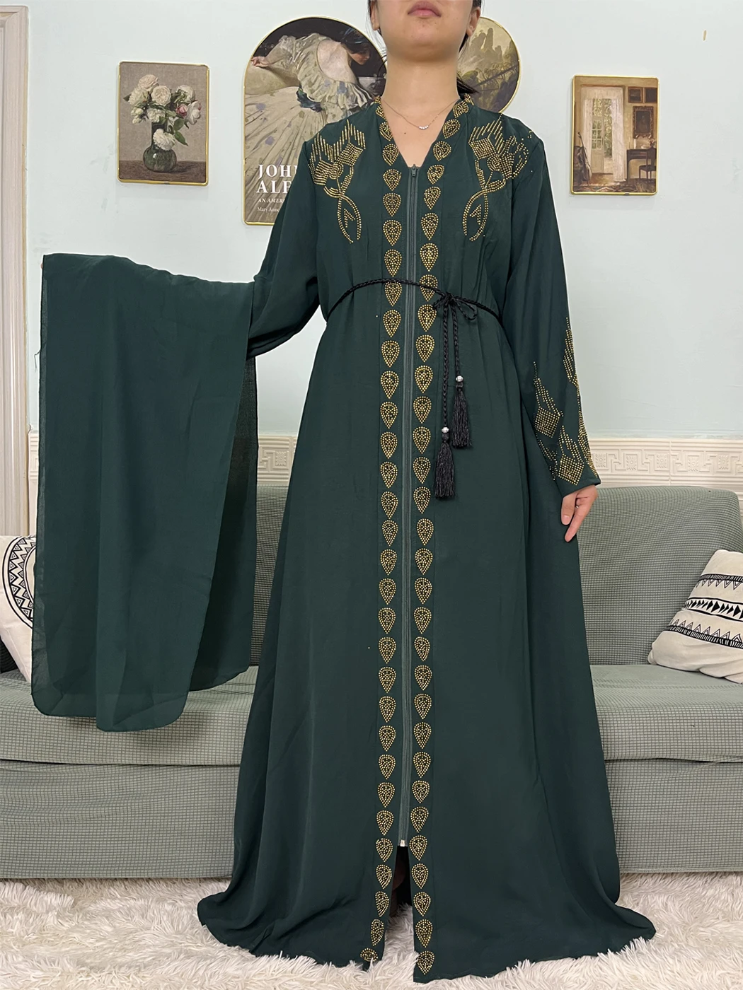 Muslim Open Abayas For Women 2024 Pure Chiffon Zipper Diamonds Loose Femme Robe Islam Dubai Boubou Moroccan Caftan With Turban