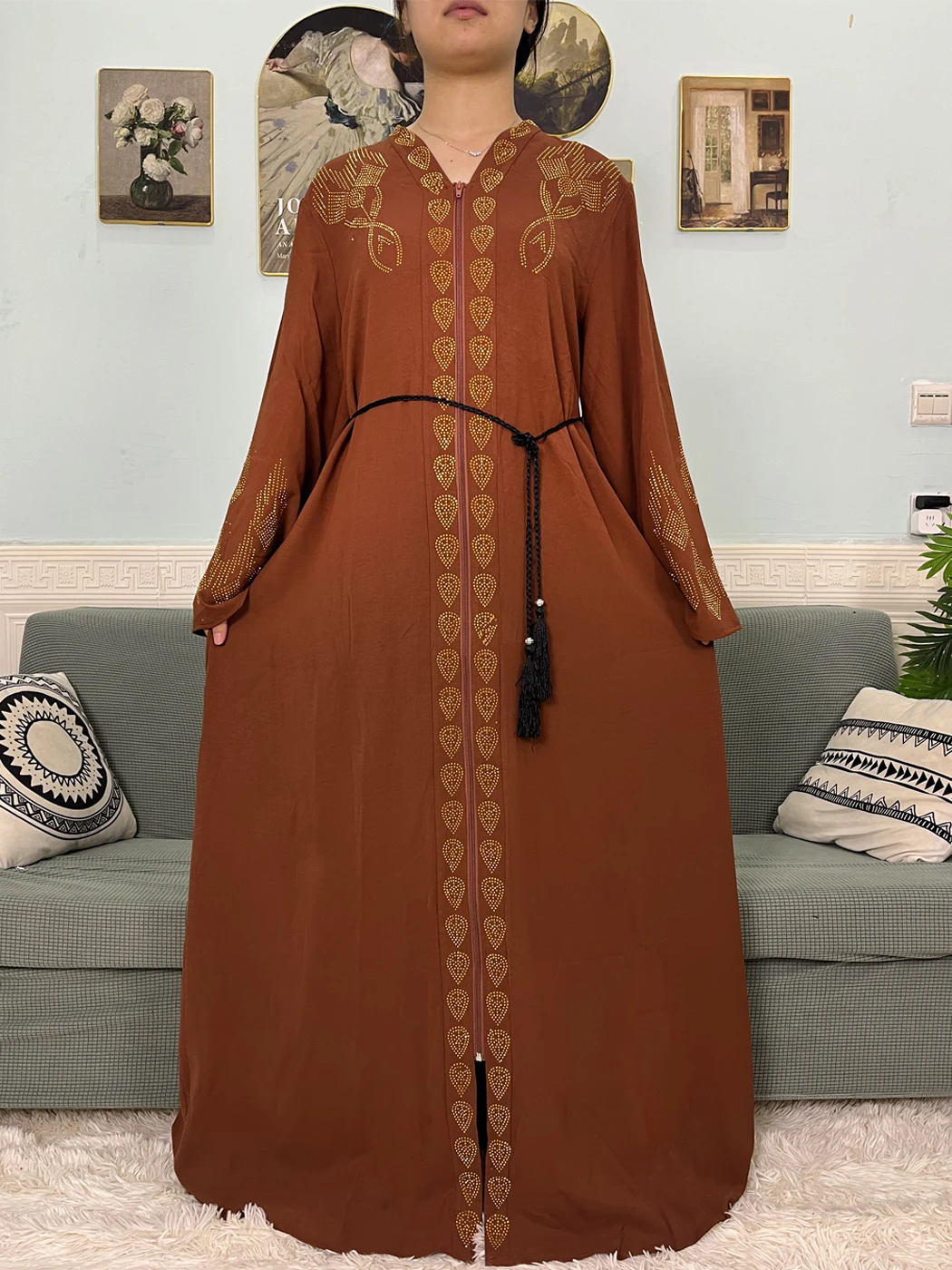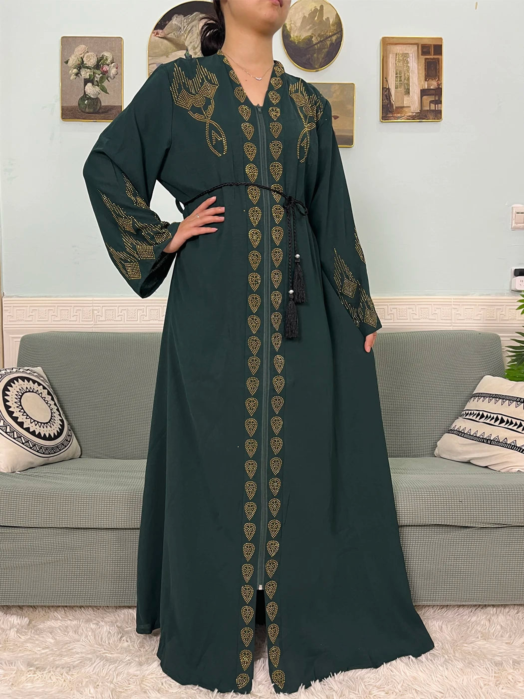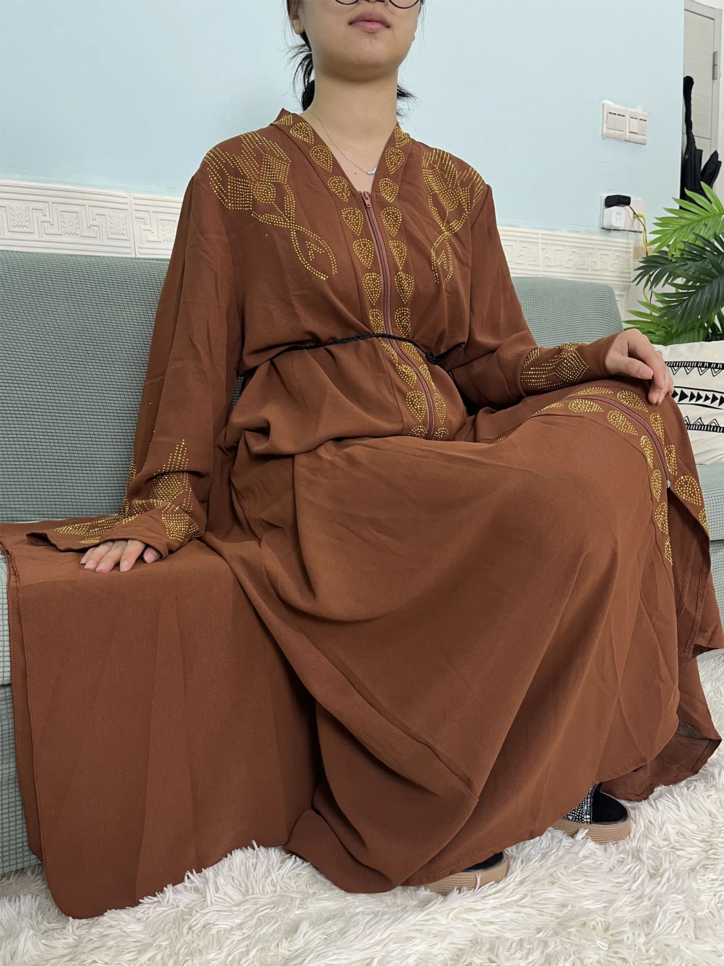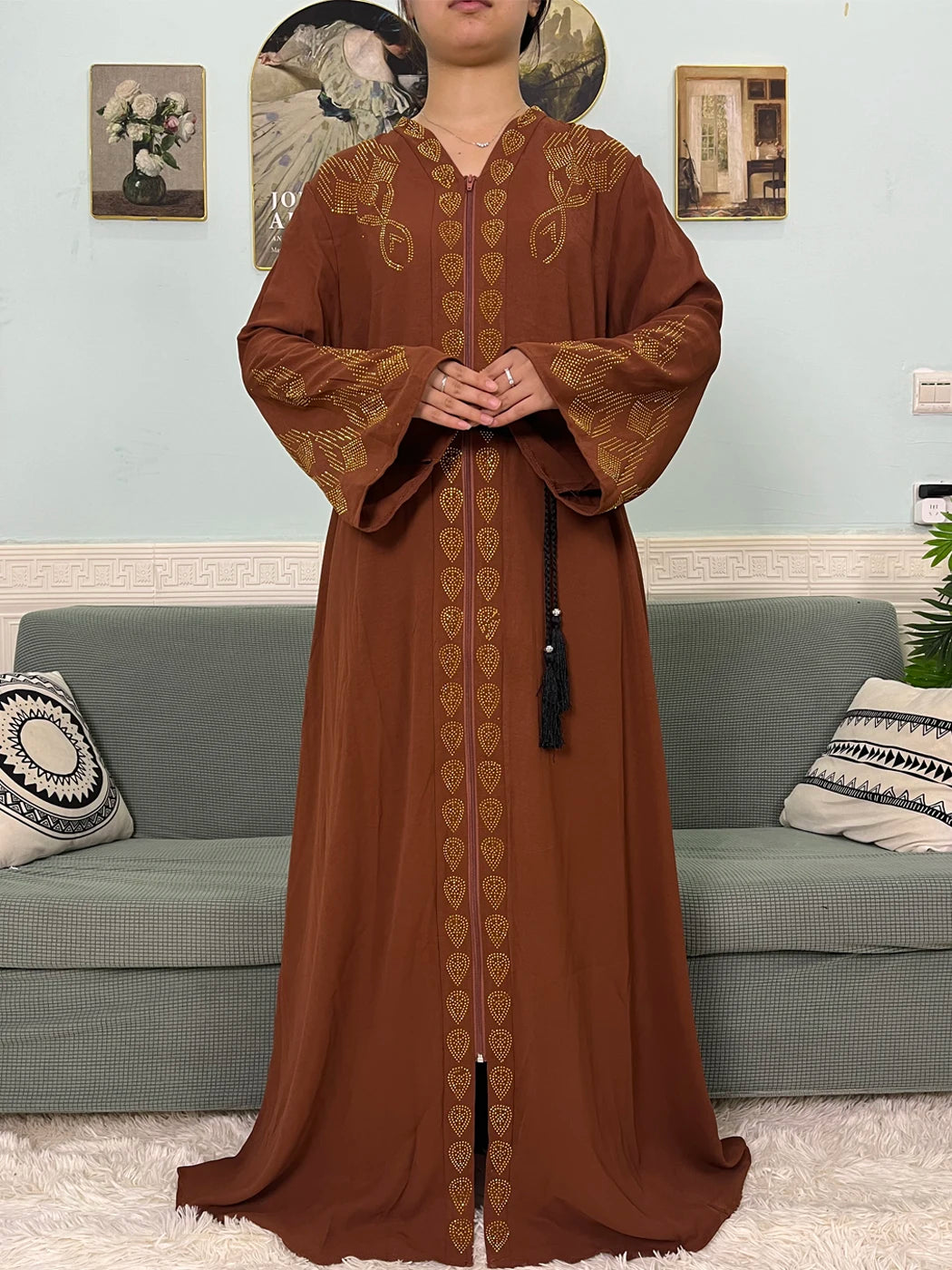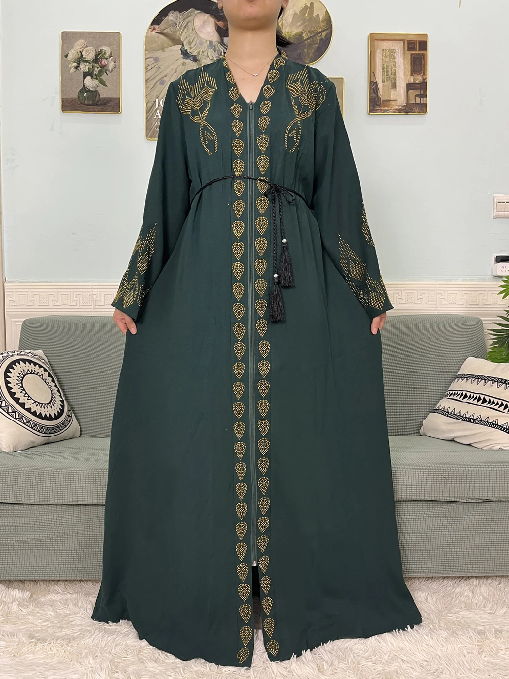 Muslim Open Abayas For Women 2024 Pure Chiffon Zipper Diamonds Loose Femme Robe Islam Dubai Boubou Moroccan Caftan With Turban