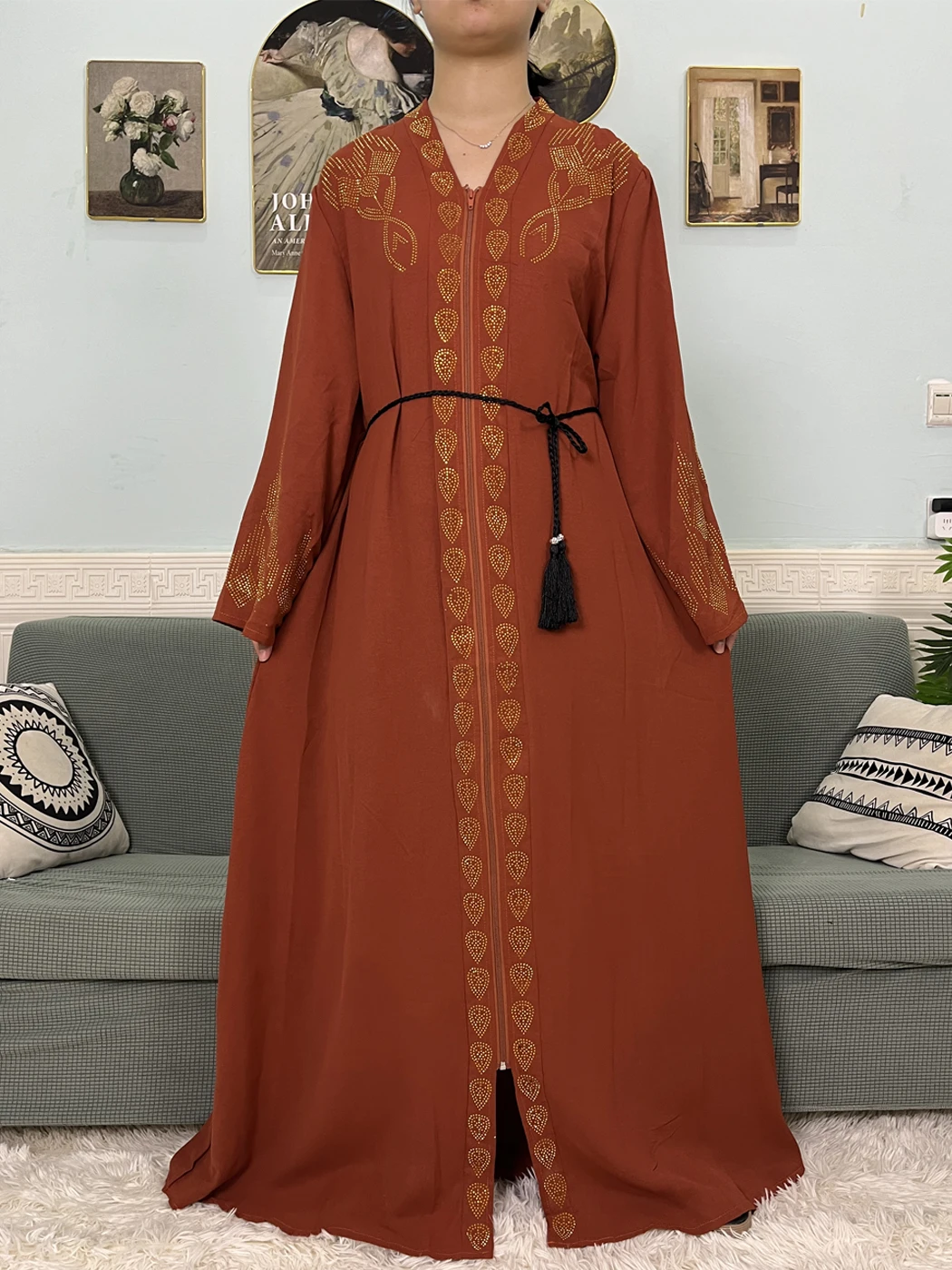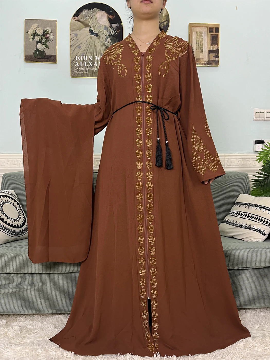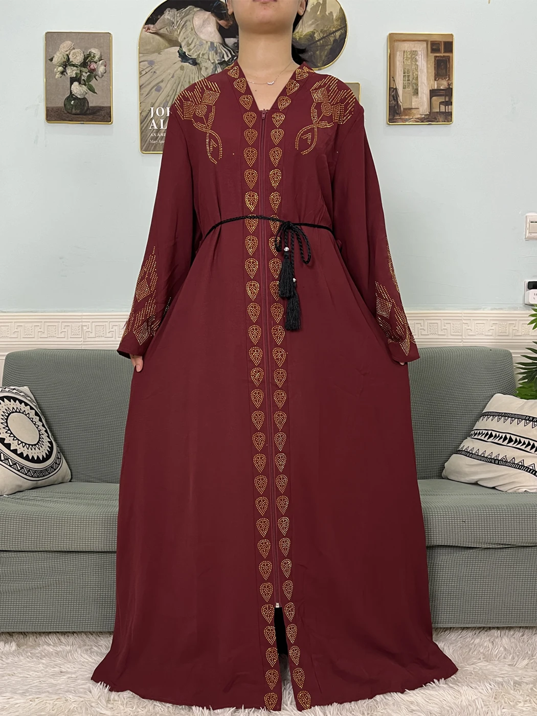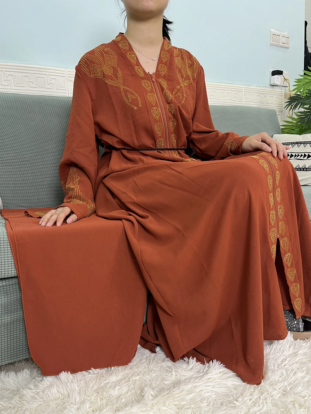 Muslim Open Abayas For Women 2024 Pure Chiffon Zipper Diamonds Loose Femme Robe Islam Dubai Boubou Moroccan Caftan With Turban