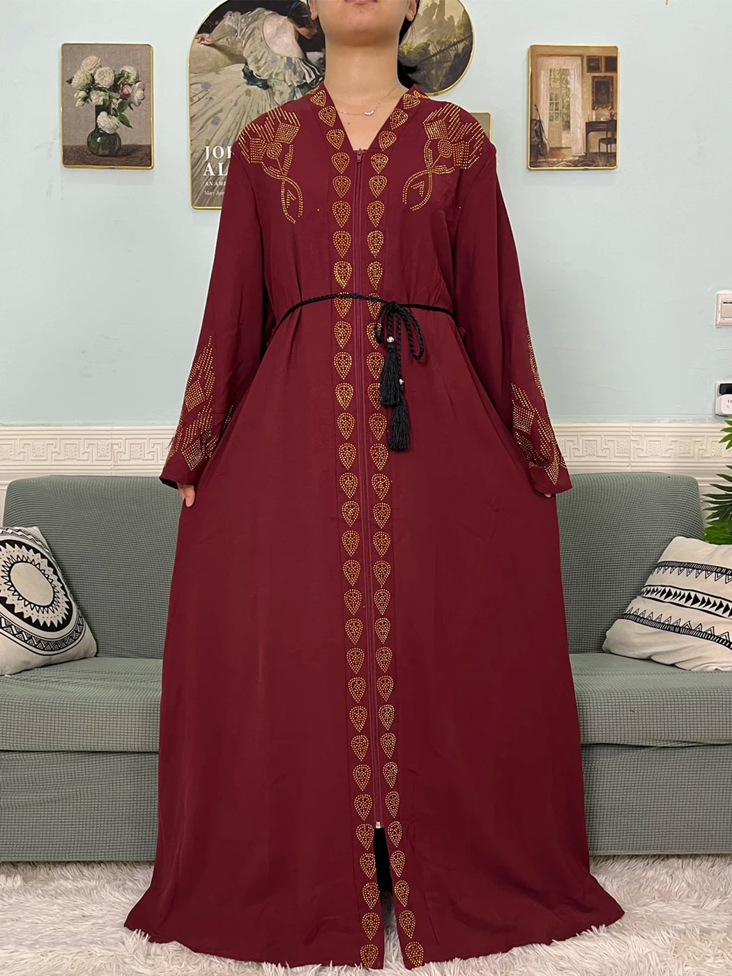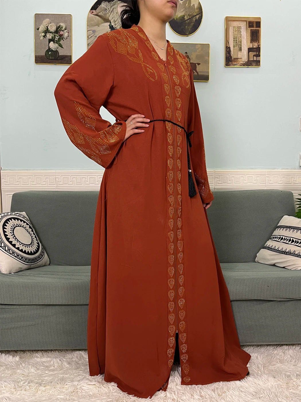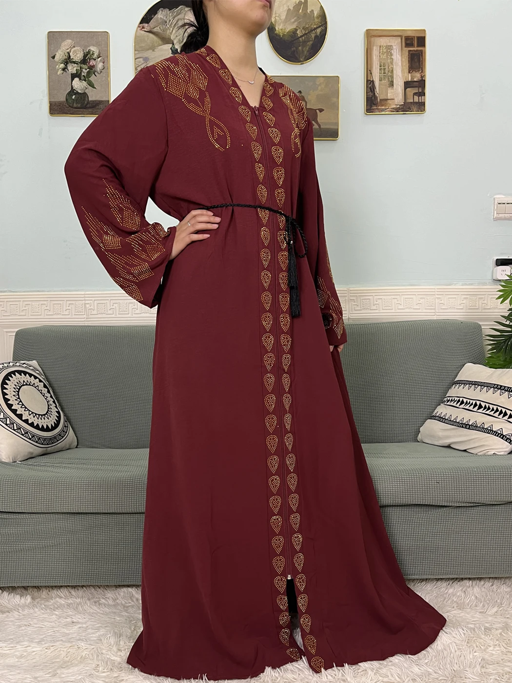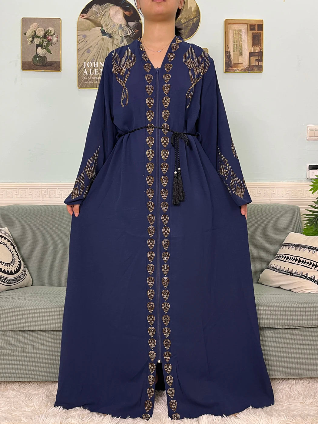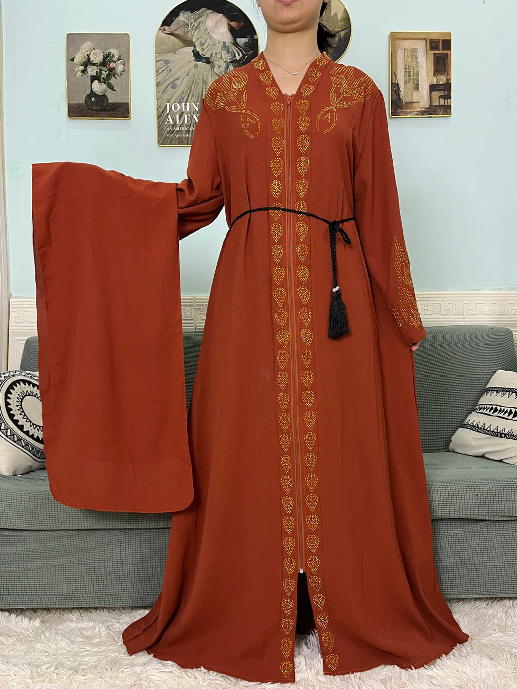 Muslim Open Abayas For Women 2024 Pure Chiffon Zipper Diamonds Loose Femme Robe Islam Dubai Boubou Moroccan Caftan With Turban