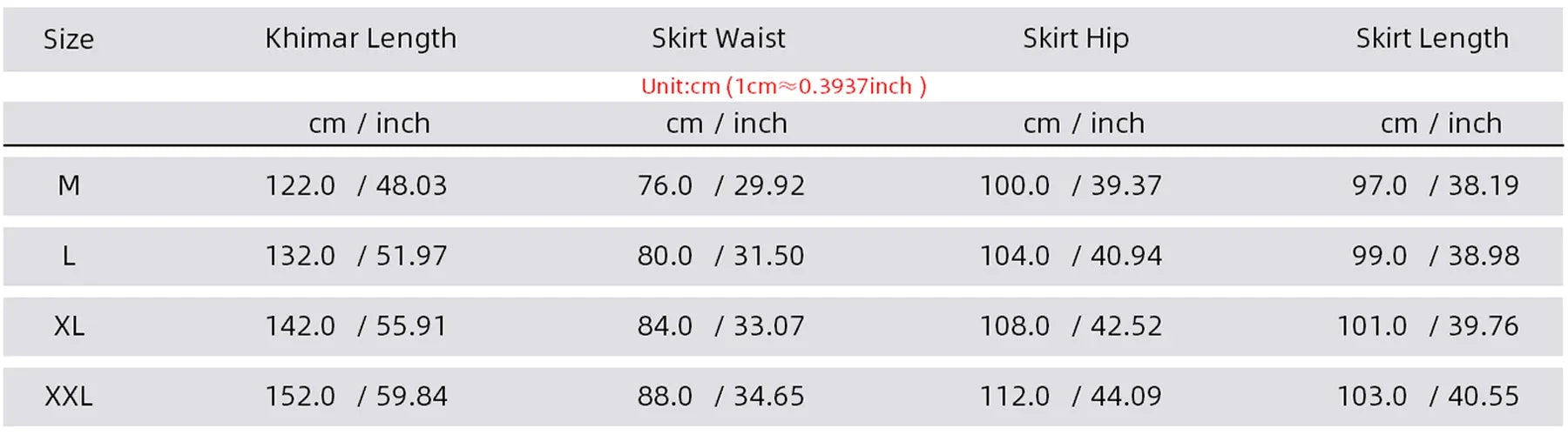 Unit:cm * Size M, Khimar Length 122cm, Skirt Waist 76cm, Skirt Hip 100cm, Skirt Length 97cm * Size L, Khimar Length 132cm, Skirt Waist 80cm, Skirt Hip 104cm, Skirt Length 99cm * Size XL, Khimar Length 142cm, Skirt Waist 84cm, Skirt Hip 108cm, Skirt Length 101cm * Size XXL, Khimar Length 152cm, Skirt Waist 90cm, Skirt Hip 112cm, Skirt Length 103cm