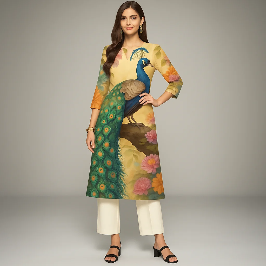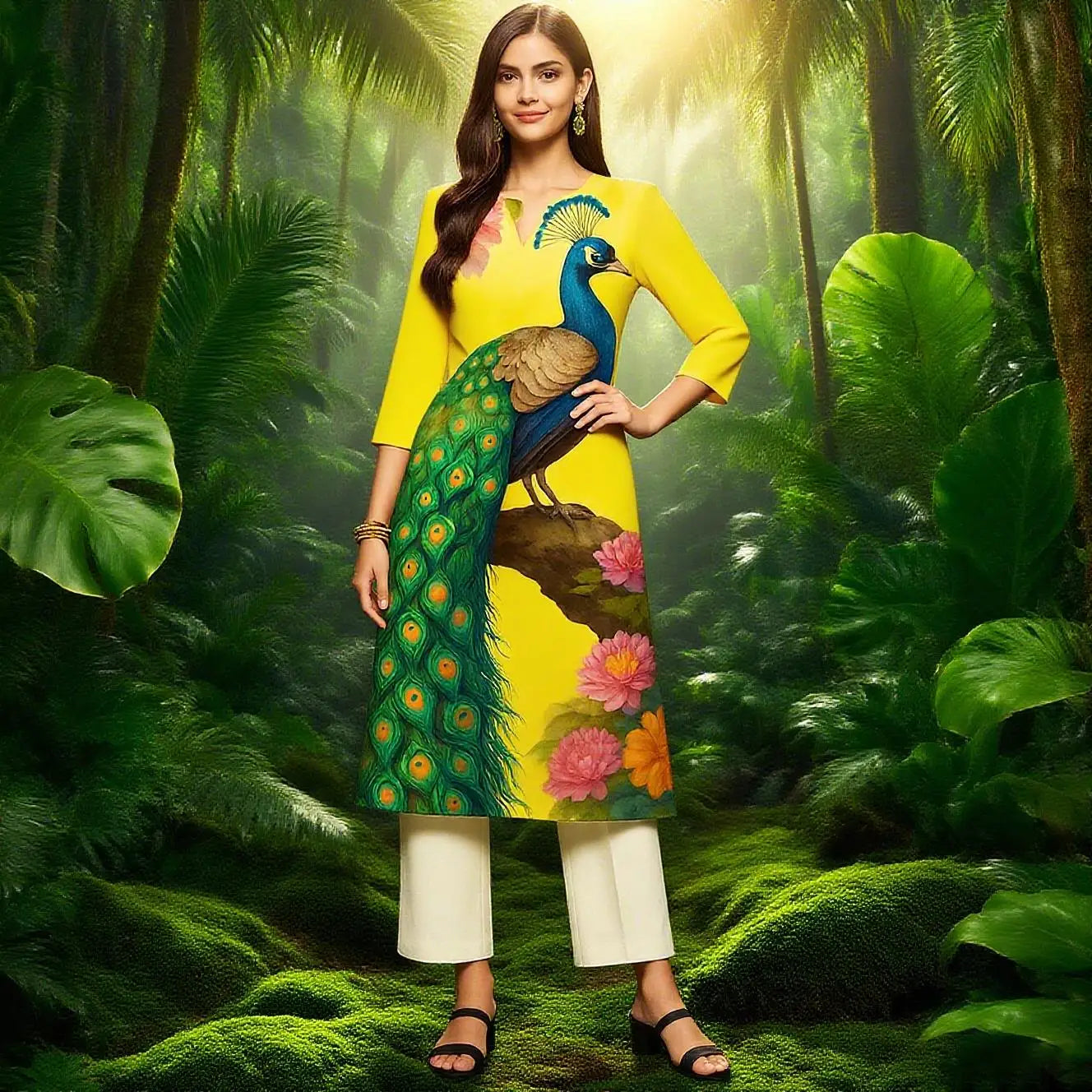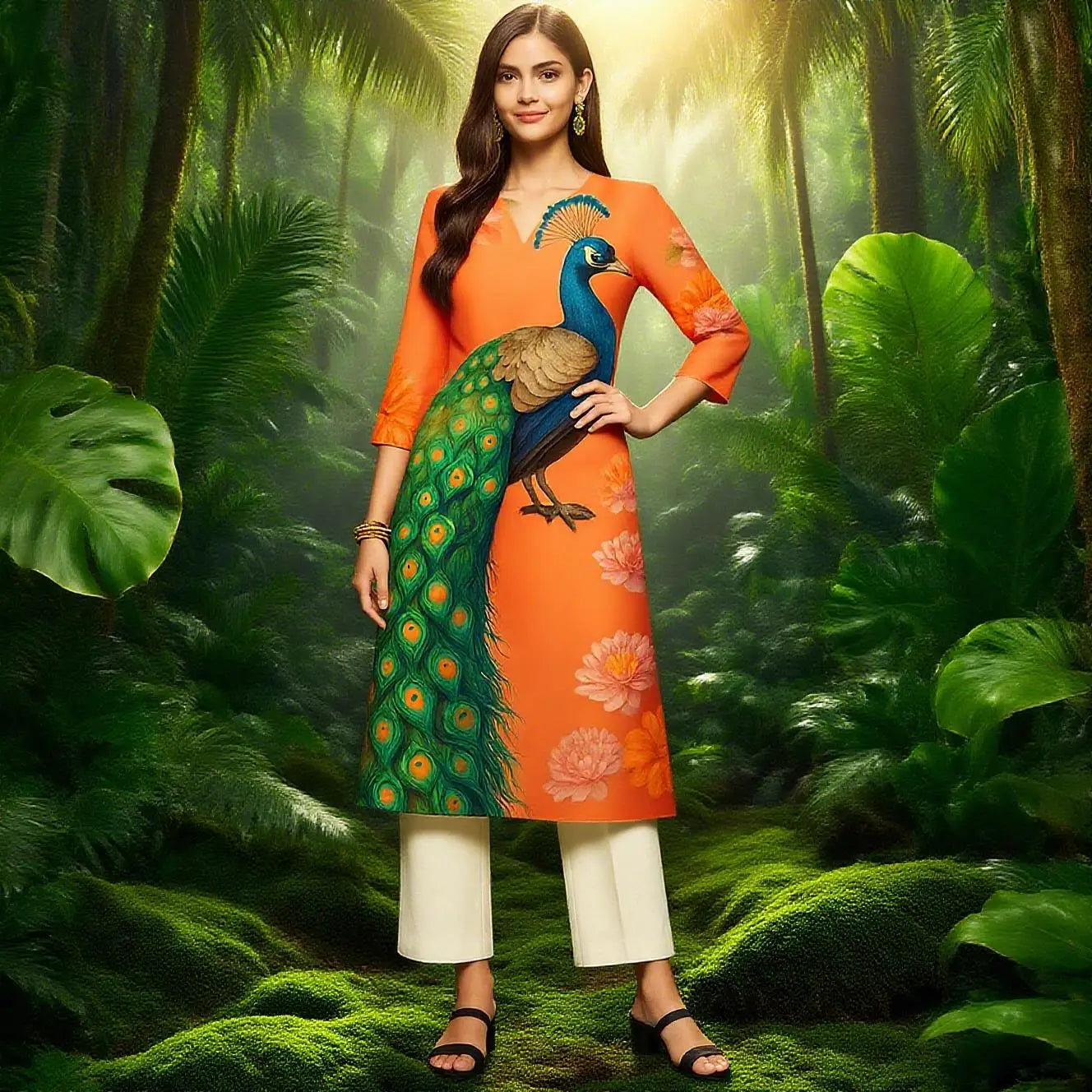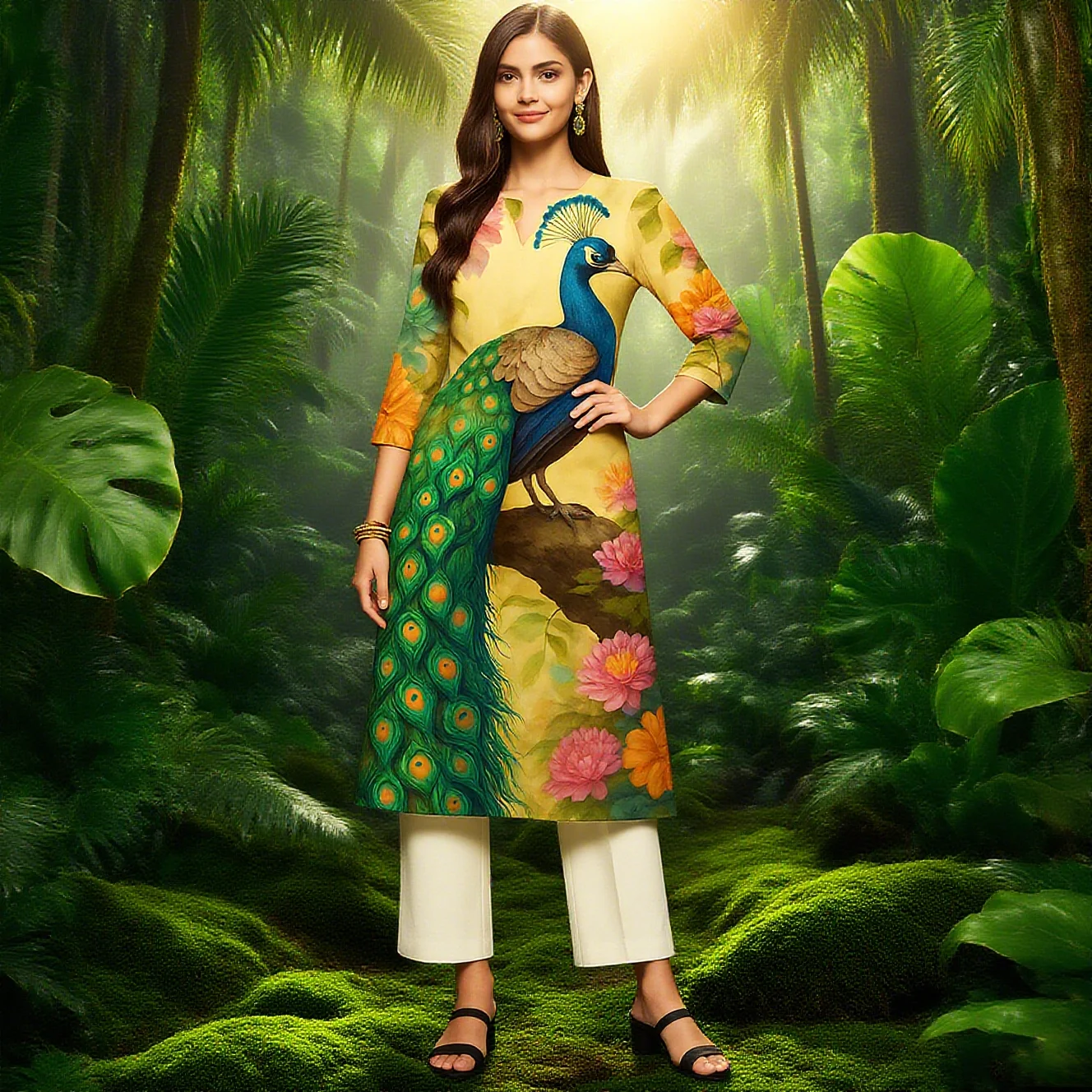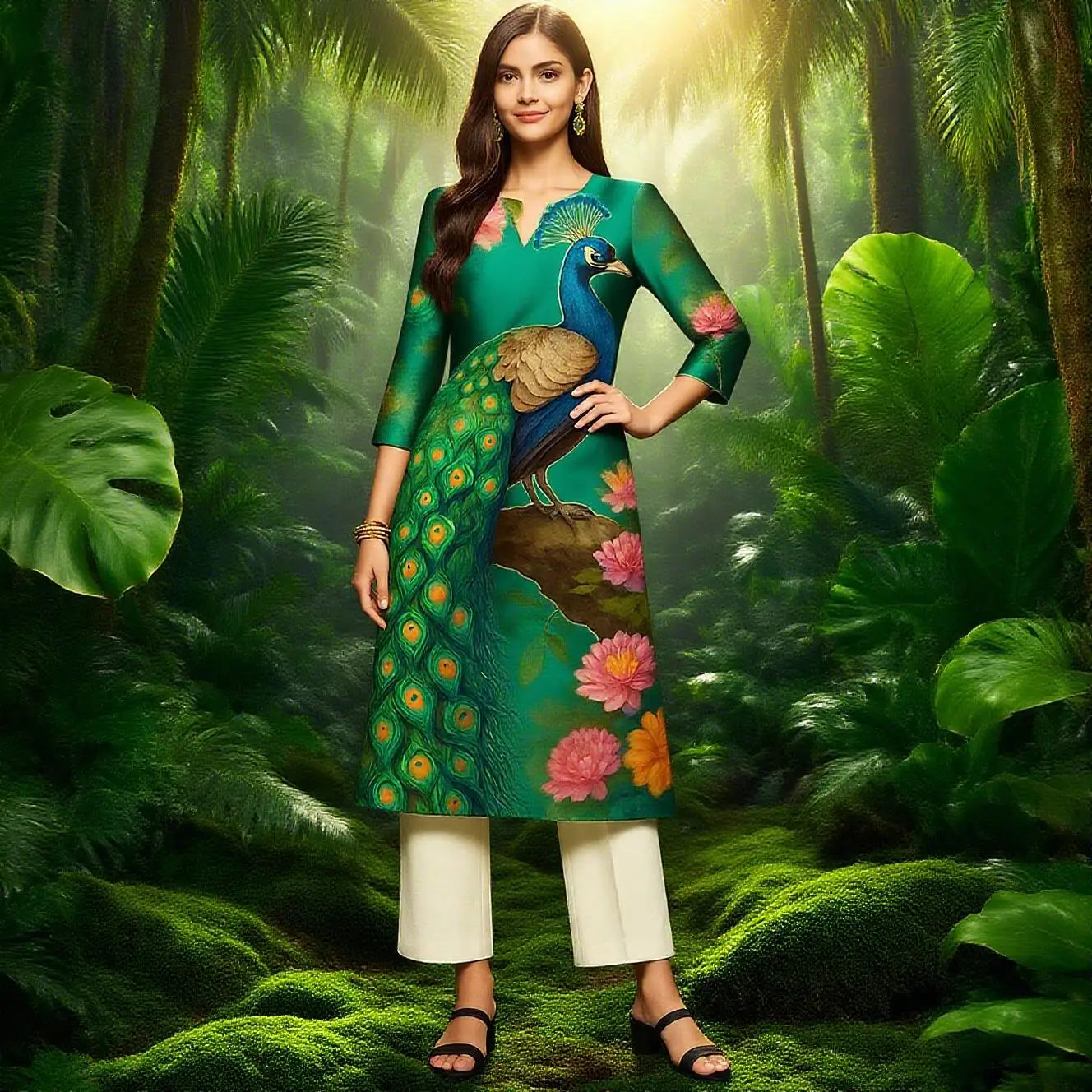 Muslim Women's Kurt Fashionable And Elegant Long Sleeved Straight Tube Casual Kurtta Peacock Pattern Kaftan Marroqui Mujer