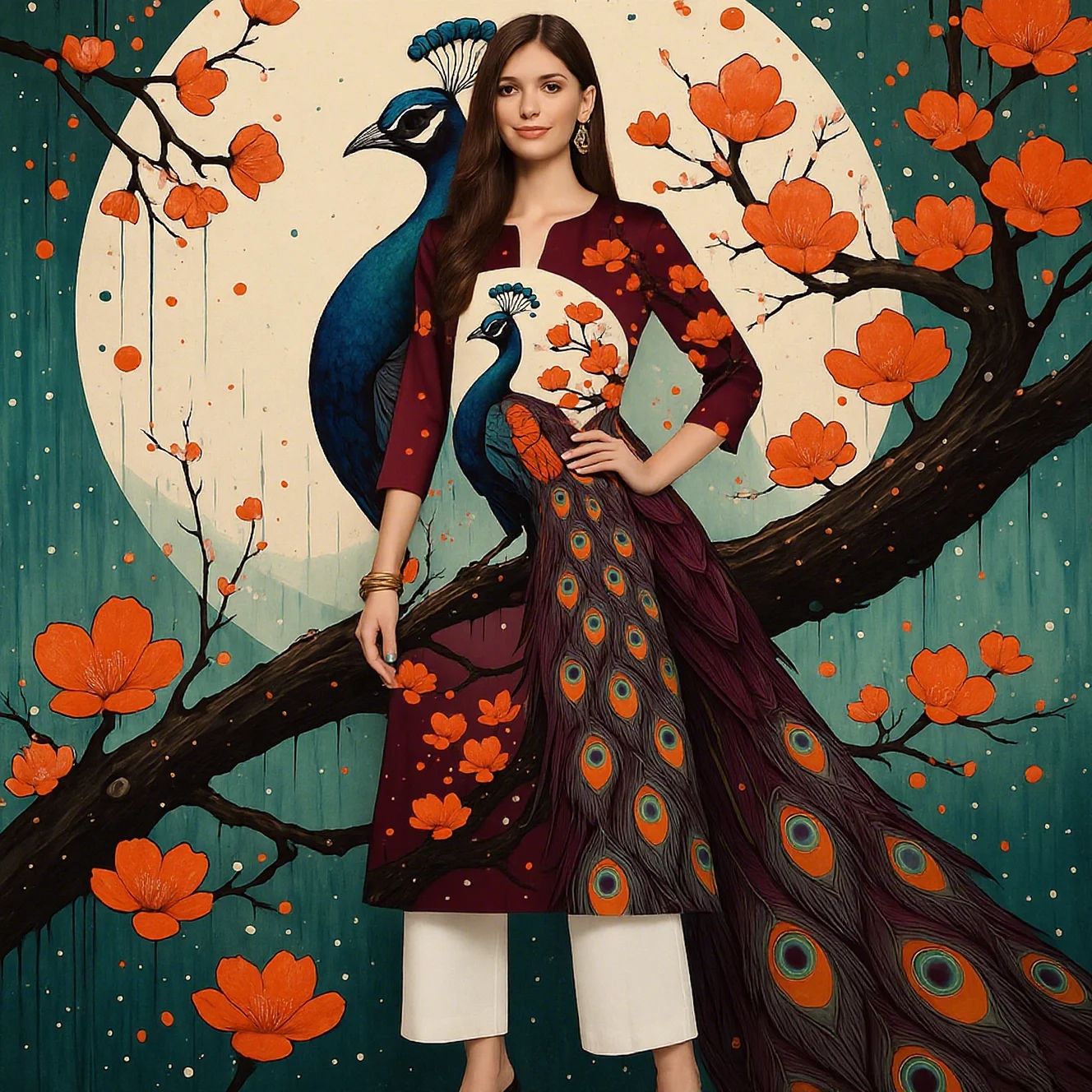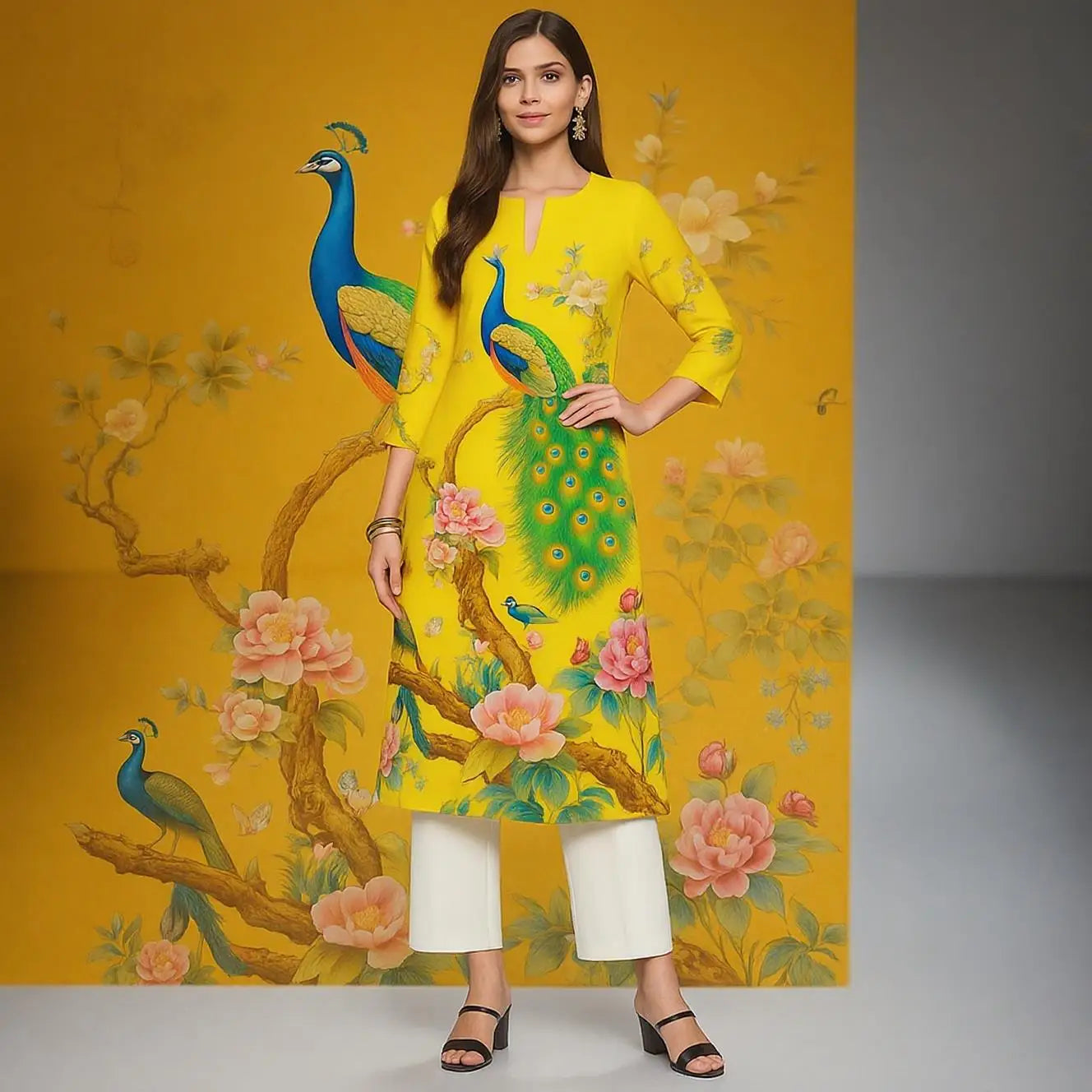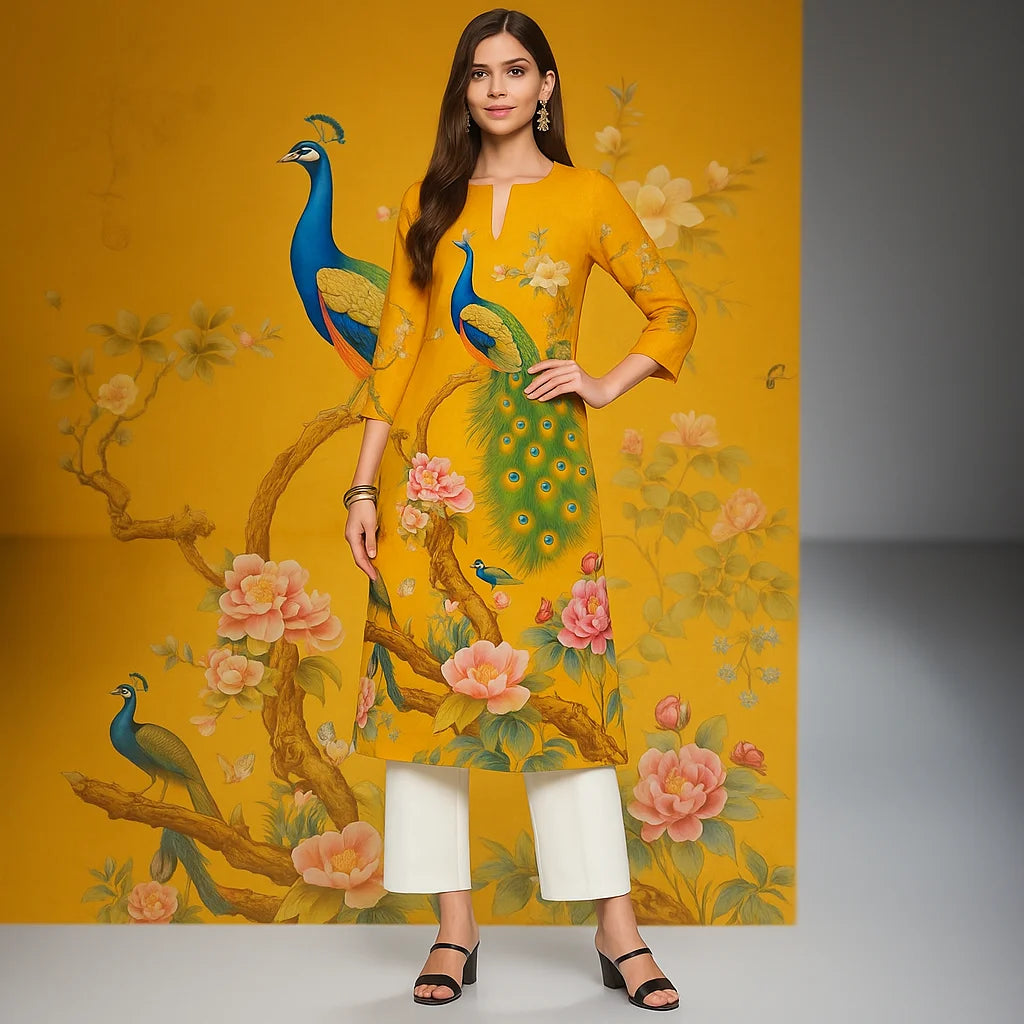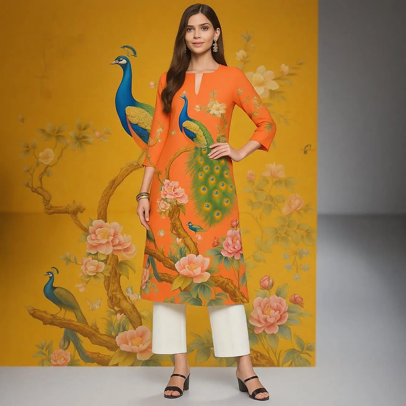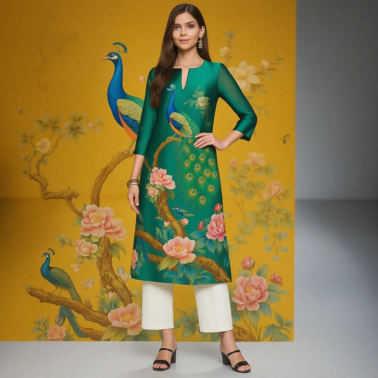 Muslim Women's Kurt Fashionable And Elegant Long Sleeved Straight Tube Casual Kurtta Peacock Pattern Kaftan Marroqui Mujer