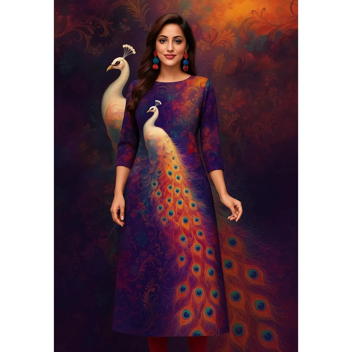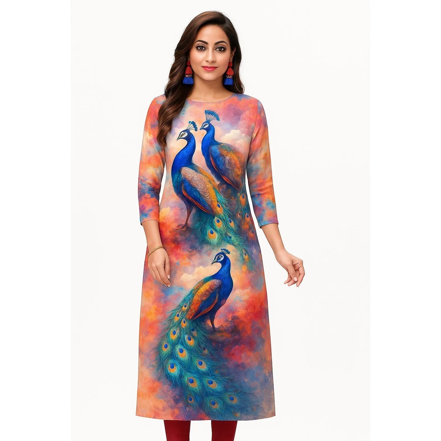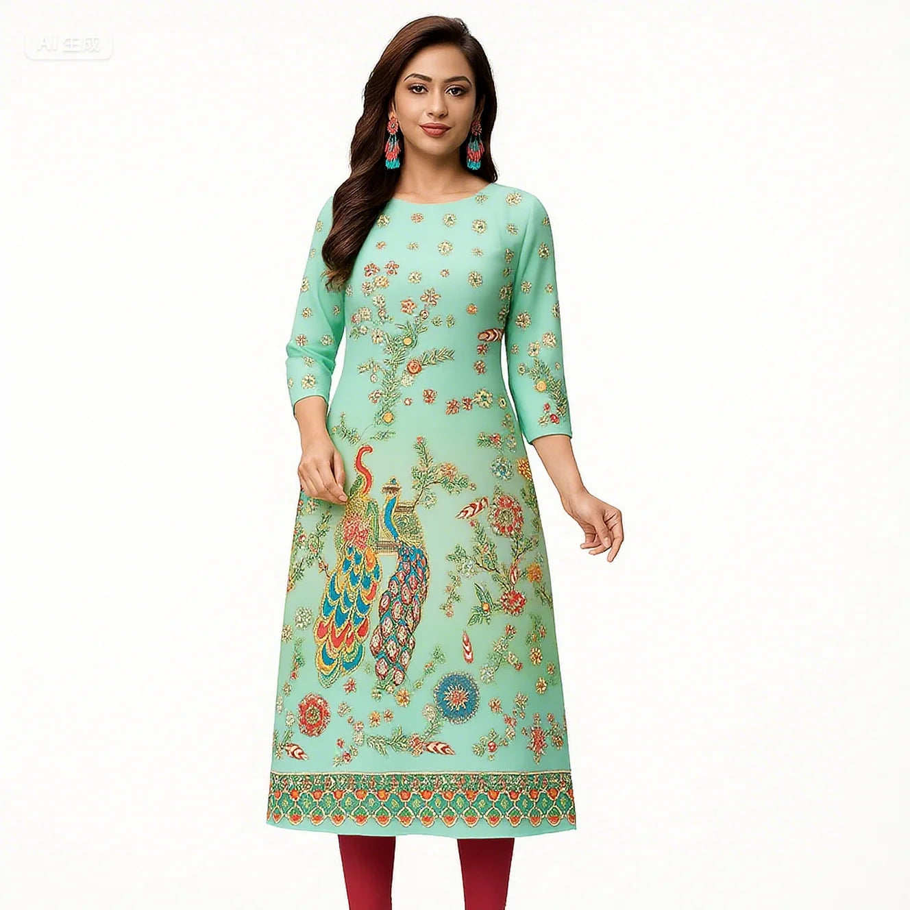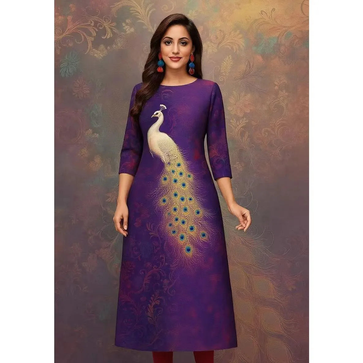 Muslim Women's Kurt Fashionable And Elegant Long Sleeved Straight Tube Casual Kurtta Peacock Pattern Kaftan Marroqui Slit hem