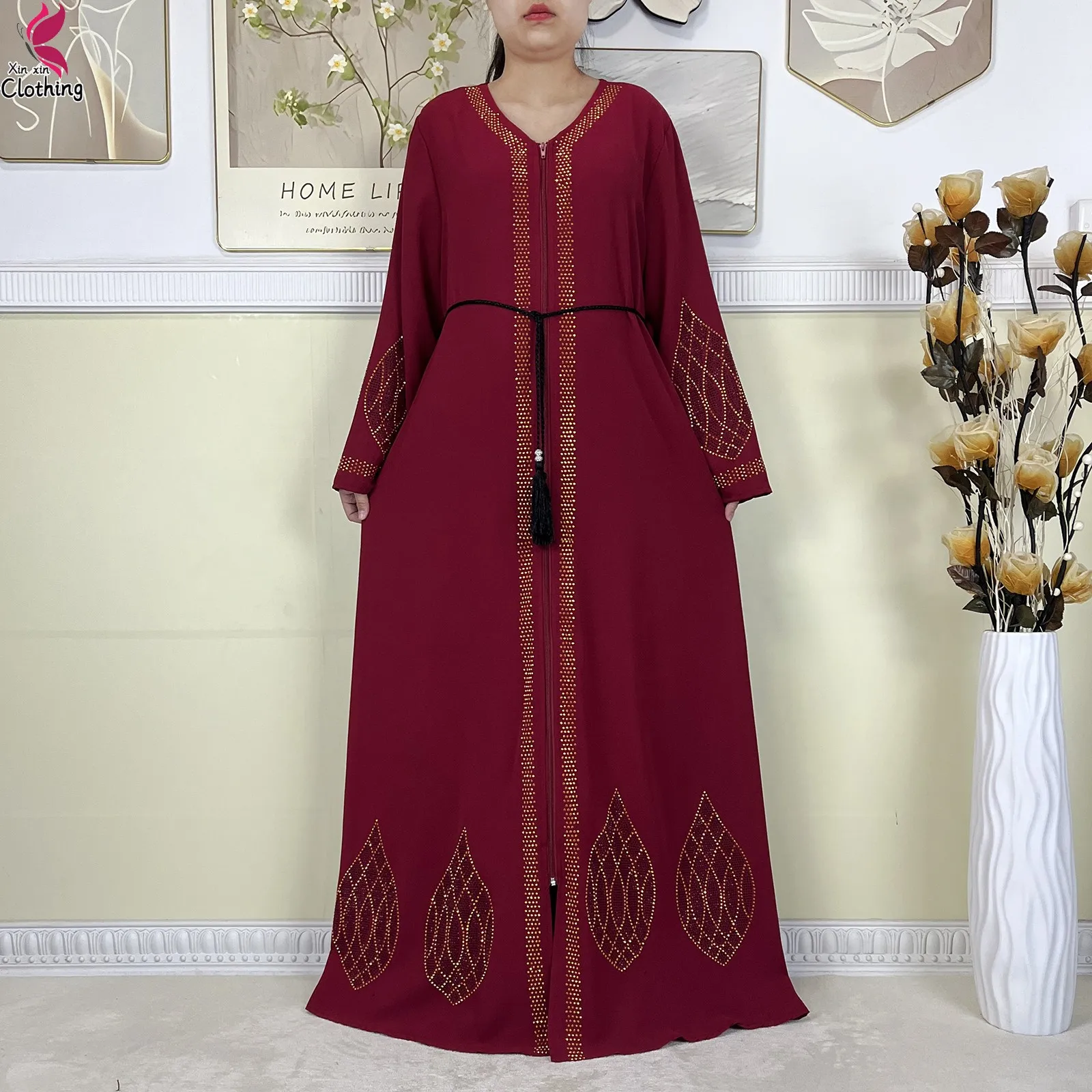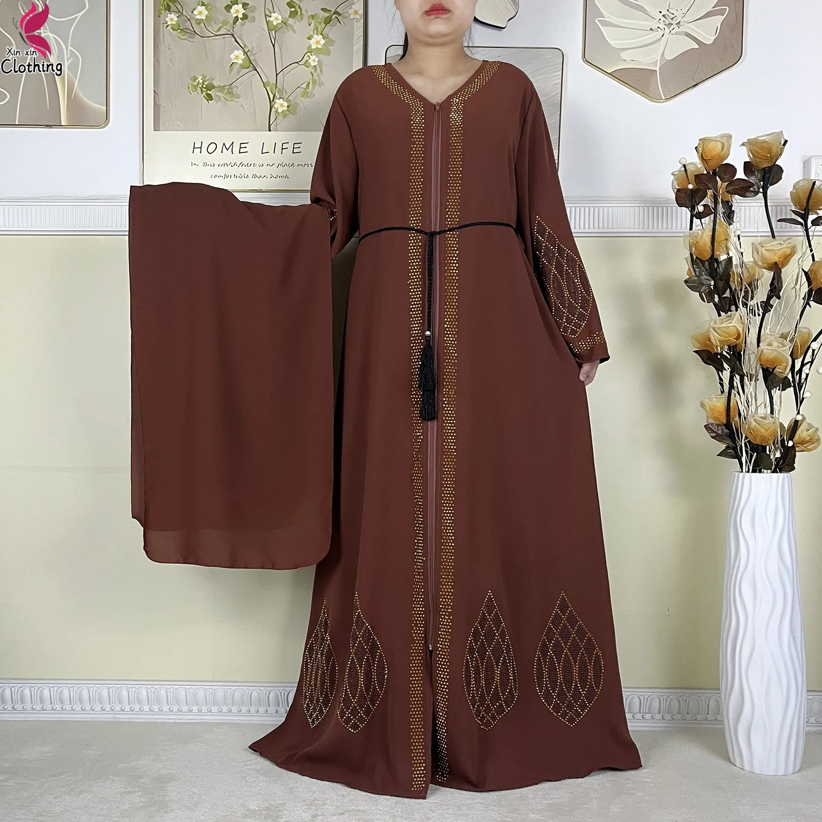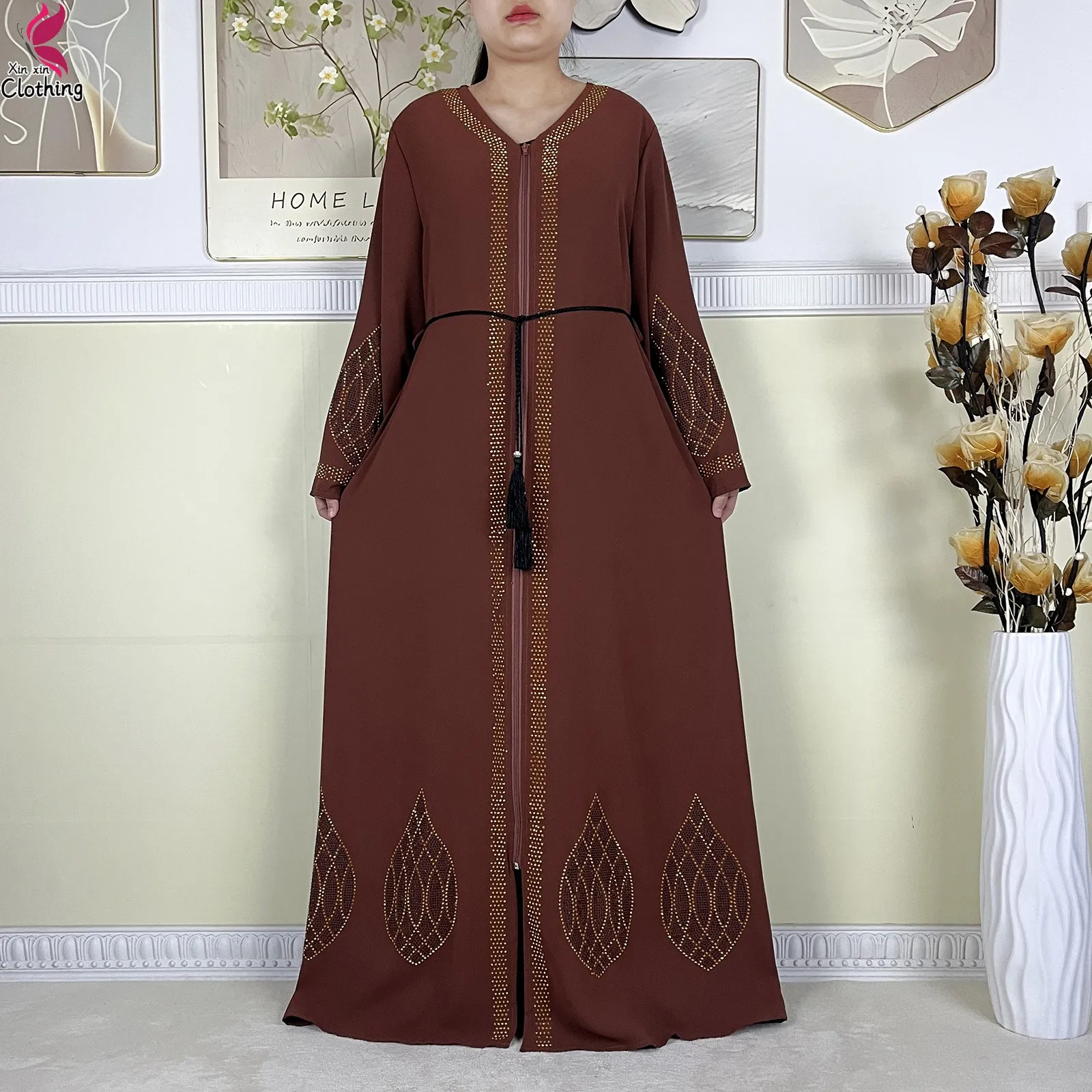 New Dubai Women Elegant Dress Diamonds Chiffon Open Abaya with Zipper Islamic Turkey Clothing Women Muslim Party Evening Dress