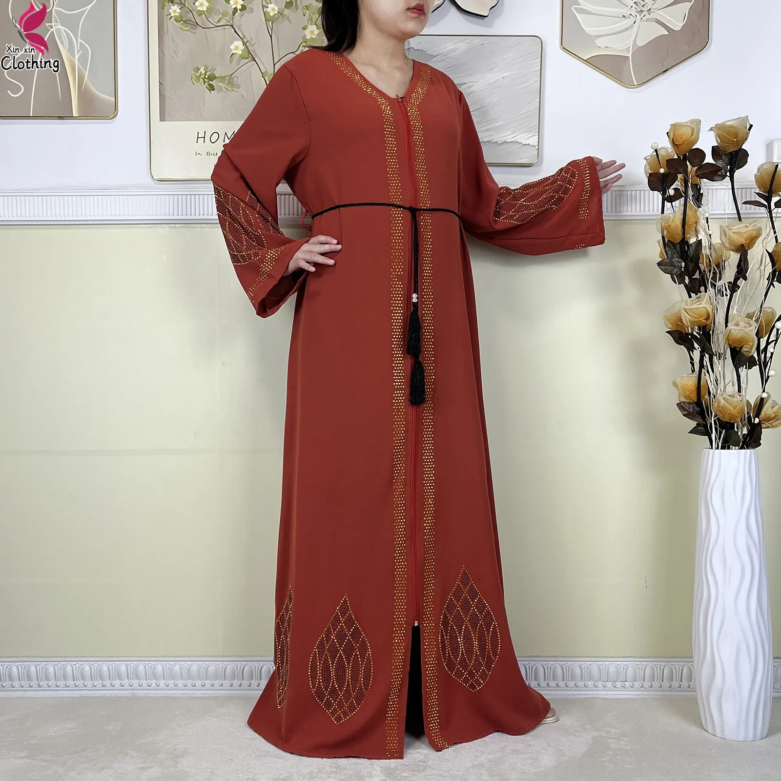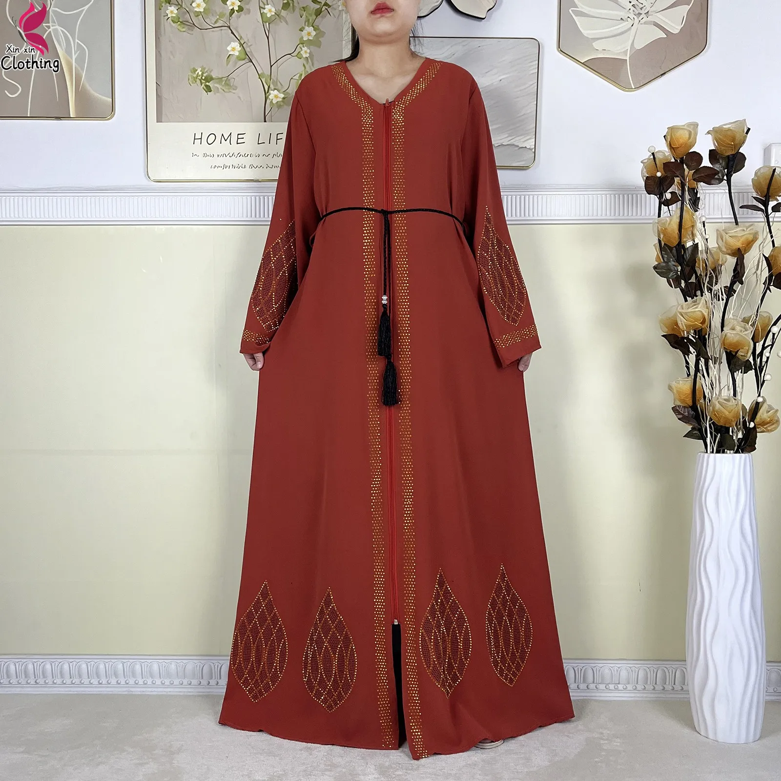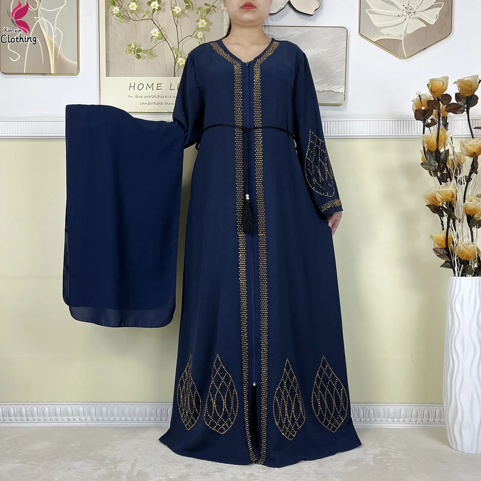 New Dubai Women Elegant Dress Diamonds Chiffon Open Abaya with Zipper Islamic Turkey Clothing Women Muslim Party Evening Dress