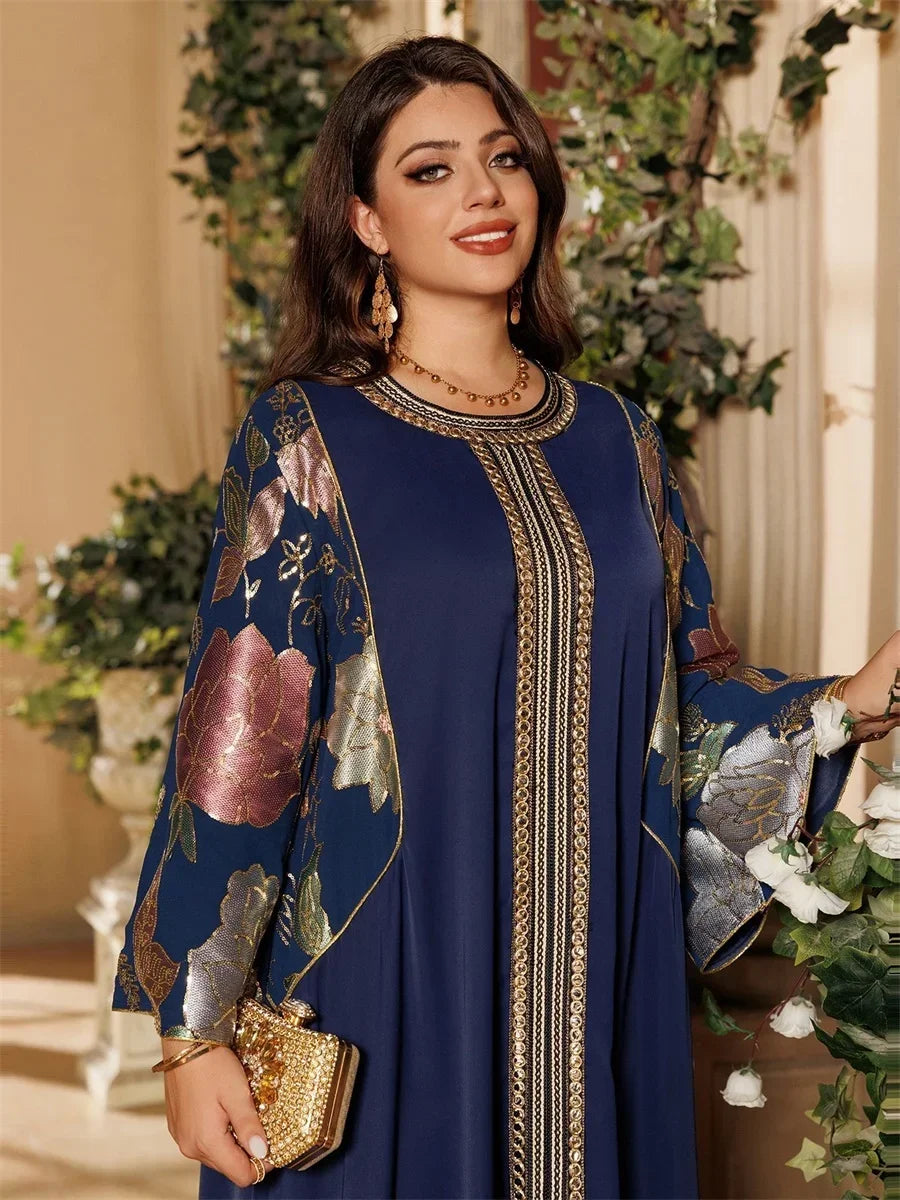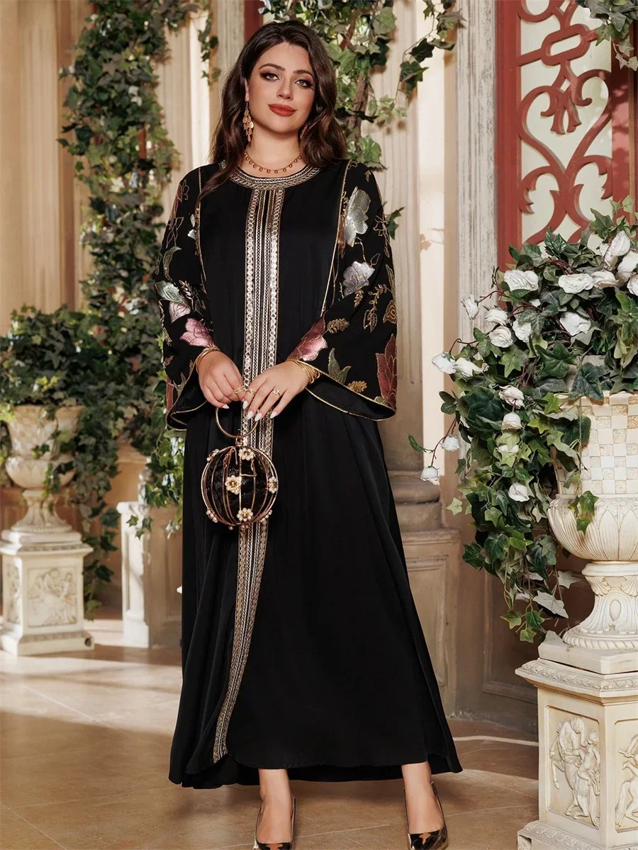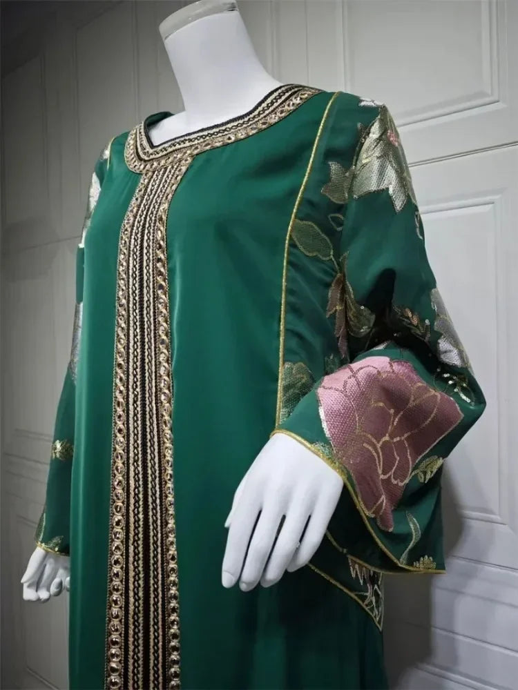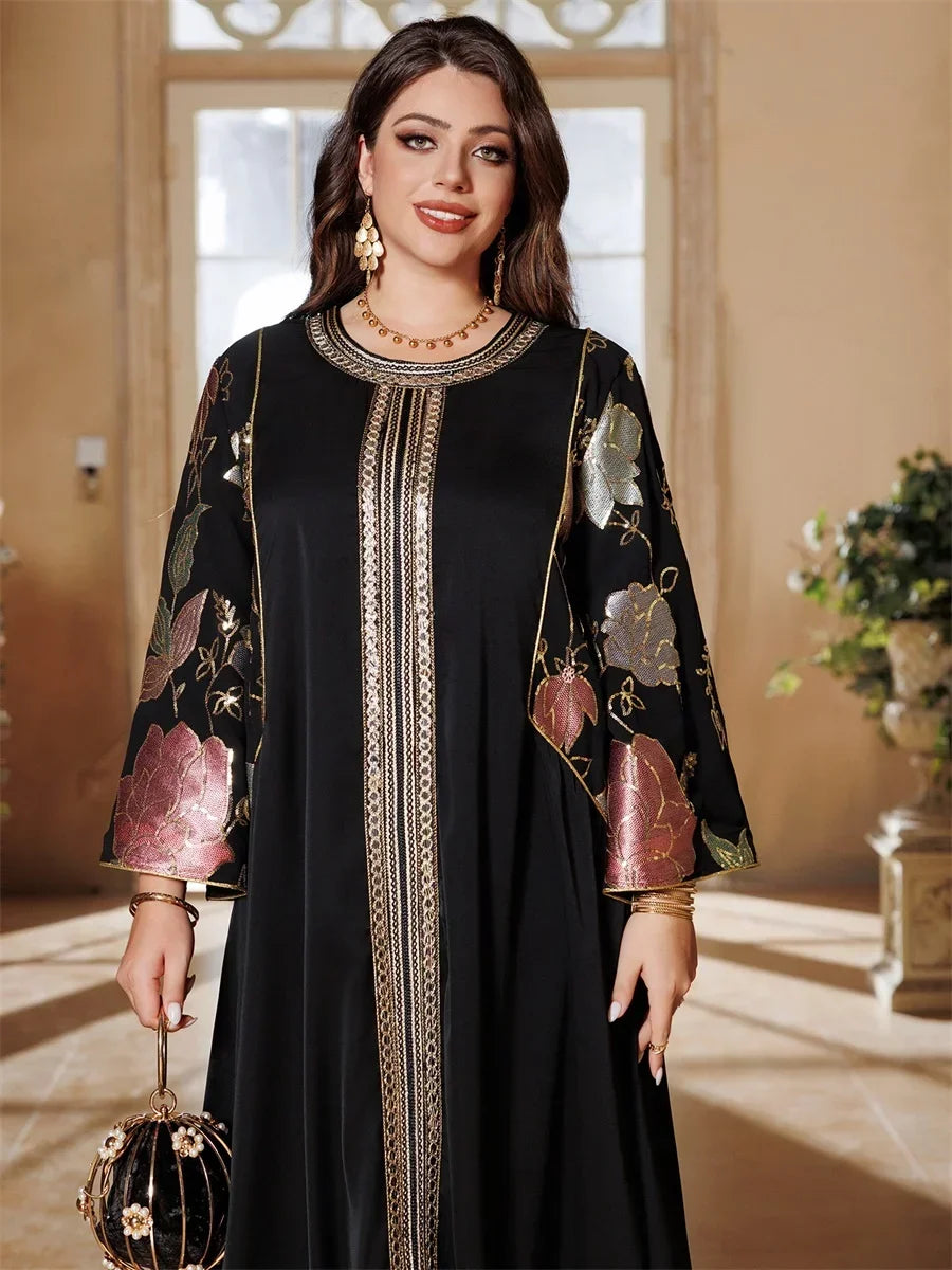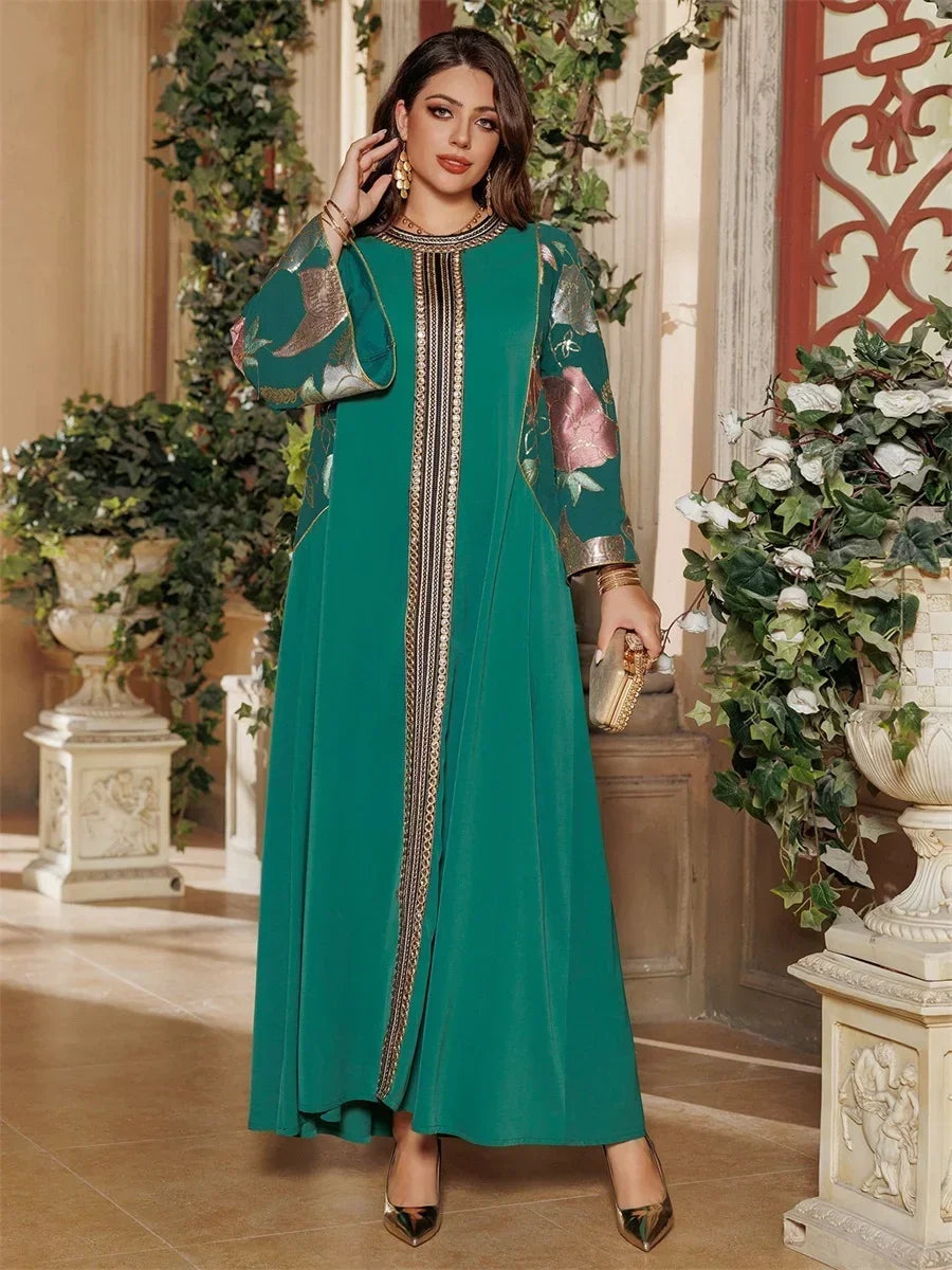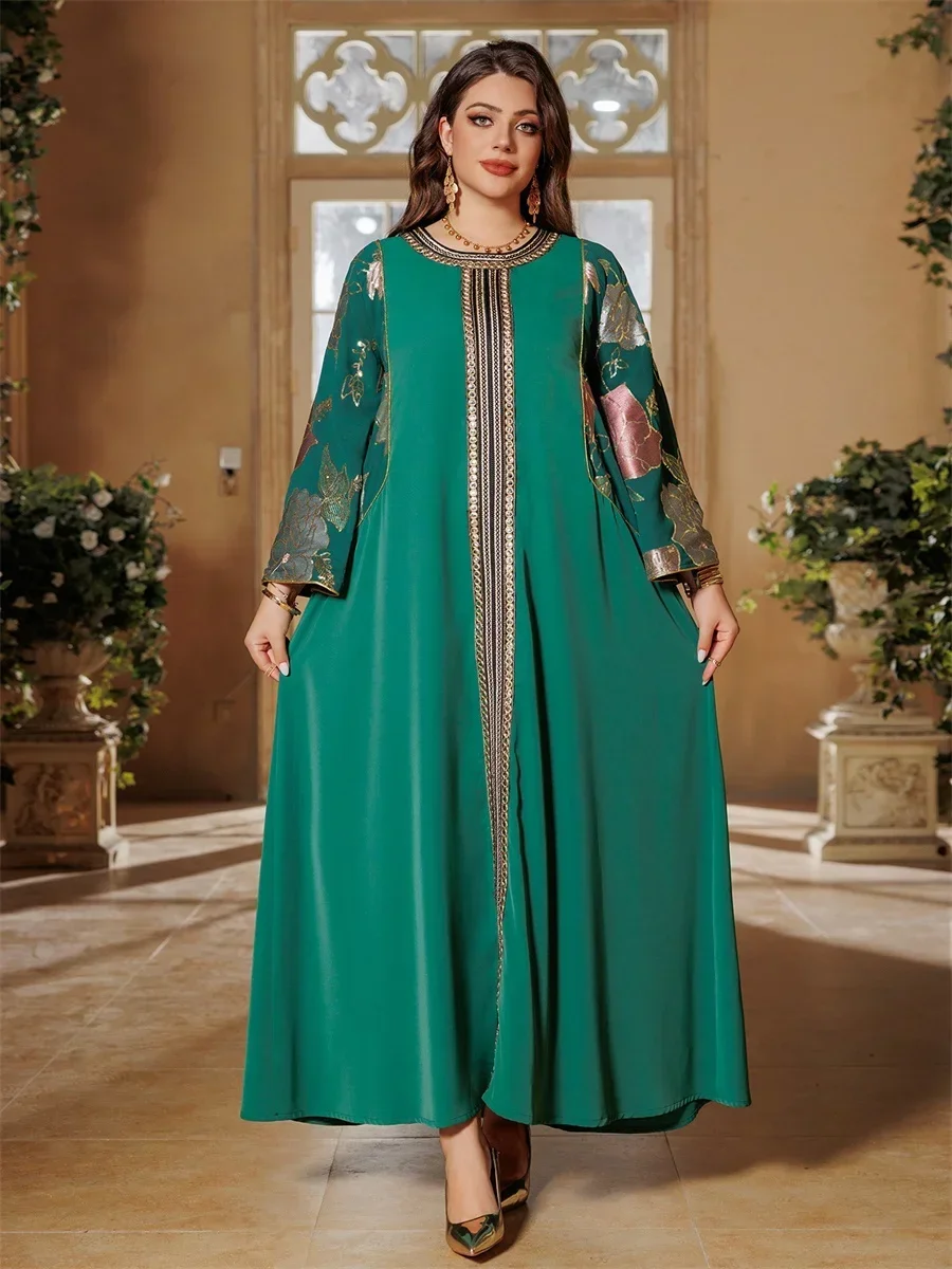 Ramadan Muslim Women's Gold Stamping Petal Sleeve Abaya O-Neck Stripe Dubai Dresses For Women Gala