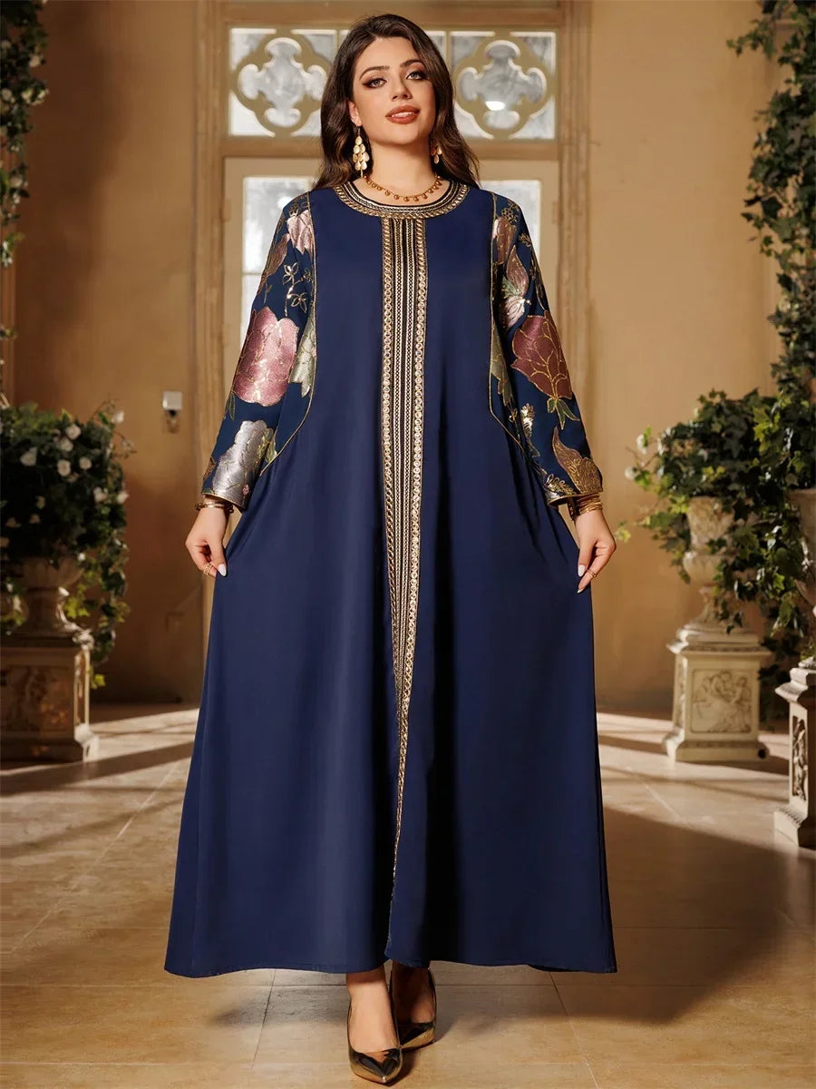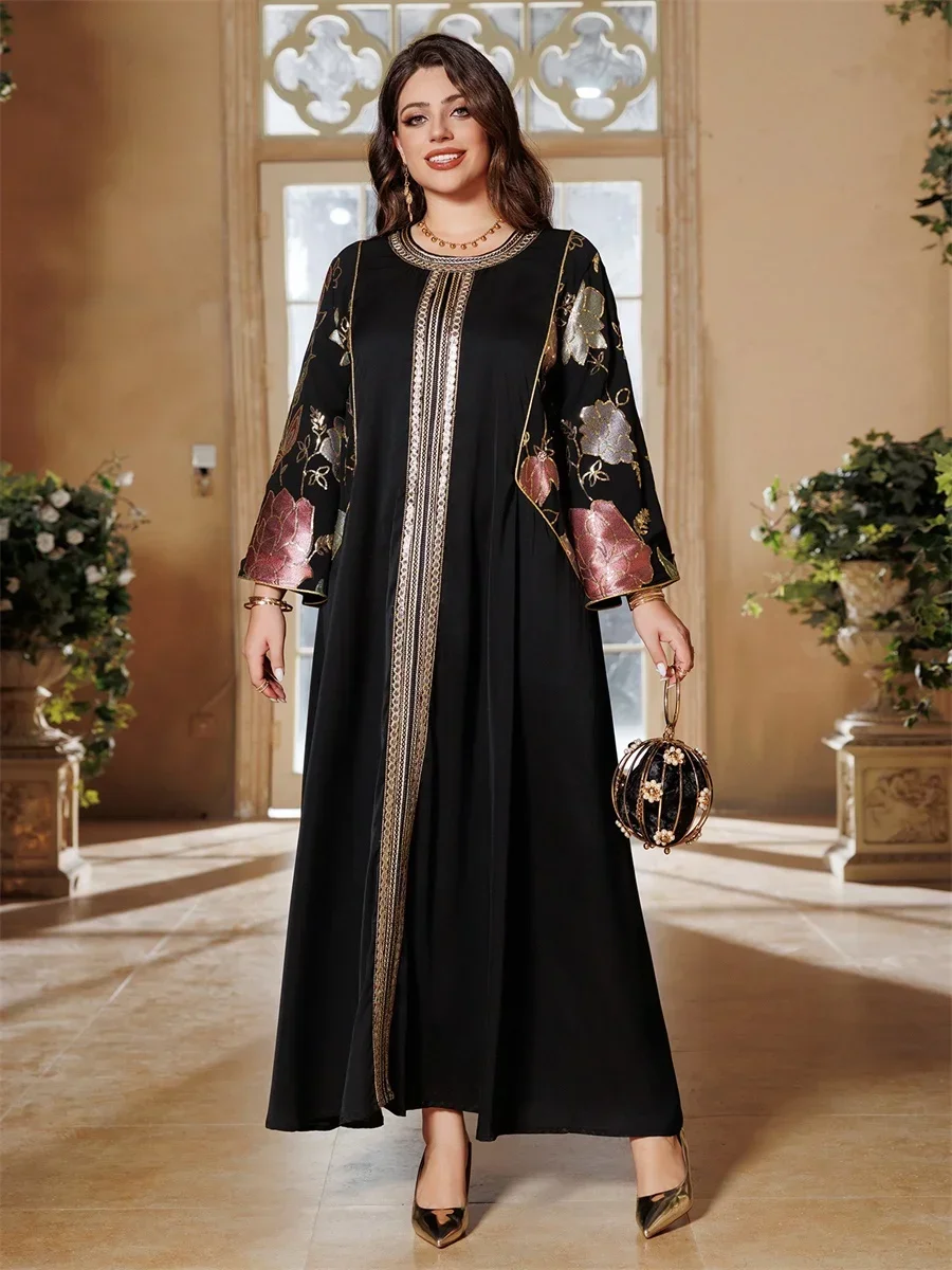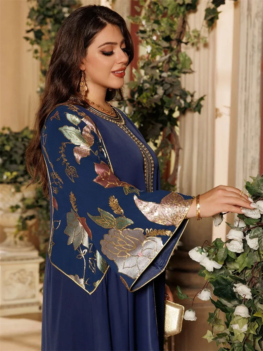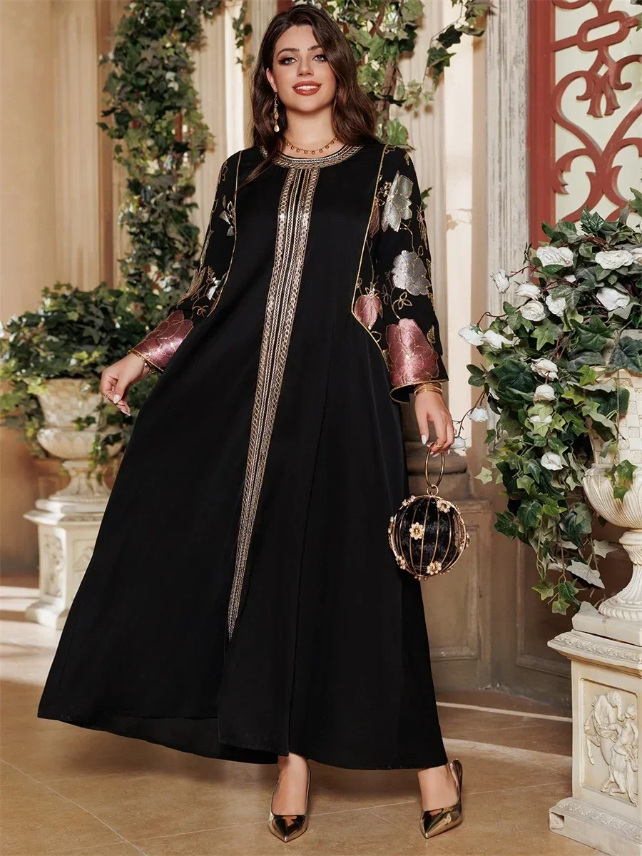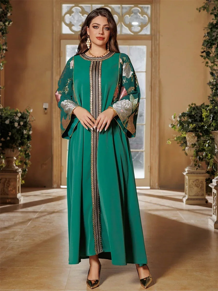 Ramadan Muslim Women's Gold Stamping Petal Sleeve Abaya O-Neck Stripe Dubai Dresses For Women Gala