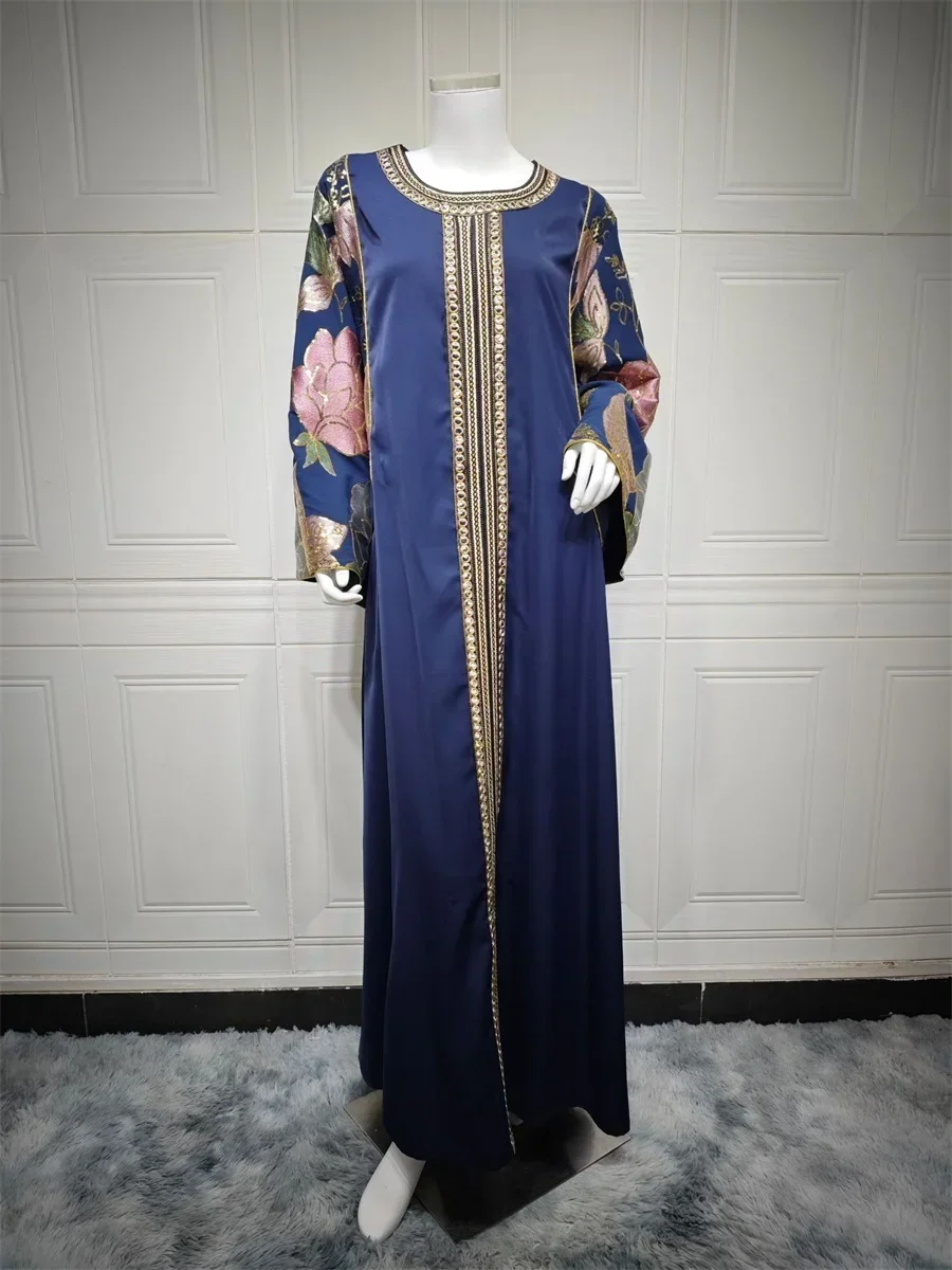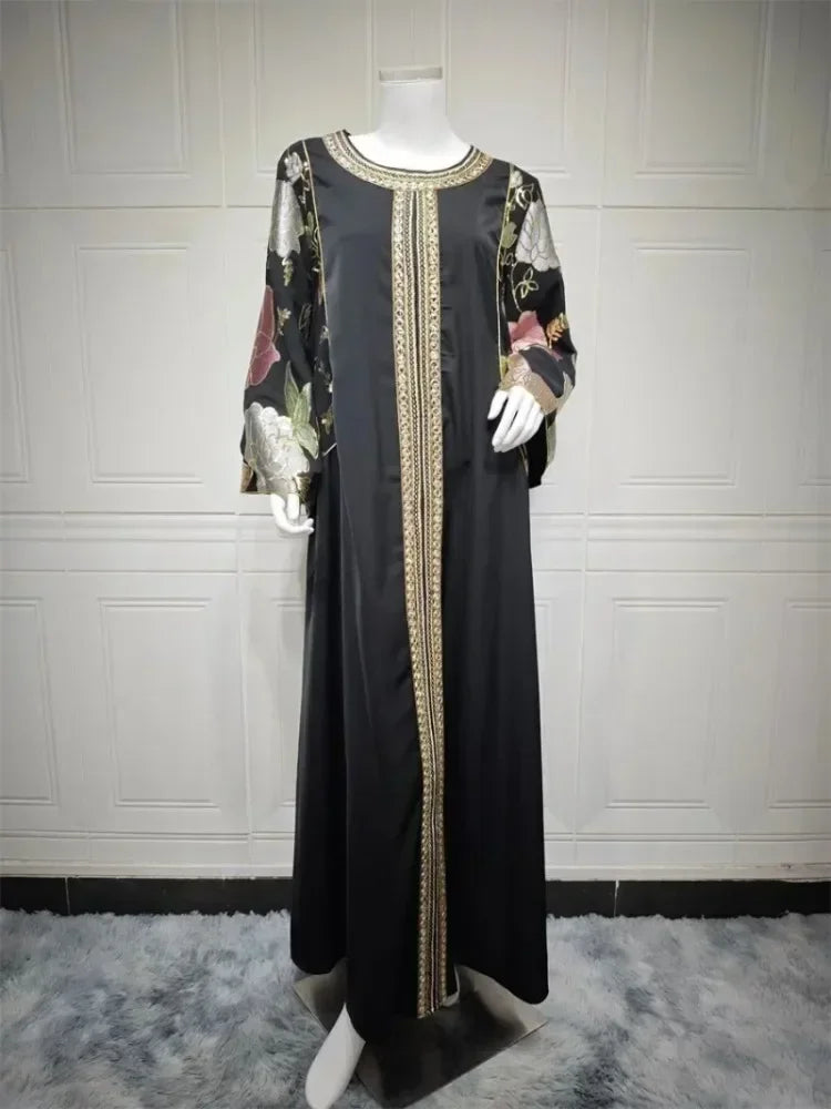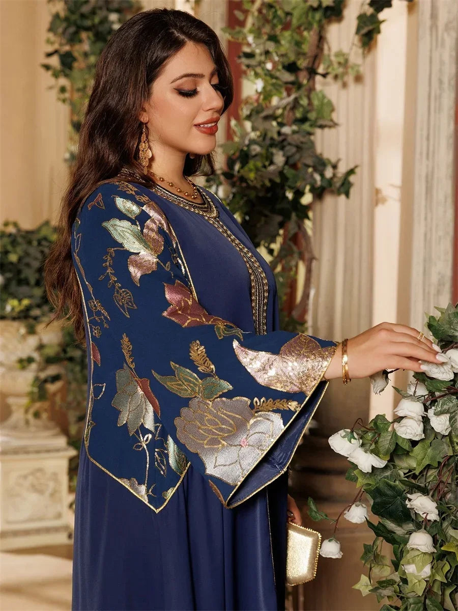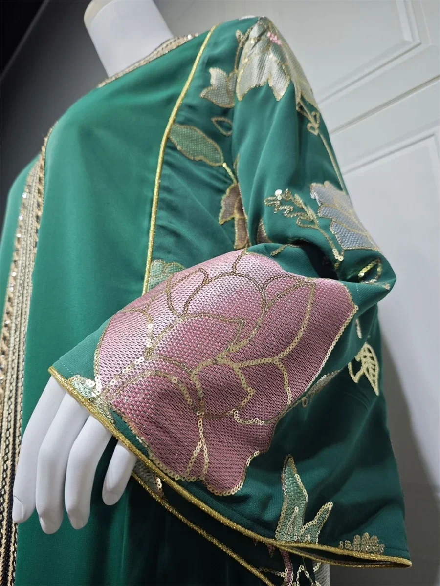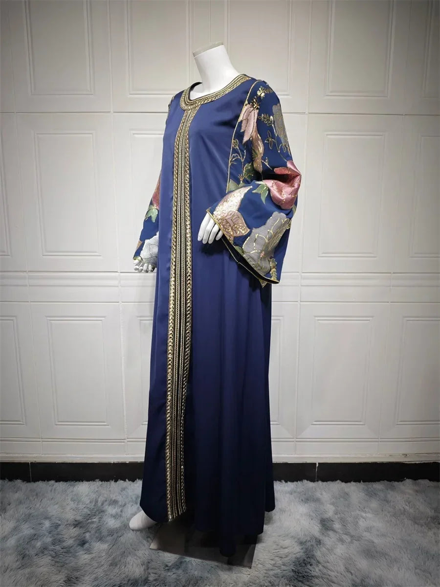 Ramadan Muslim Women's Gold Stamping Petal Sleeve Abaya O-Neck Stripe Dubai Dresses For Women Gala