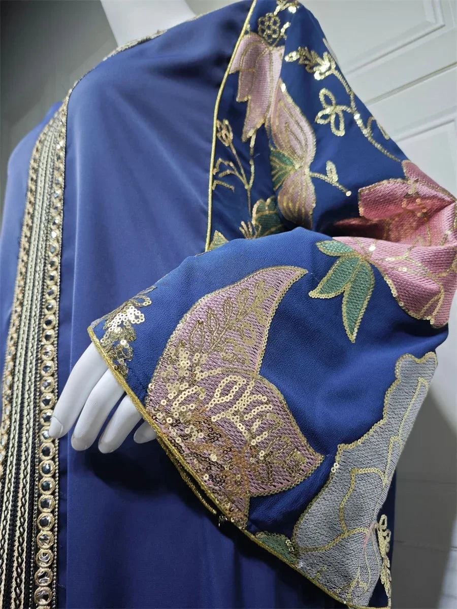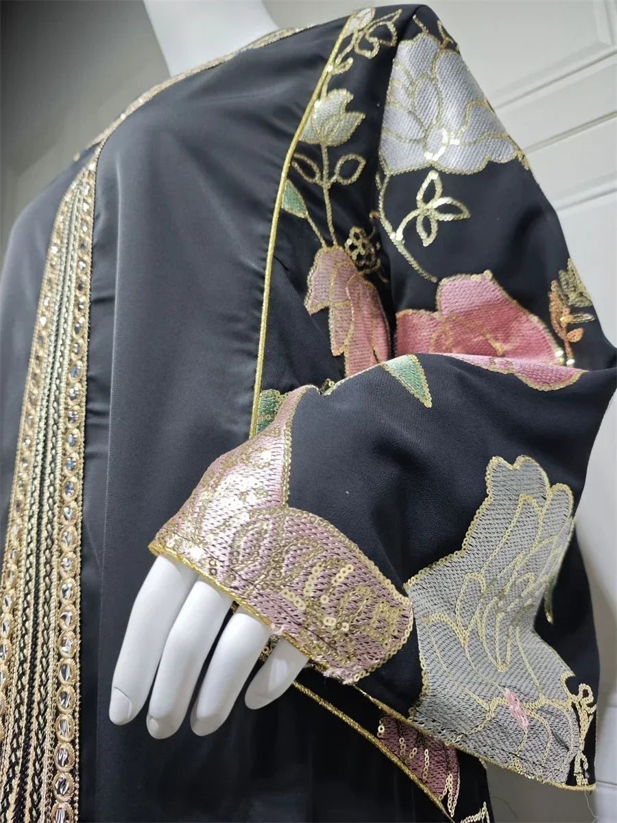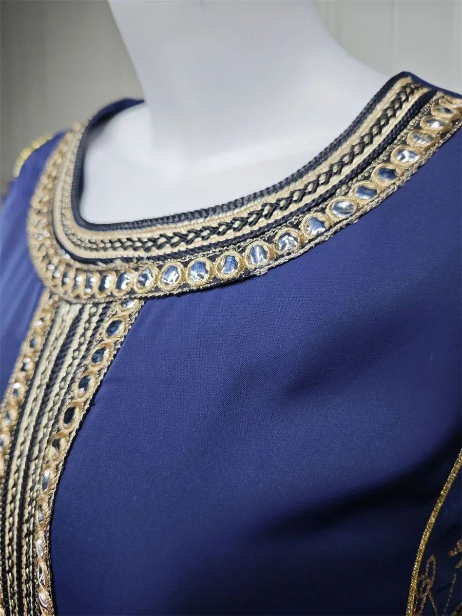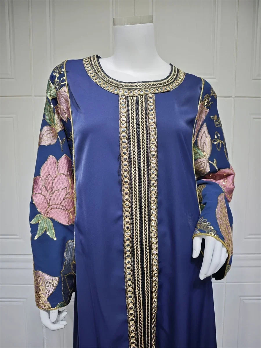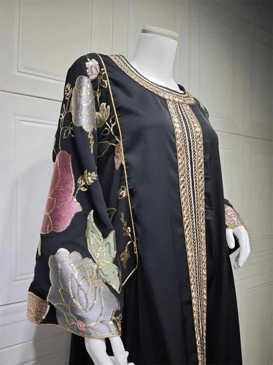 Ramadan Muslim Women's Gold Stamping Petal Sleeve Abaya O-Neck Stripe Dubai Dresses For Women Gala