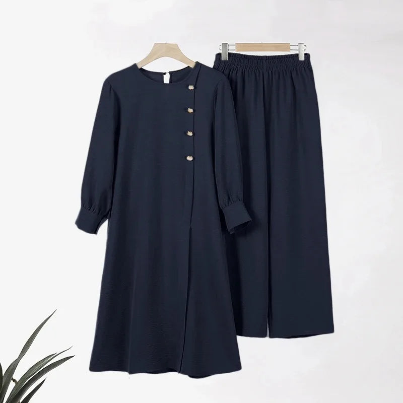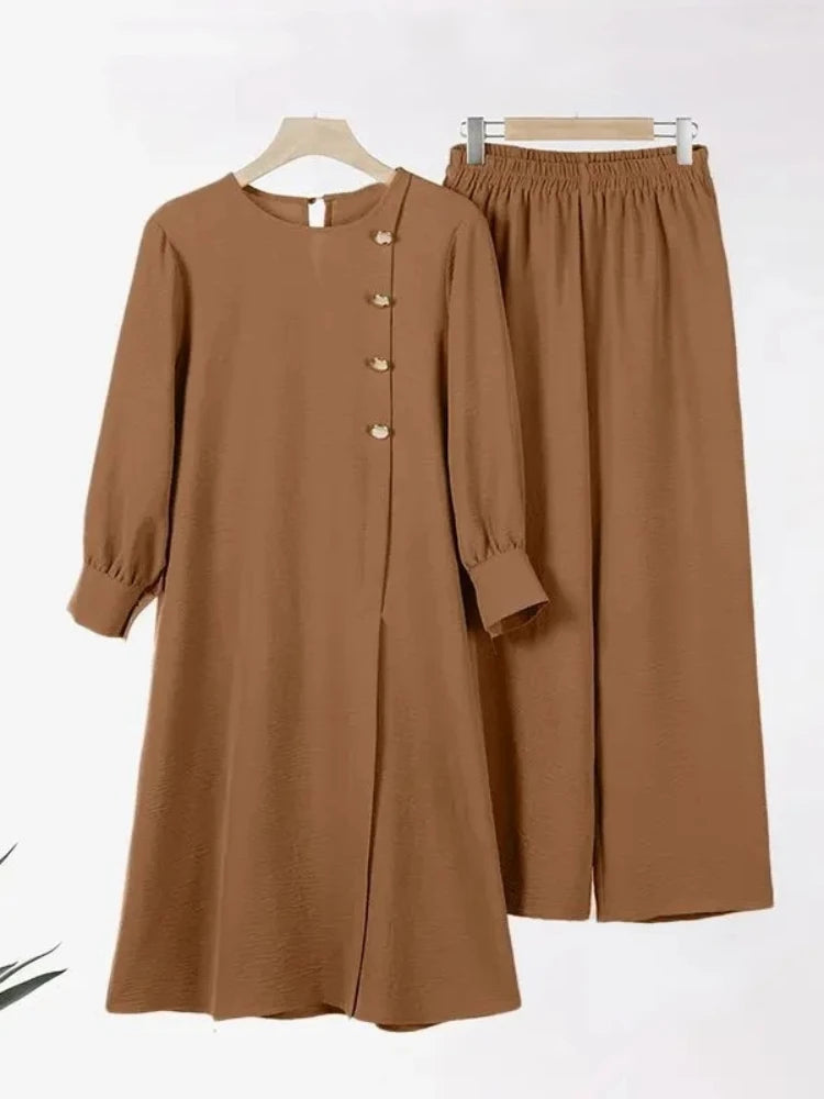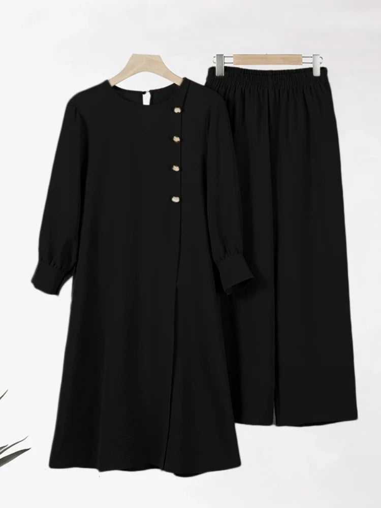 Ramadan Women Eid Muslim Two Pieces Set Split Blouse & Pant Musulman Ensemble Button Shirt Pants Matching Sets Femme Abaya 2024