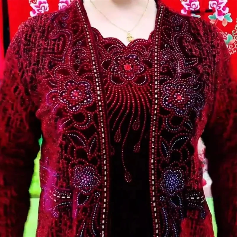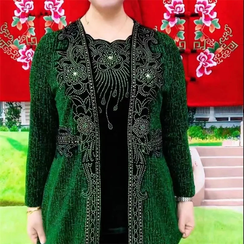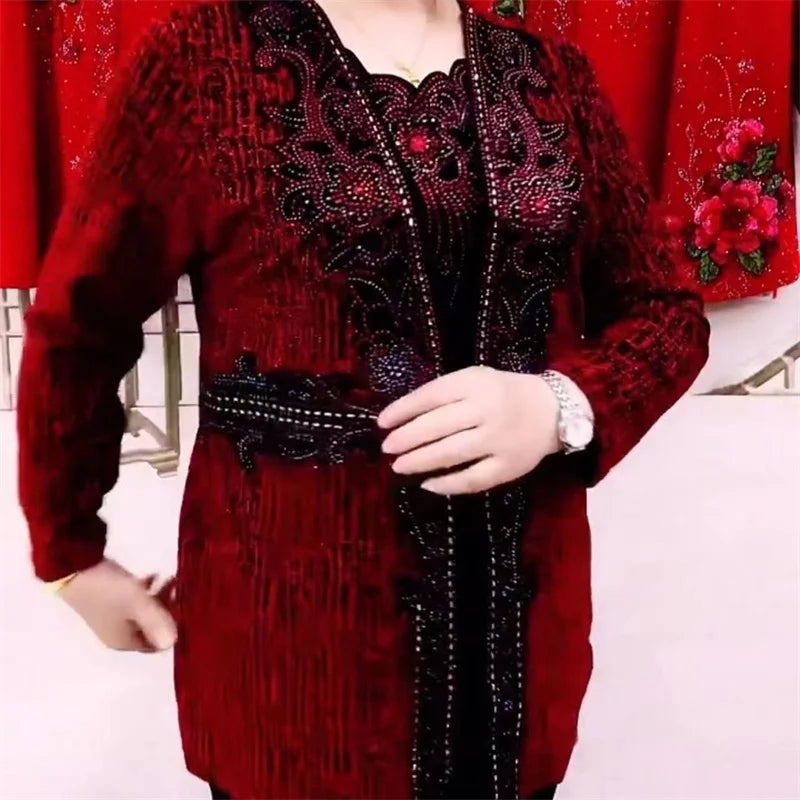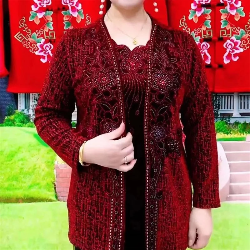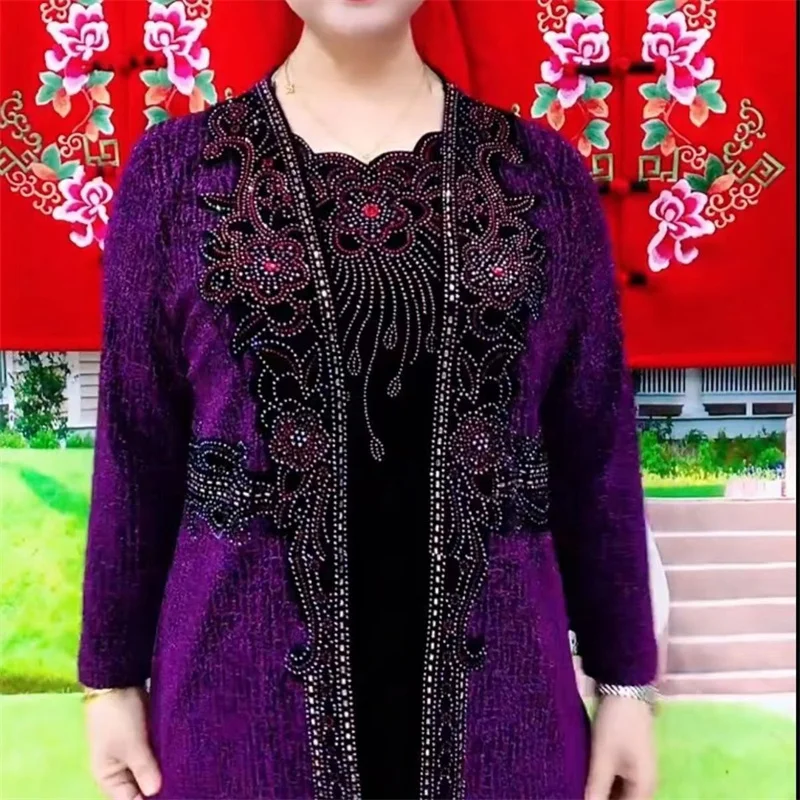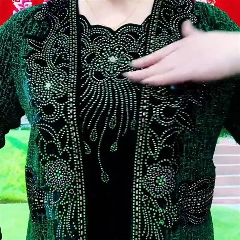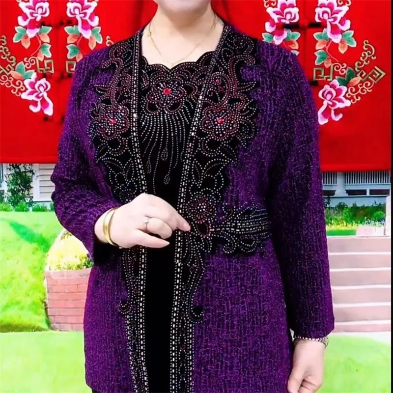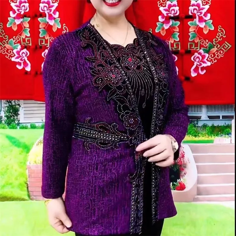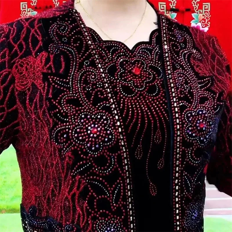 Spring Autumn New Mother's Fake Two piece T-shirts Large Size Embroidered O-Neck Women Shirts High End Hot Diamond Tees Tops