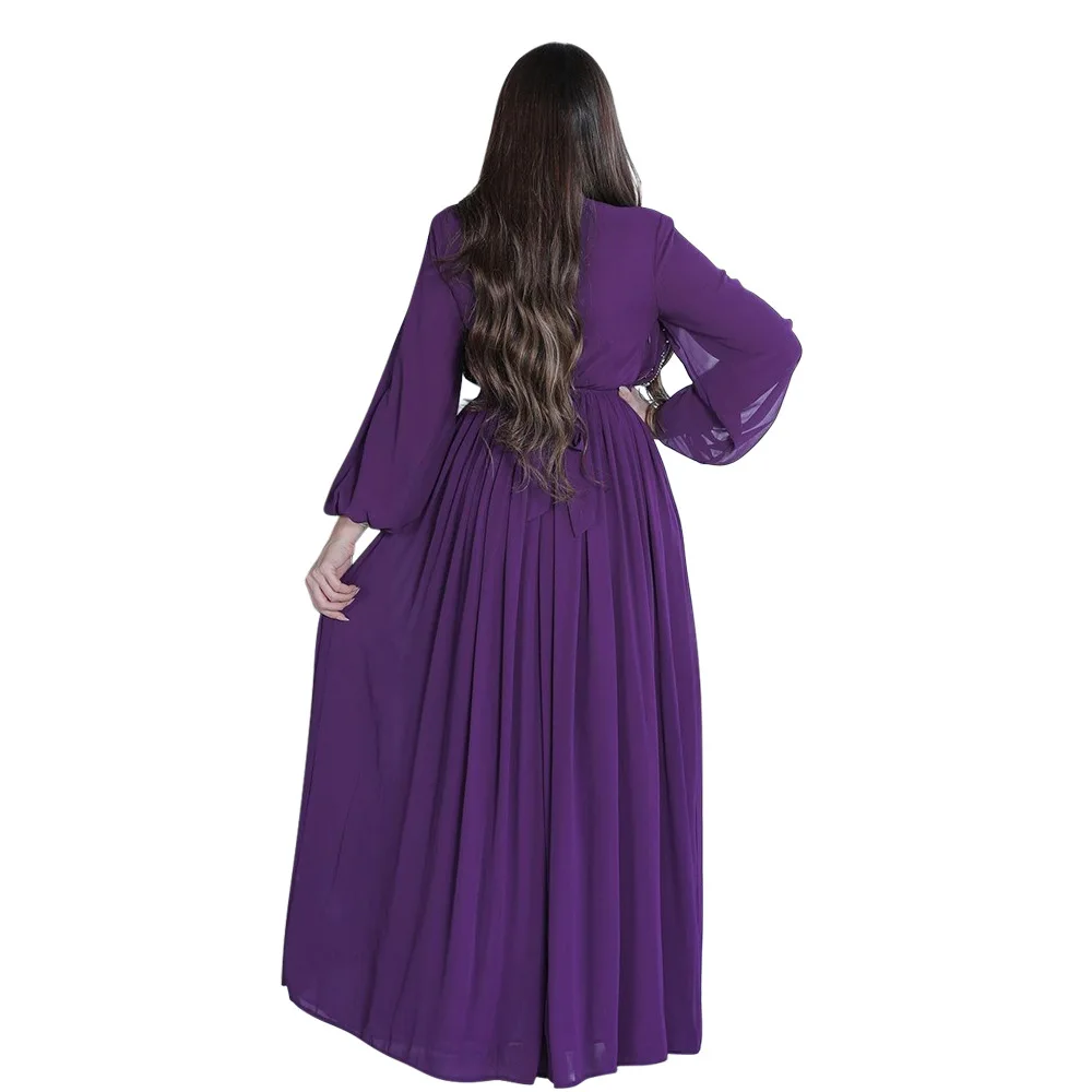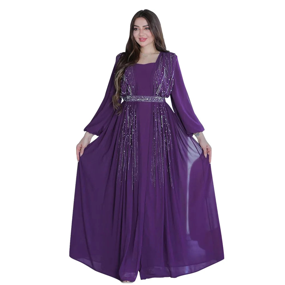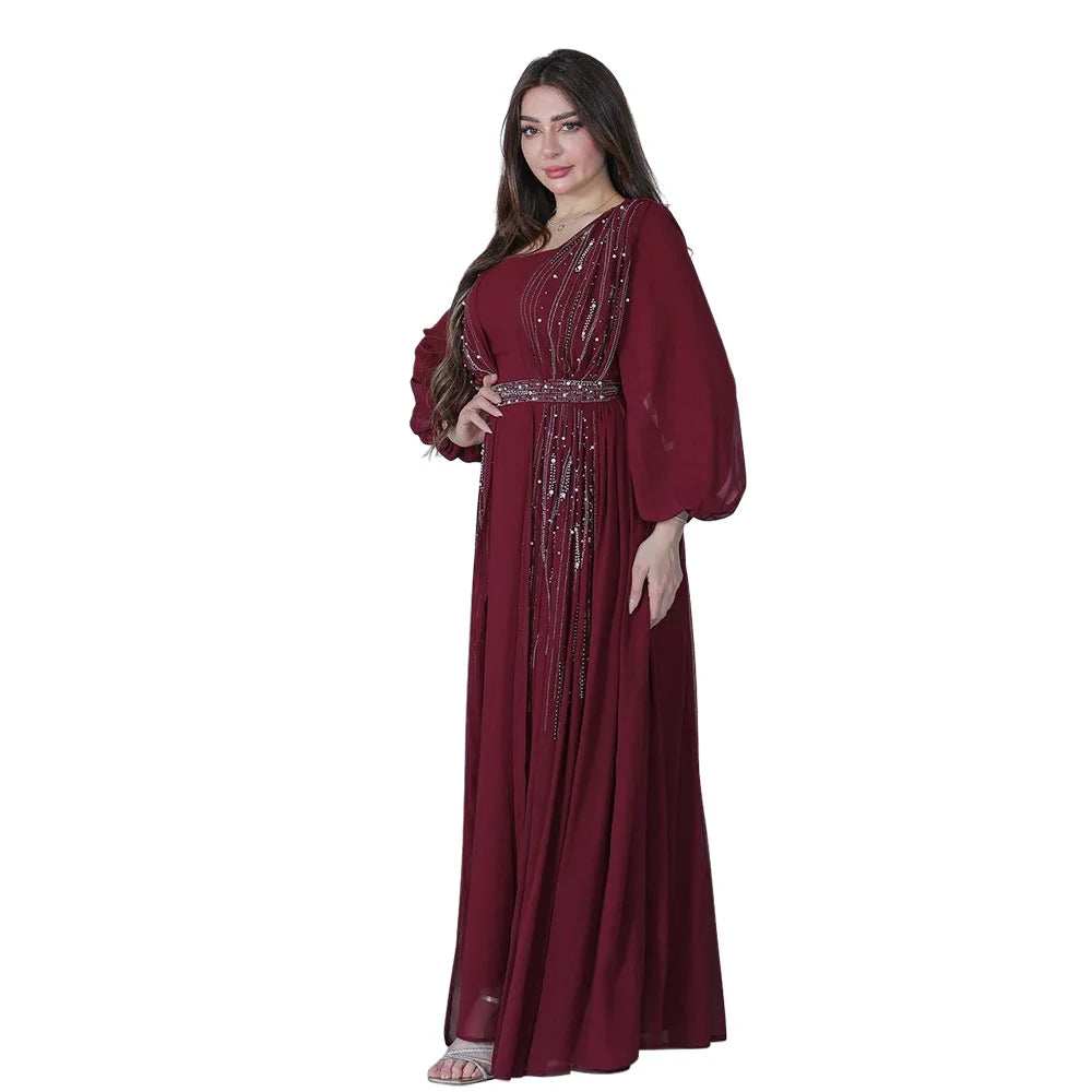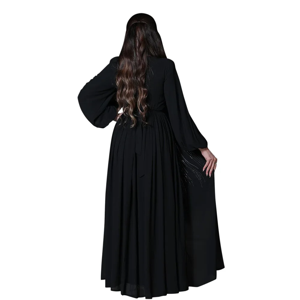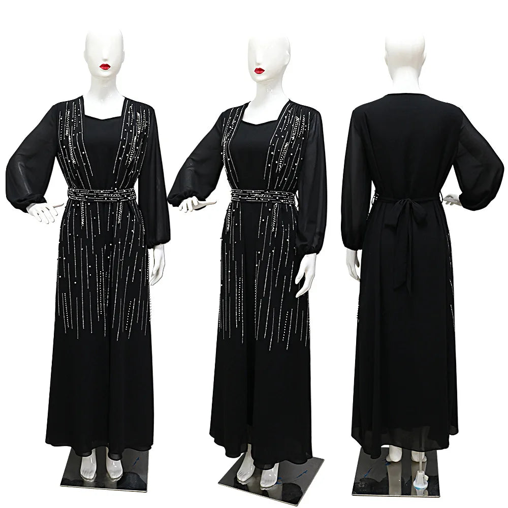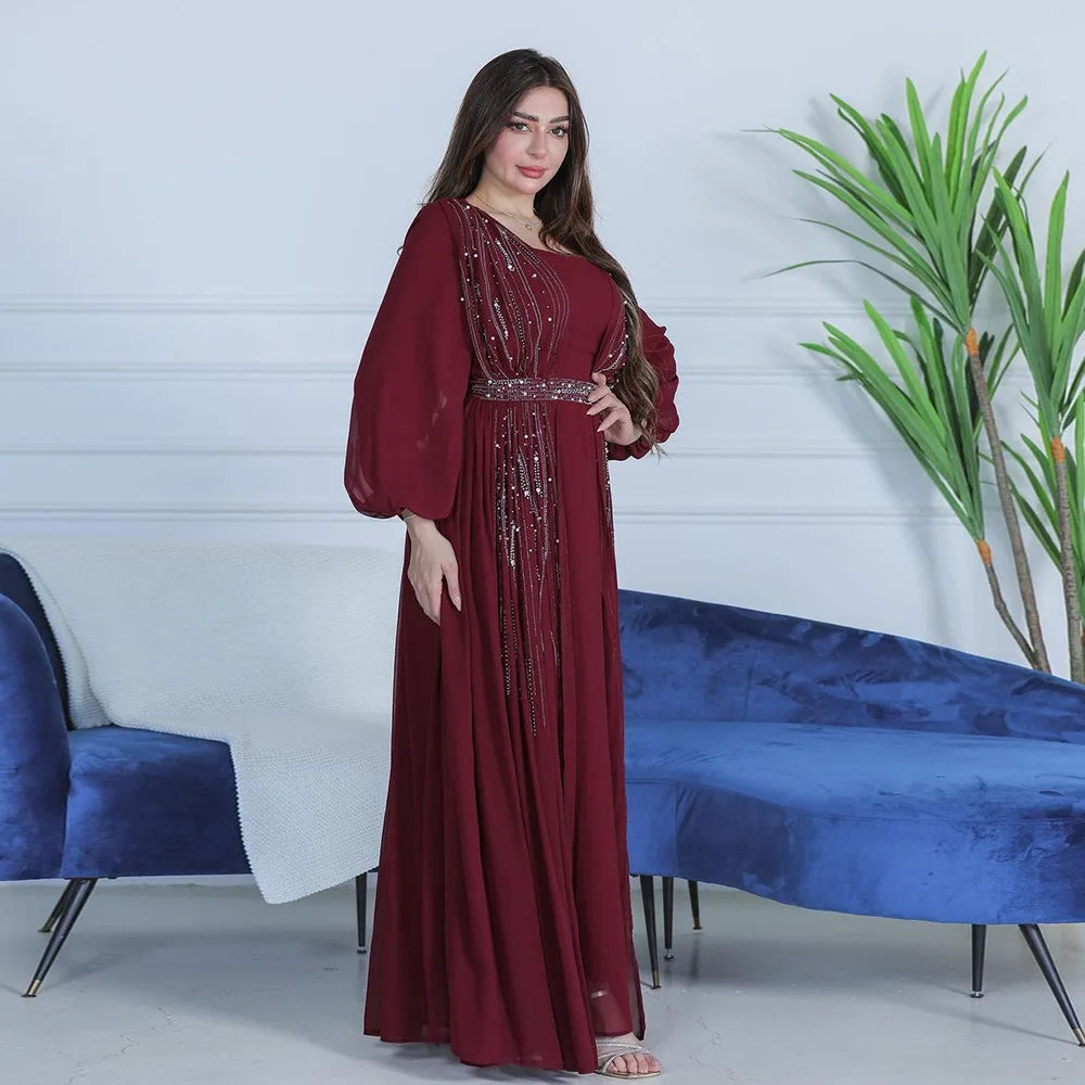 Women Long Loose Maxi Dress Muslim Dubai Women's Clothing Hot Diamond Belt Robe Dinner Dress
