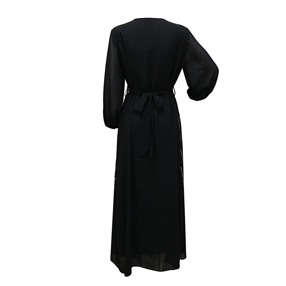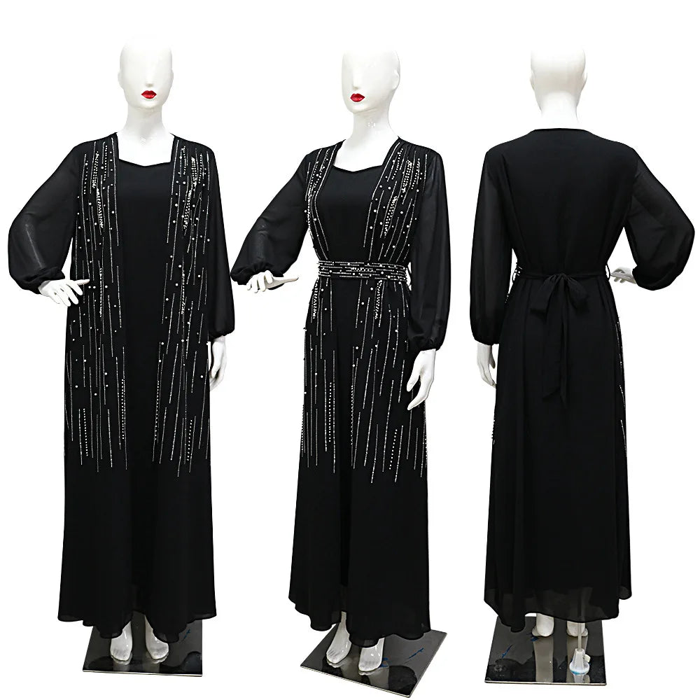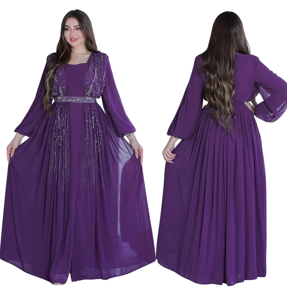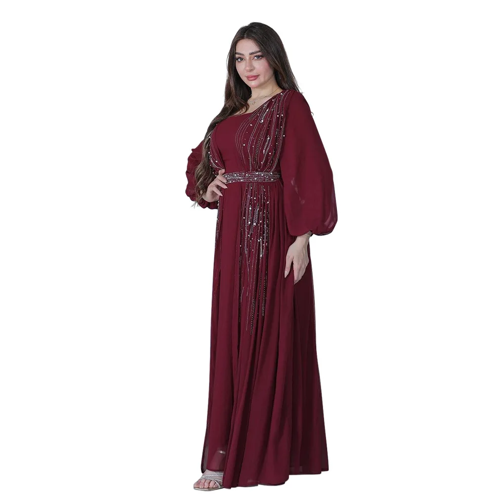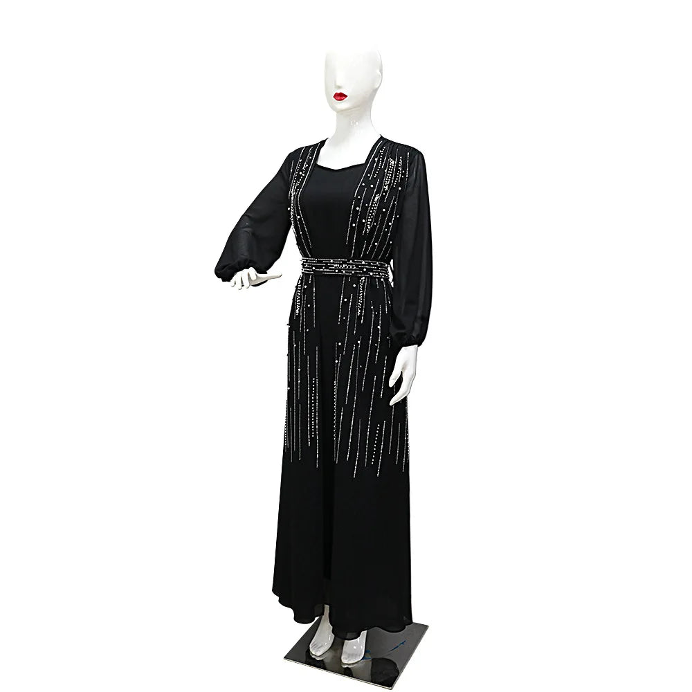 Women Long Loose Maxi Dress Muslim Dubai Women's Clothing Hot Diamond Belt Robe Dinner Dress
