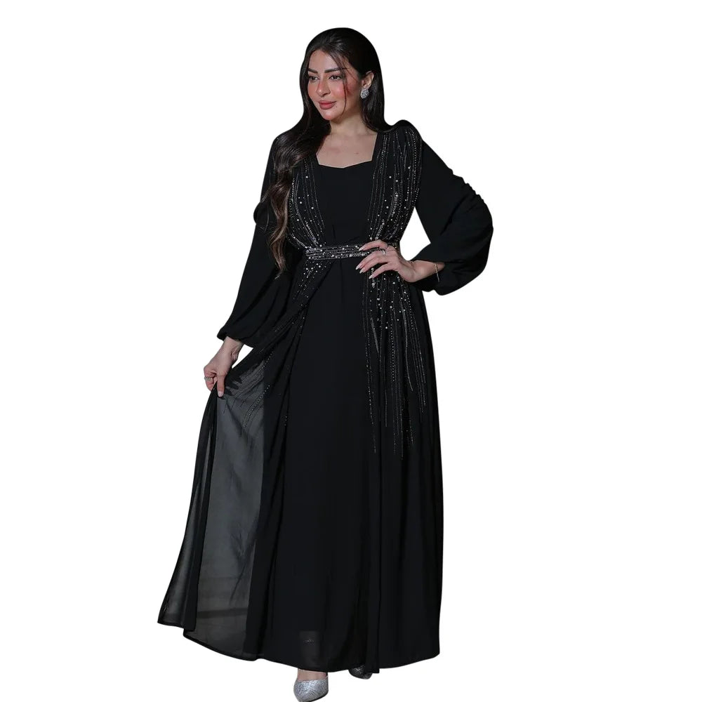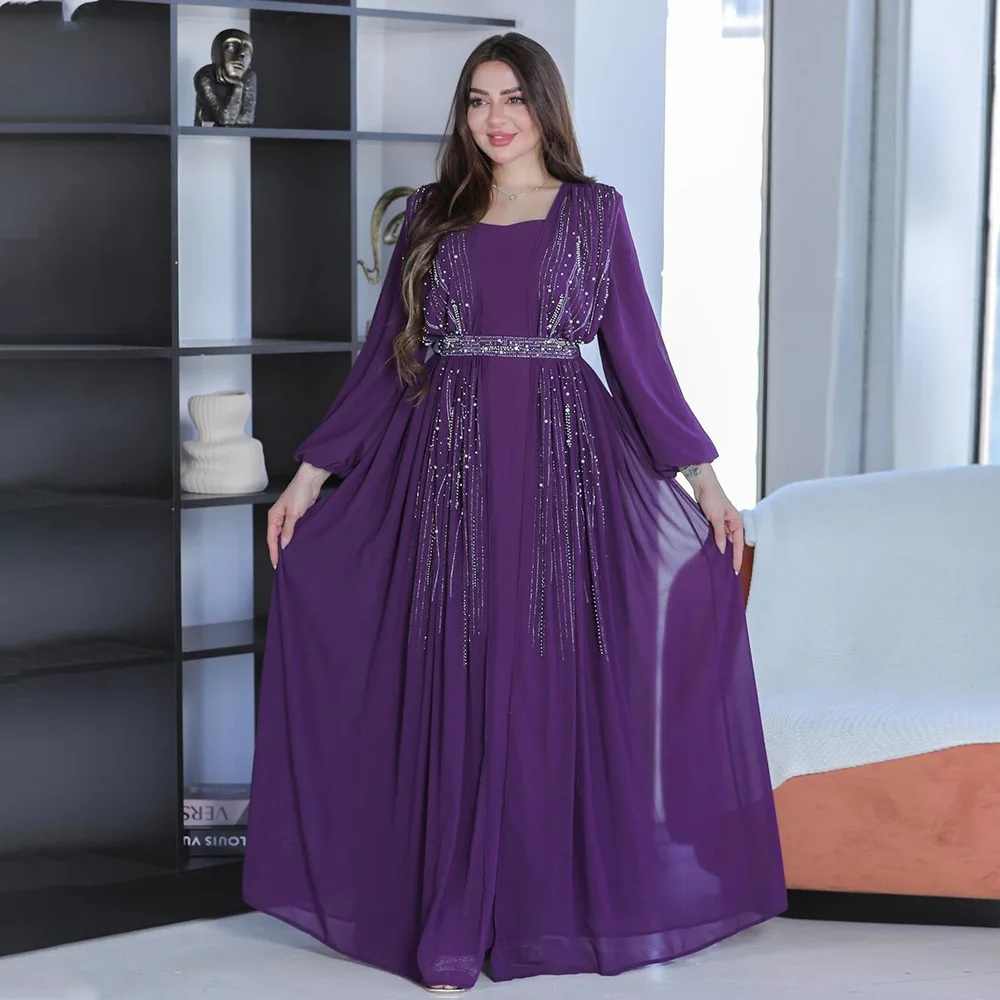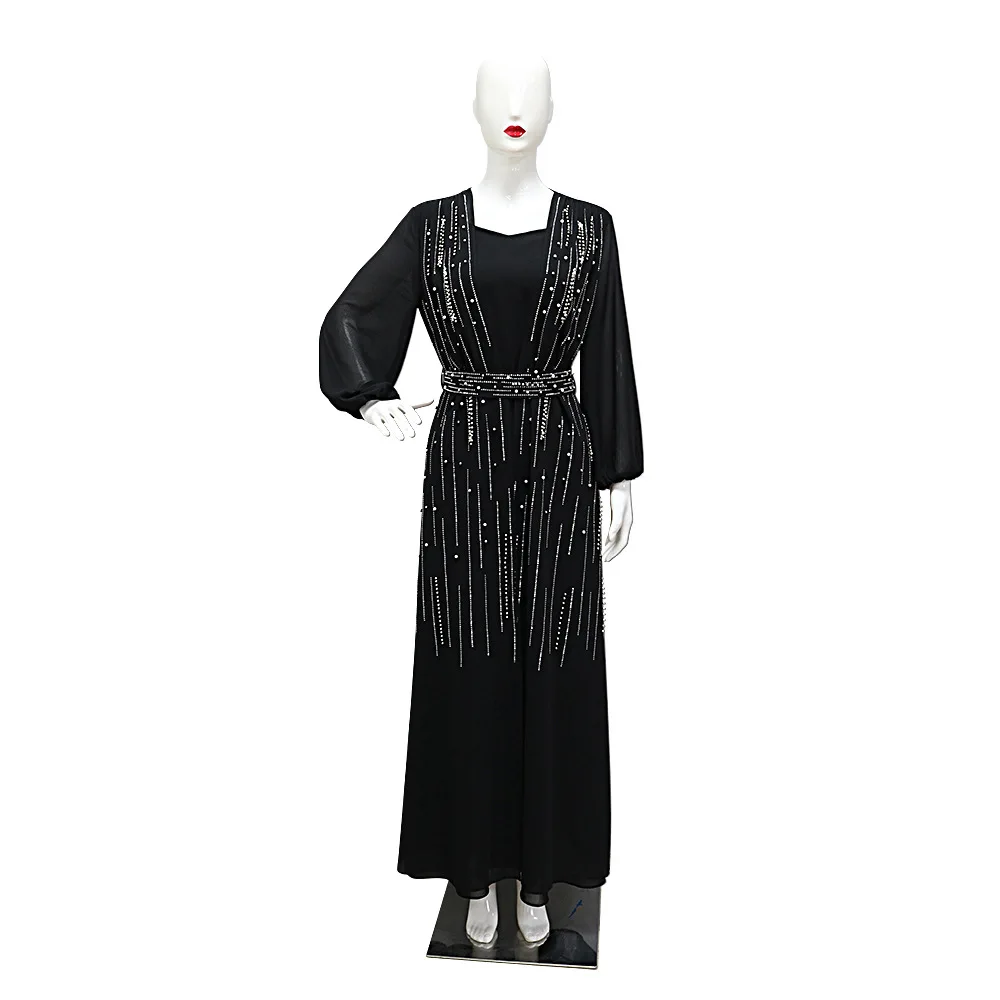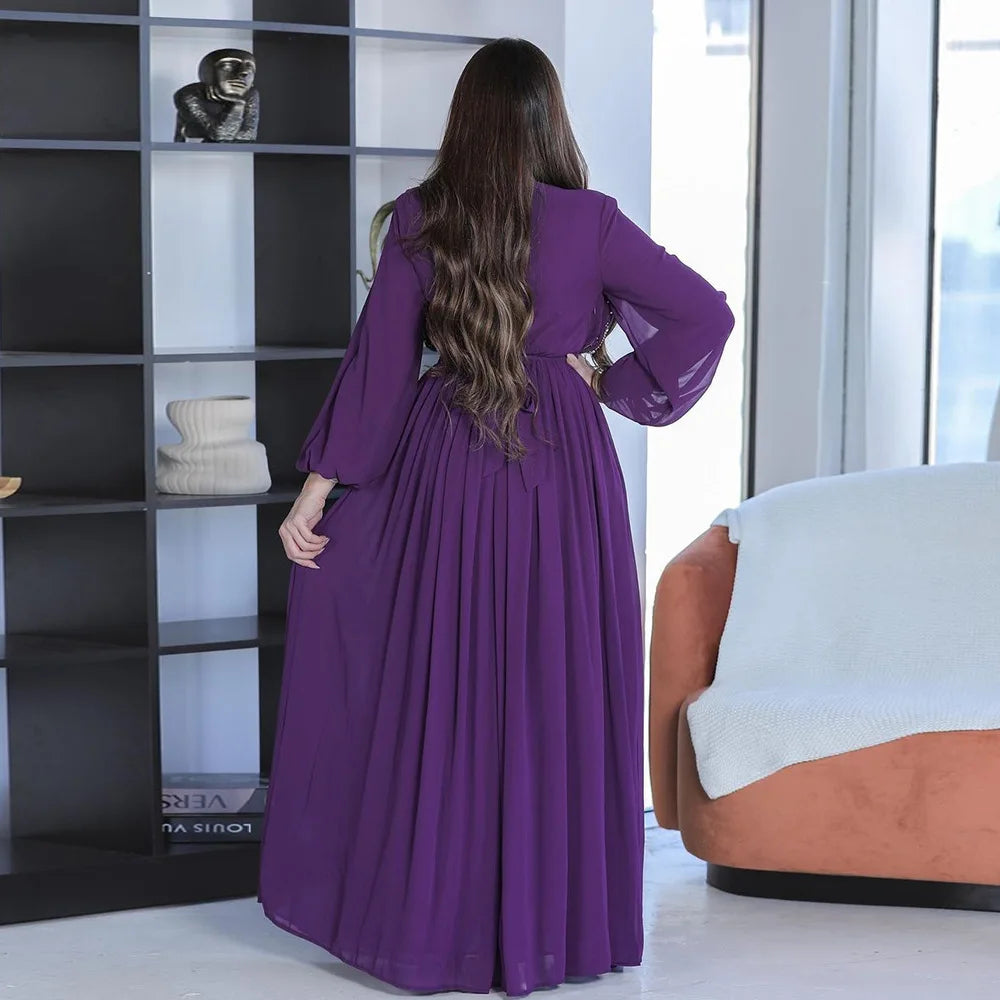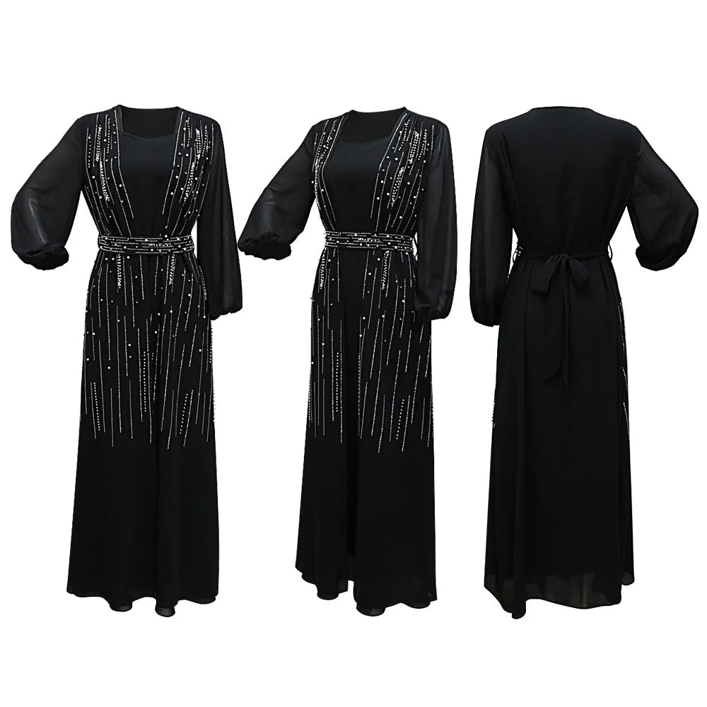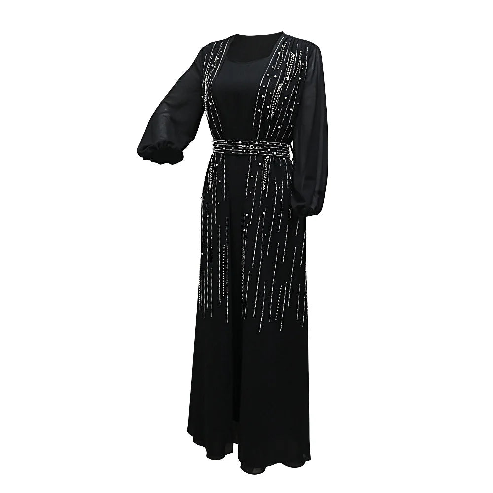 Women Long Loose Maxi Dress Muslim Dubai Women's Clothing Hot Diamond Belt Robe Dinner Dress